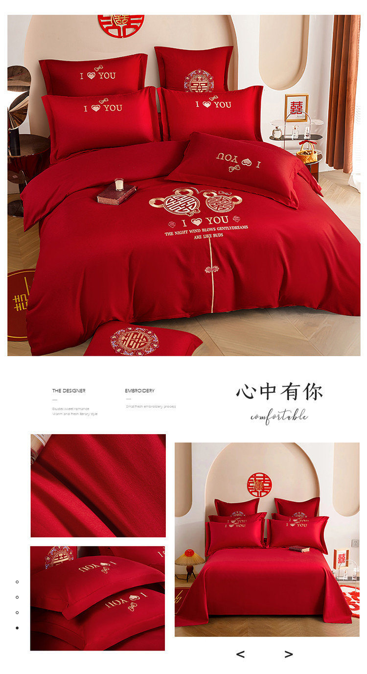 当前位置: 91家纺网 > 商品网购 > 床品套件 > 四件套 > 全棉普通四件套 > 玉雅家纺 2025新款亲肤棉刺绣婚庆四件套 心中有你
