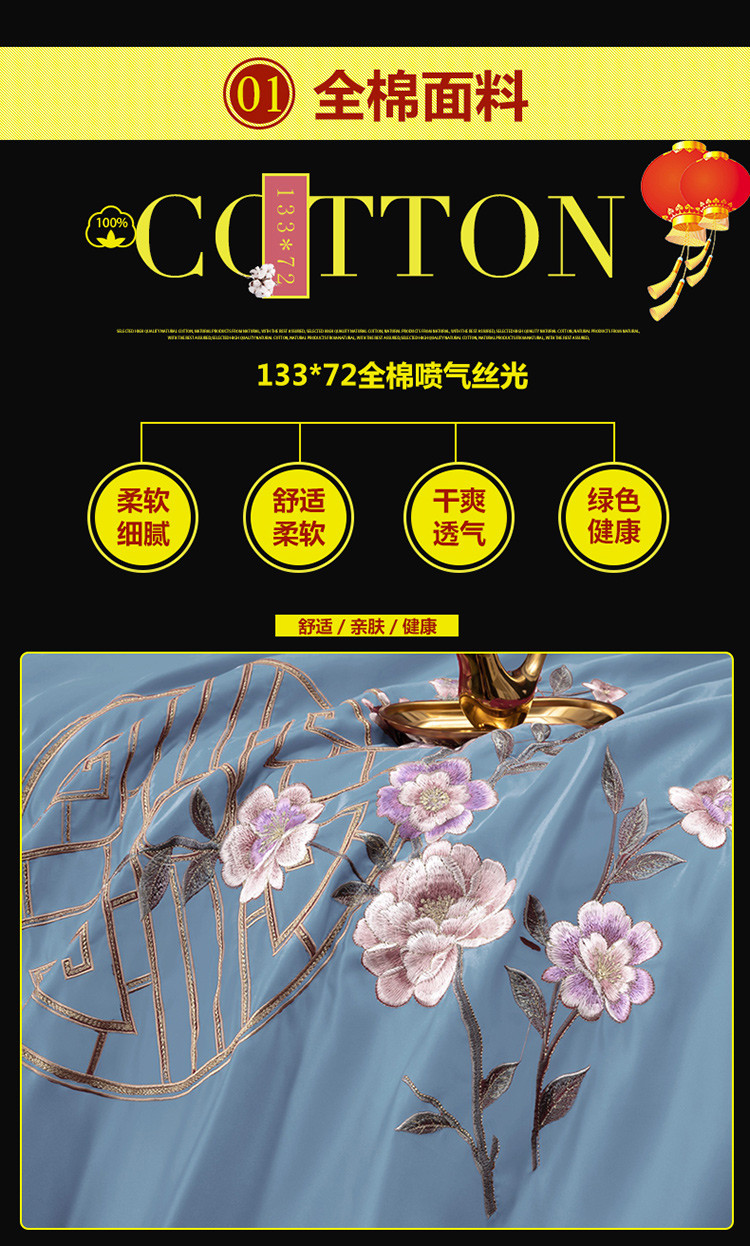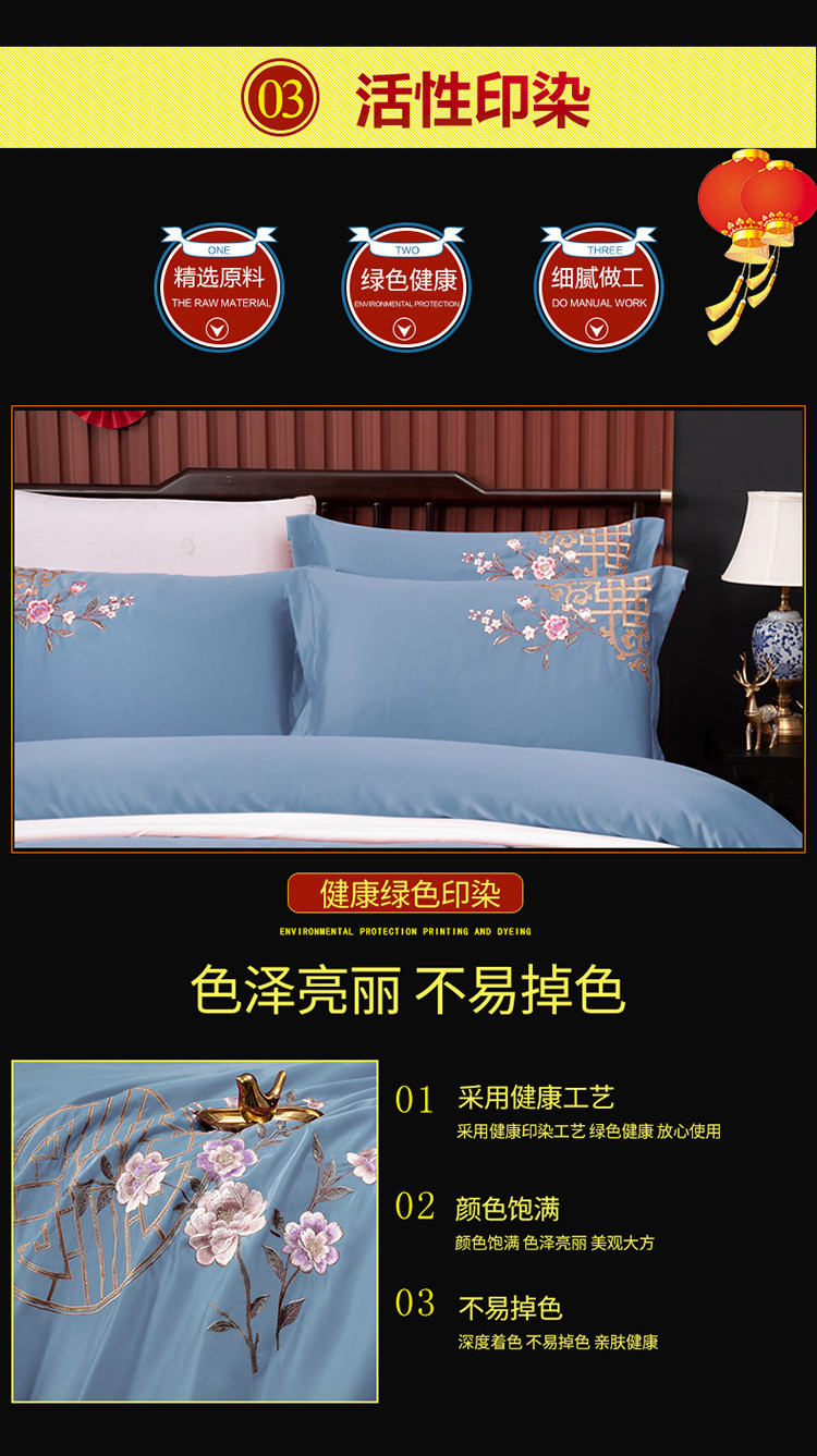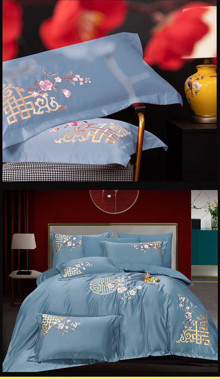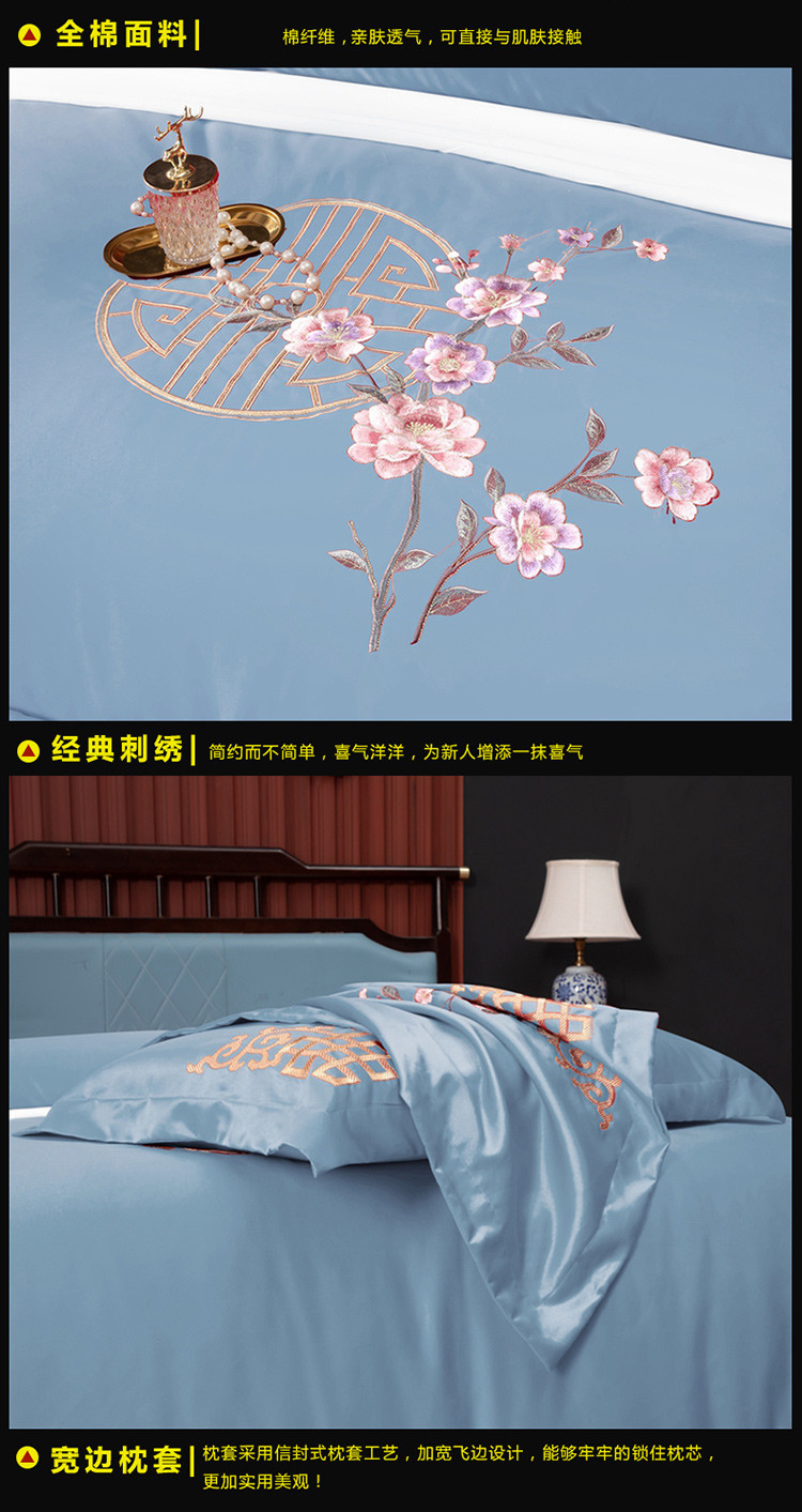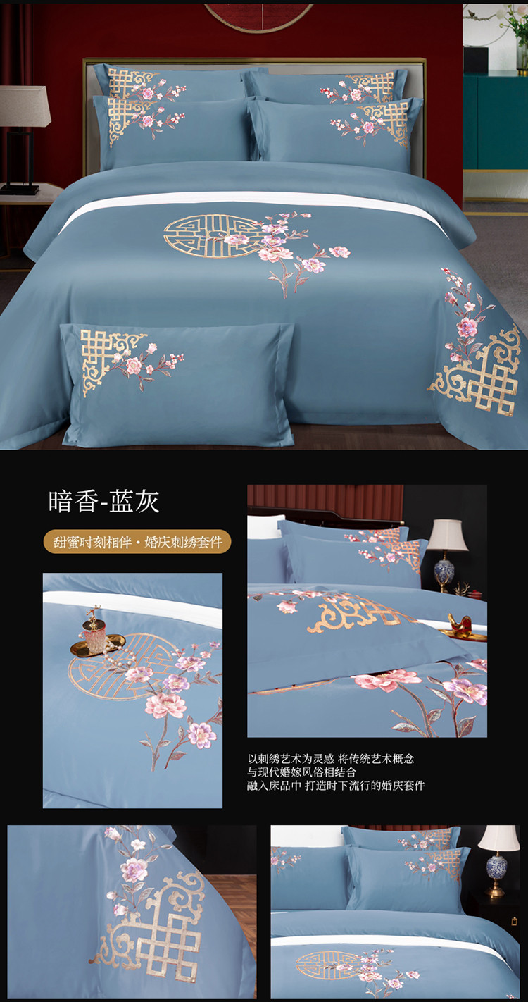 商品名称:慕她婚庆四件套大红色结婚全棉纯棉刺绣花多件套直播 暗香蓝灰