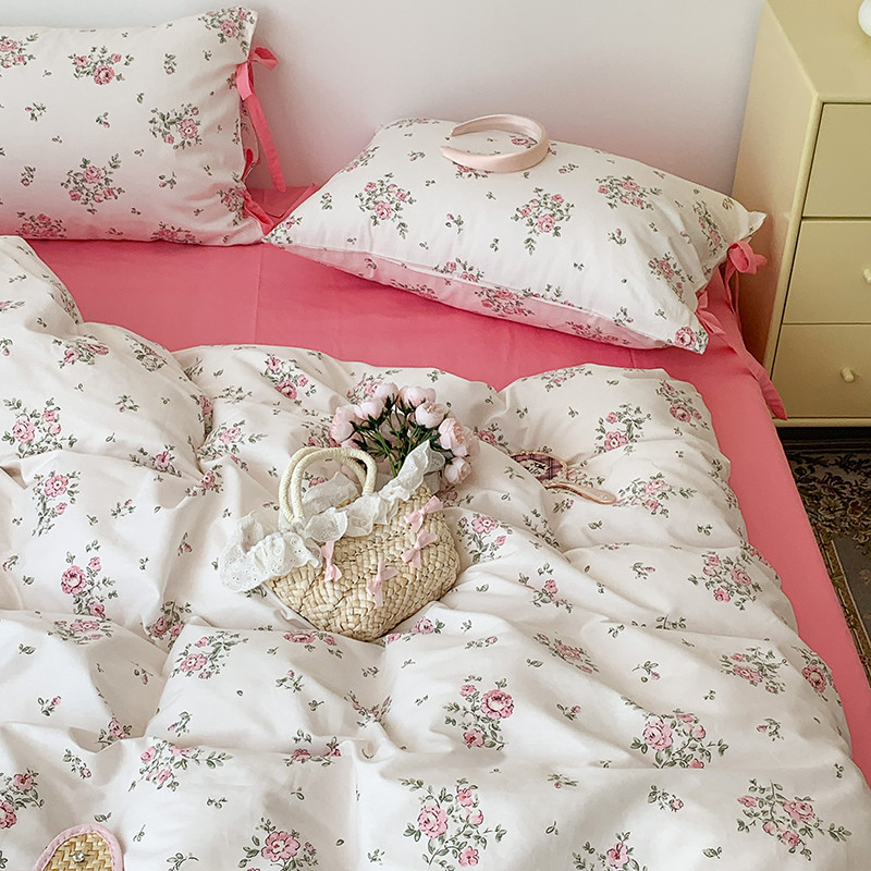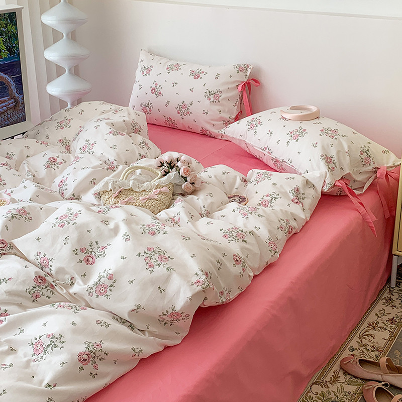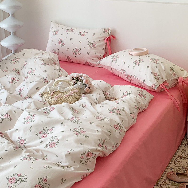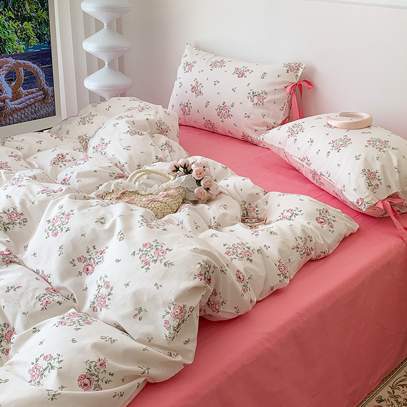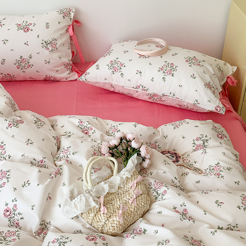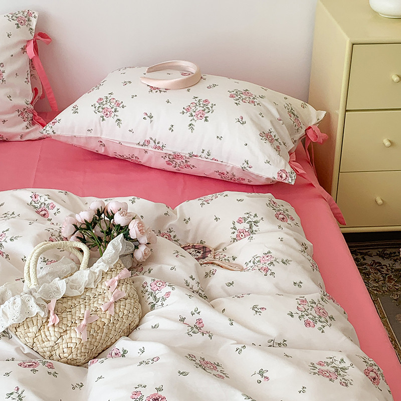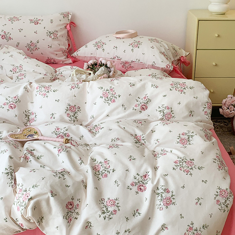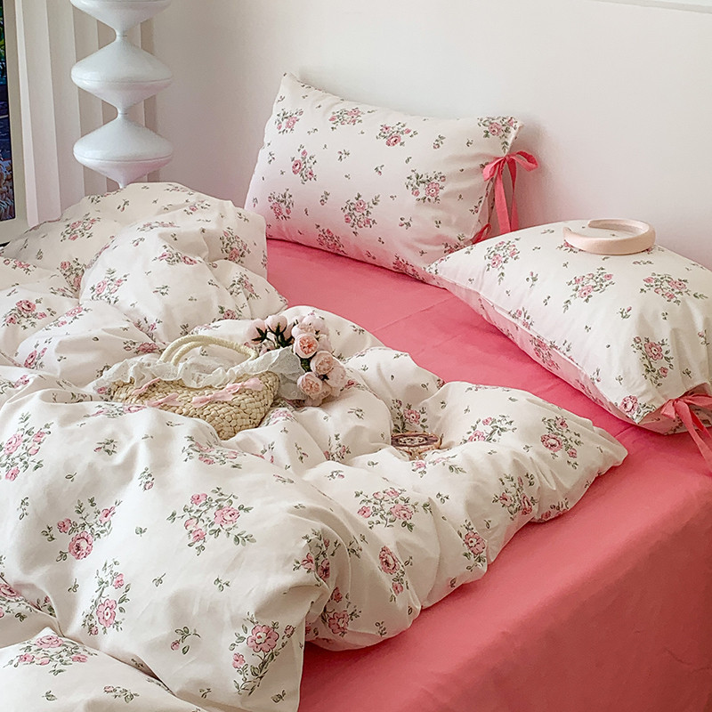 昔可家纺 2023新款全棉蝴蝶结枕套普通款四件套 初恋蔷薇