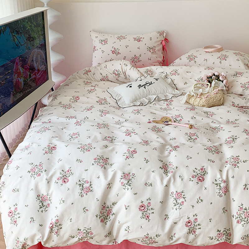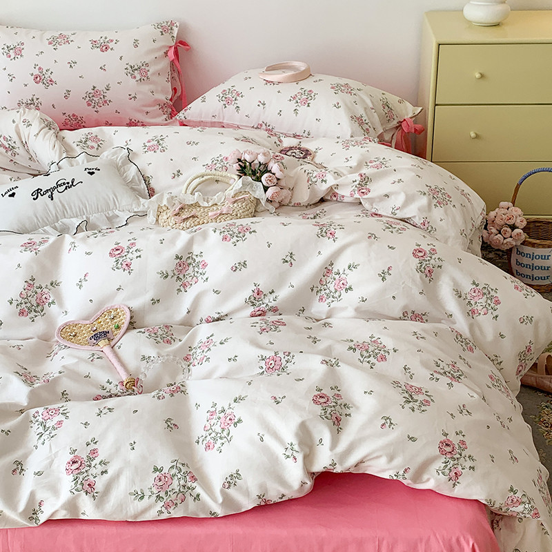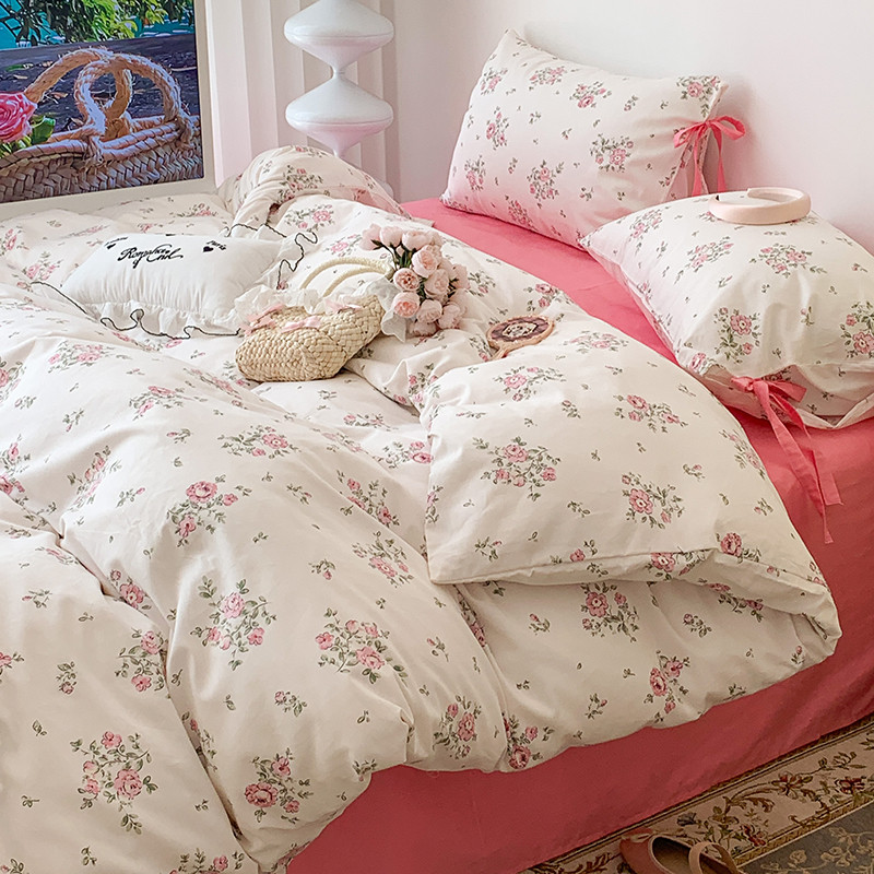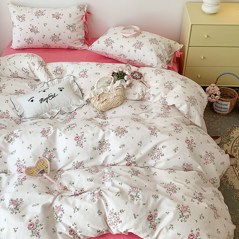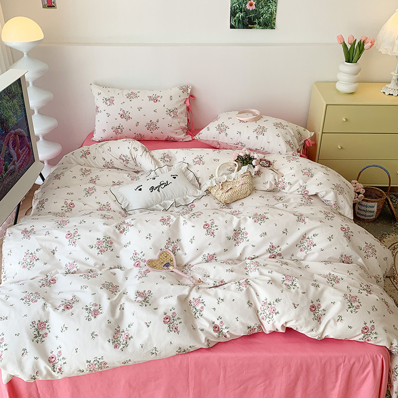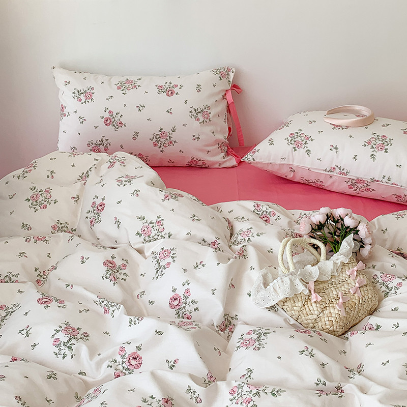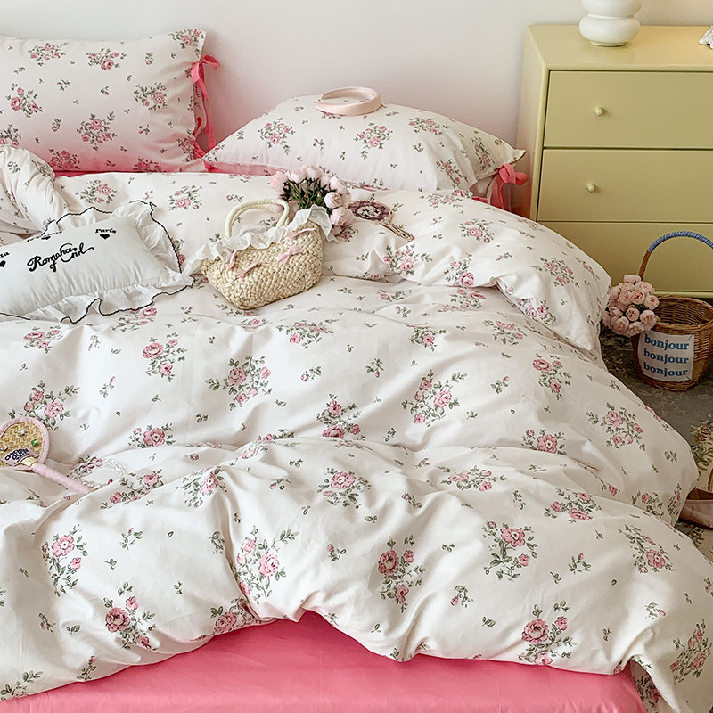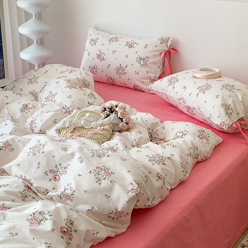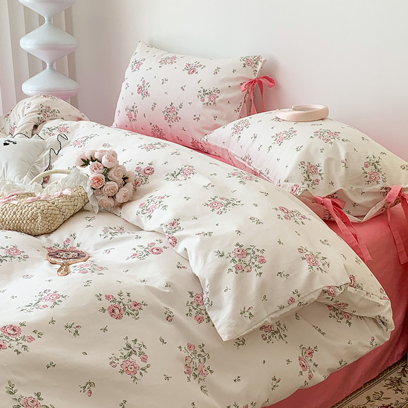 昔可家纺 2023新款全棉蝴蝶结枕套普通款四件套 初恋蔷薇