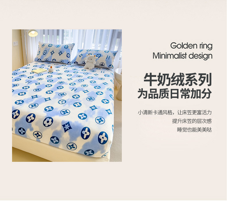 • 91家纺网 家纺一手货源 找家纺 芃成家纺 2023新款牛奶绒印花床笠 心动