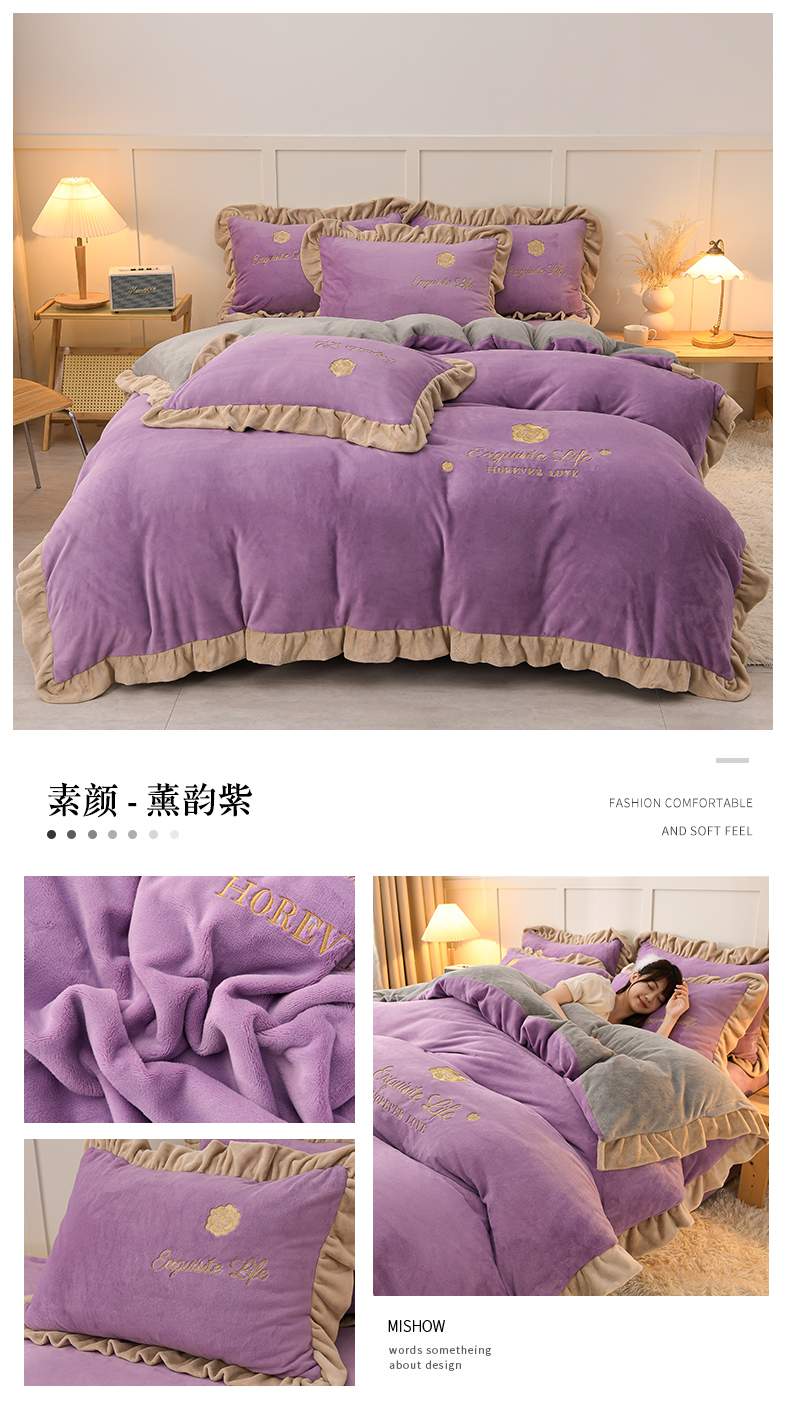 商品名称:氧家 2025款韩版纯色双层花边加厚牛奶绒四件套 素颜-熏韵紫