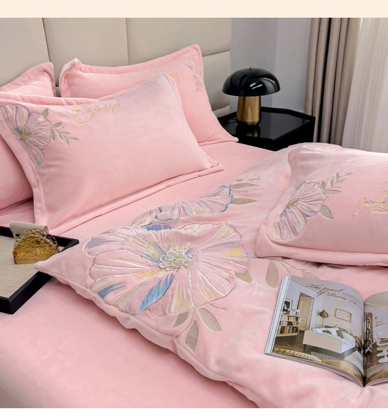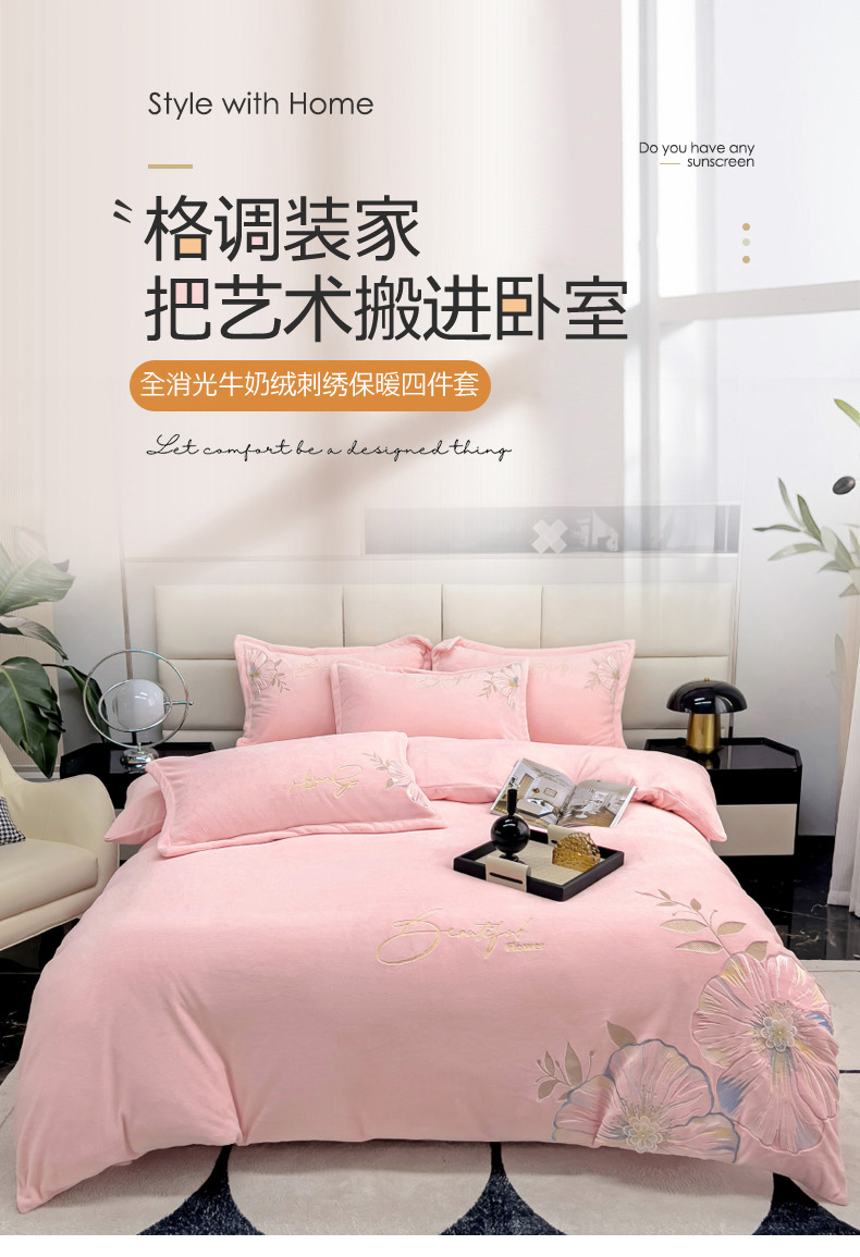 (总)星尚家纺 2024新款全消光230g牛奶绒刺绣保暖四件套-花漾,晨雾绿,豆沙粉,樱花粉