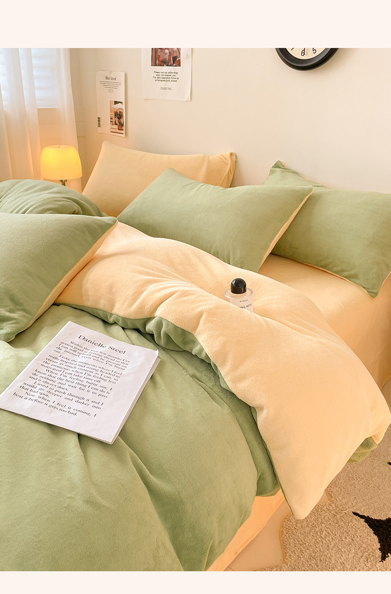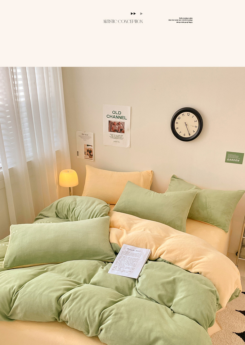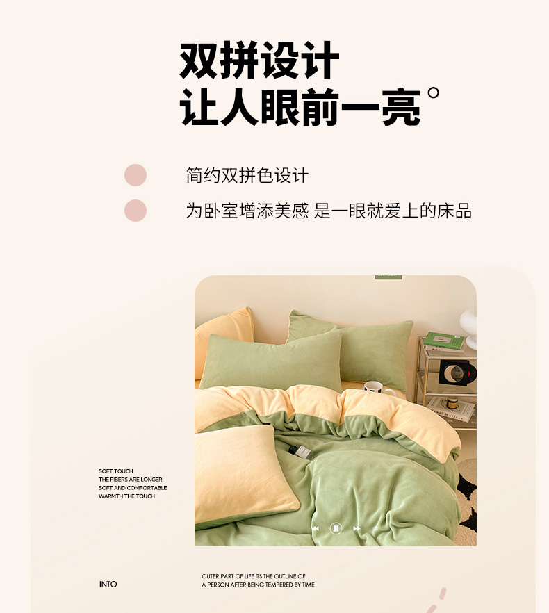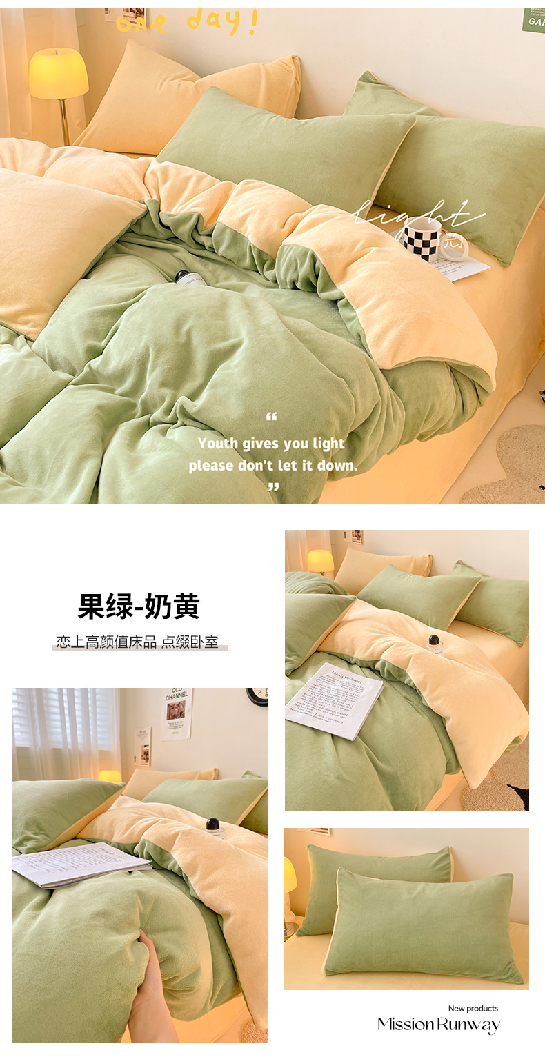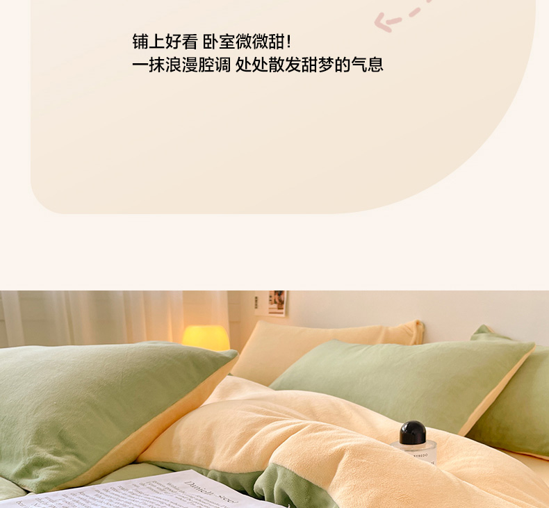 当前位置: 91家纺网 > 商品网购 > 床品套件 > 四件套 > 牛奶绒四件套 > 眠帛家居 2023新款加厚牛奶绒双拼四件套 果绿-奶黄