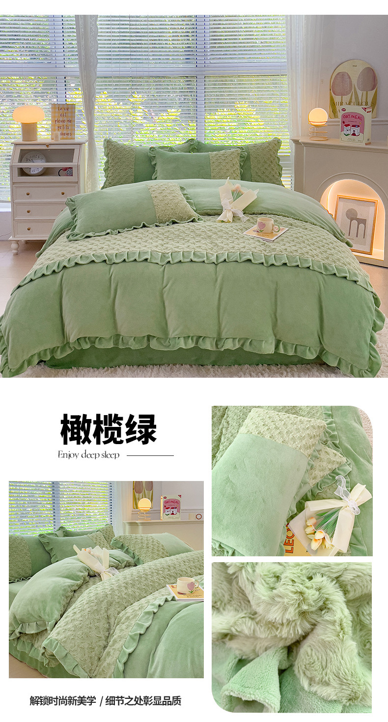 商品名称:金米诺 2024新款加厚保暖韩式双层花边玫瑰兔绒系列四件套 橄榄绿