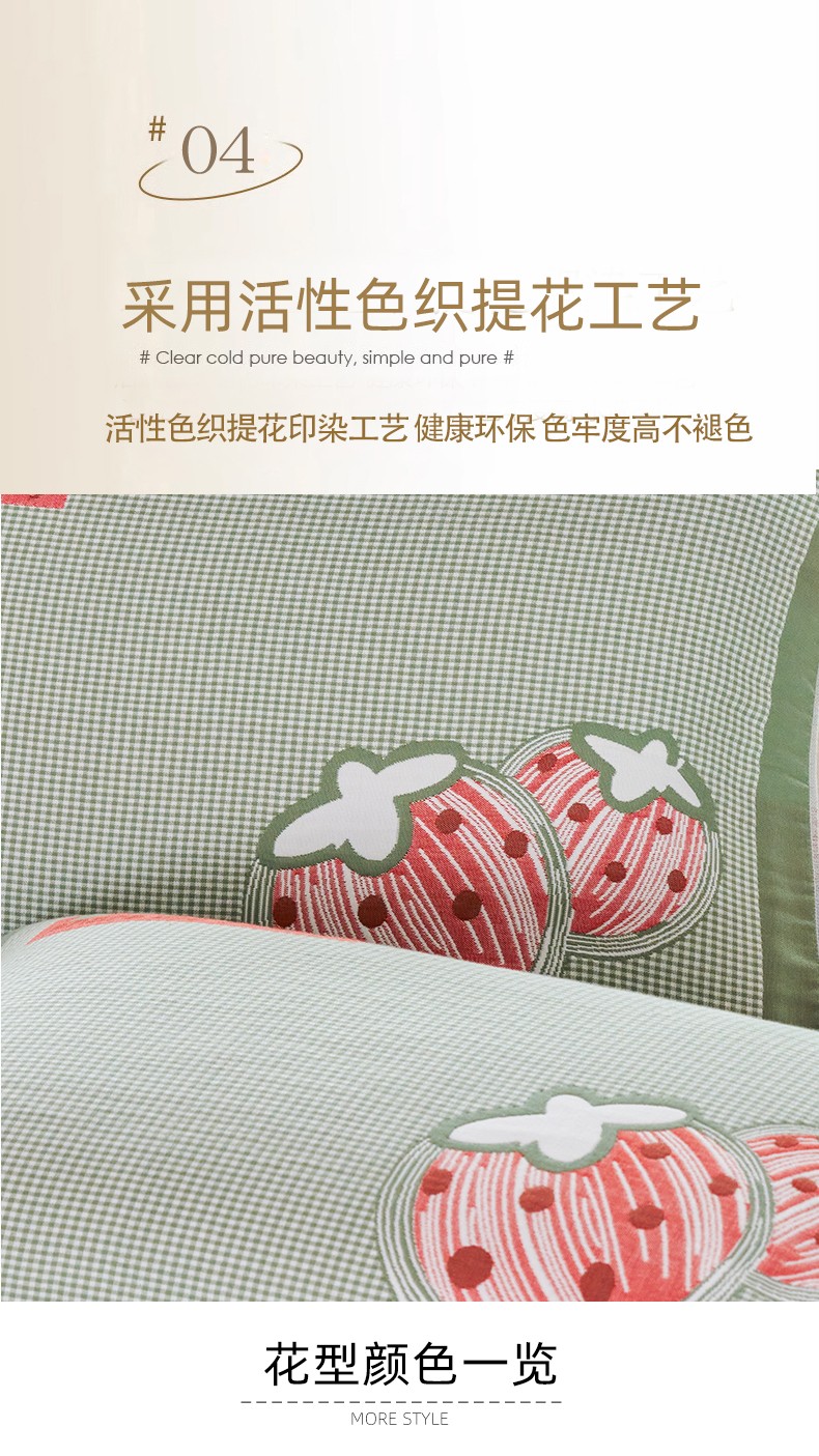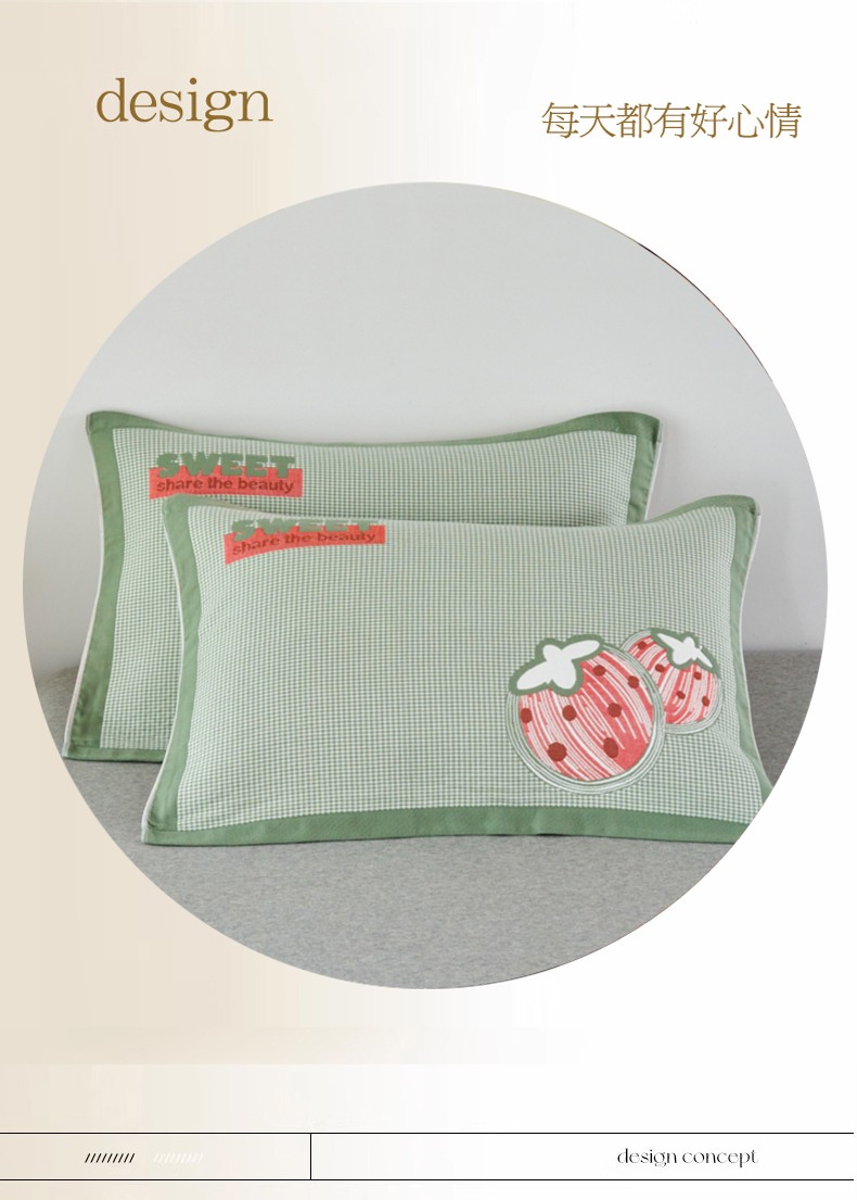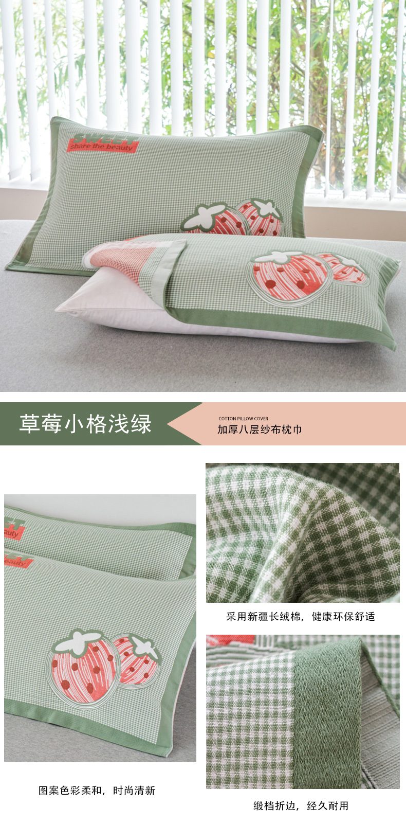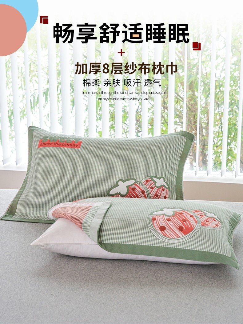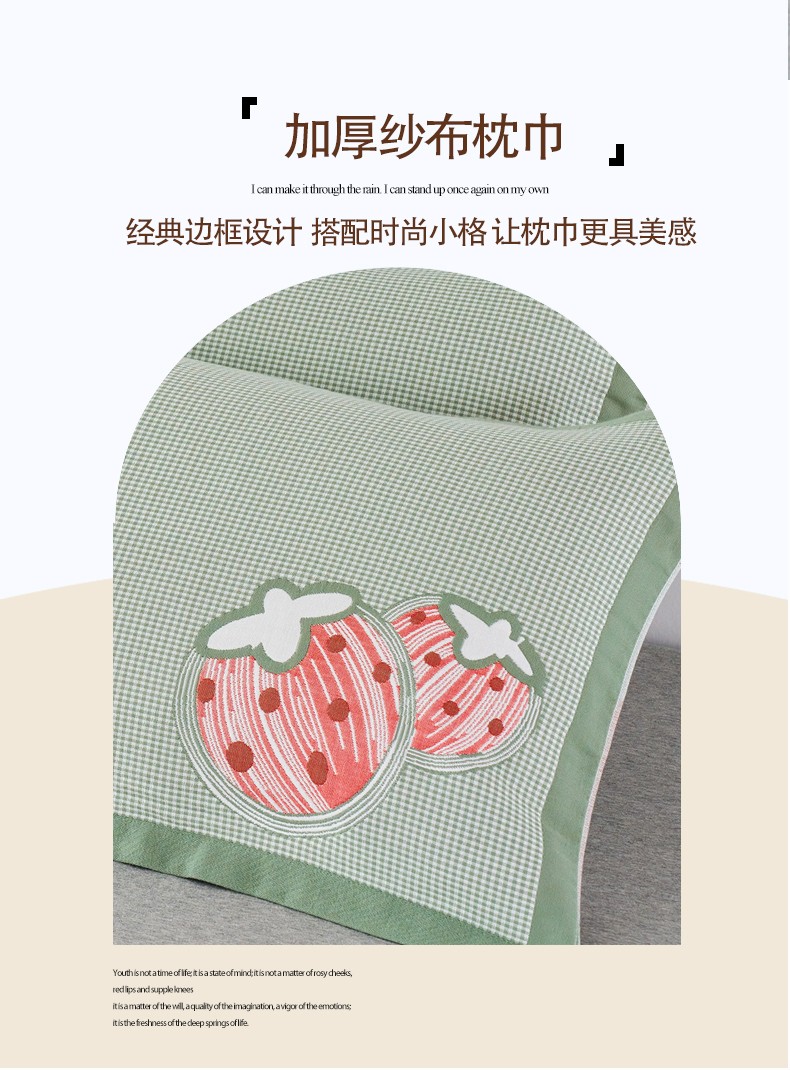 商品名称:棠薇2023新款加厚八层纯棉纱布枕巾一对装小清新小格子系列全棉枕头盖巾 草莓小格浅绿52*78±2cm