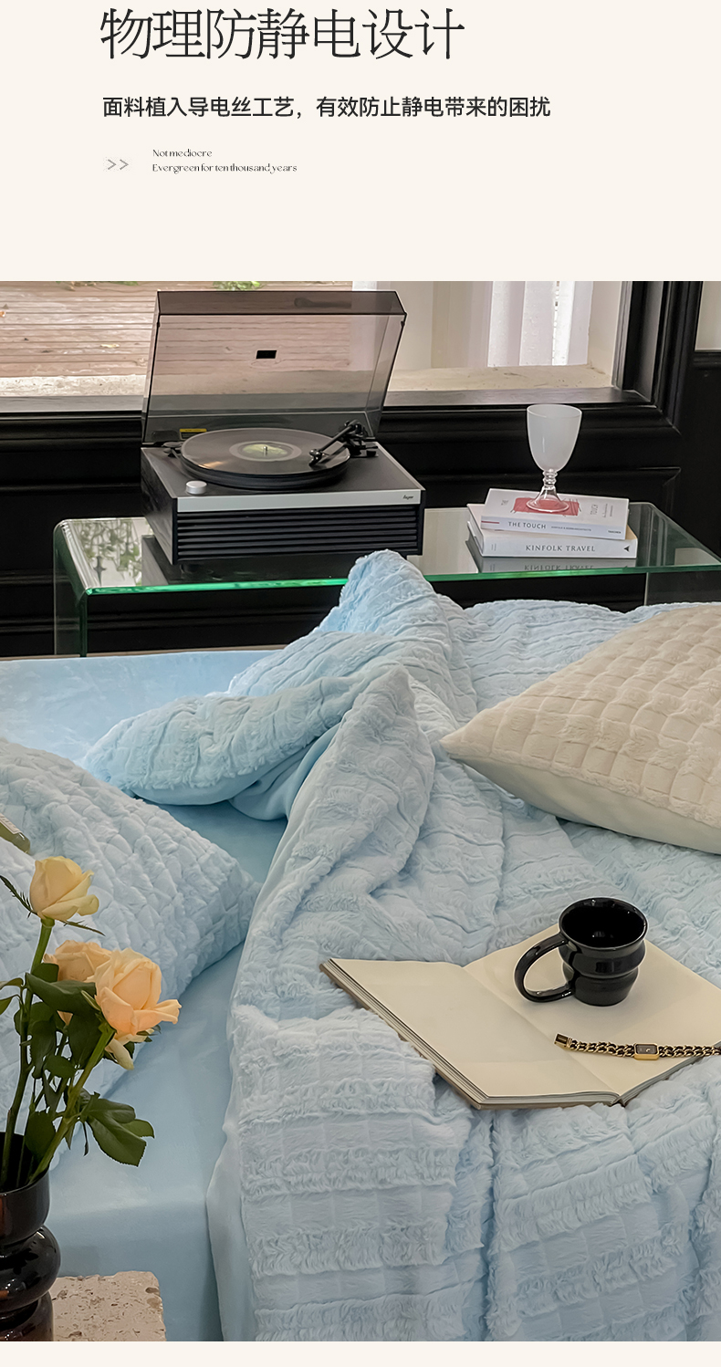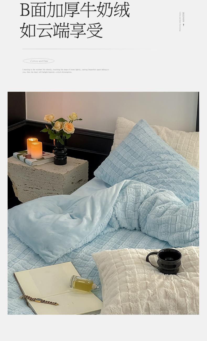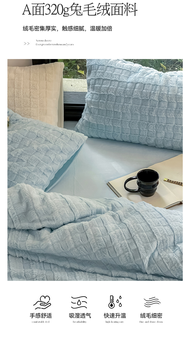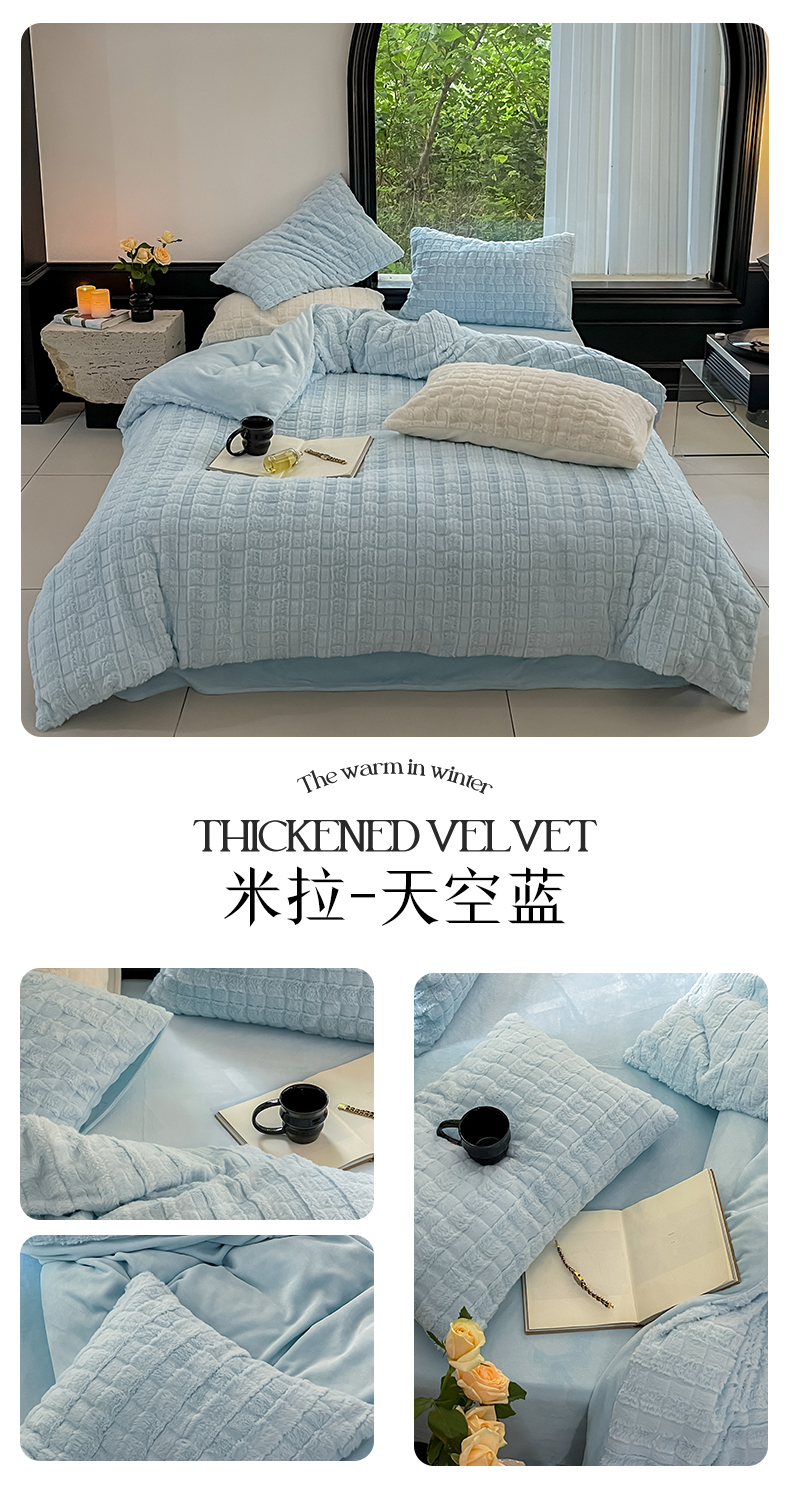 商品名称:名品优仓 2023新款A面兔毛绒B面牛奶绒系列四件套 米拉-天空蓝