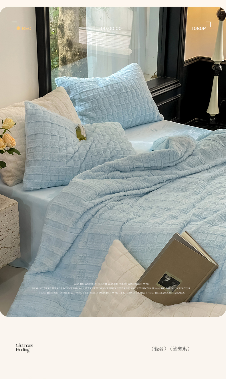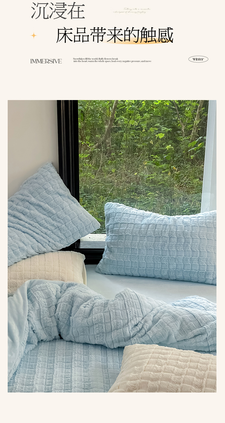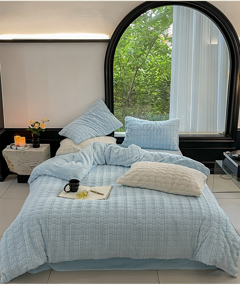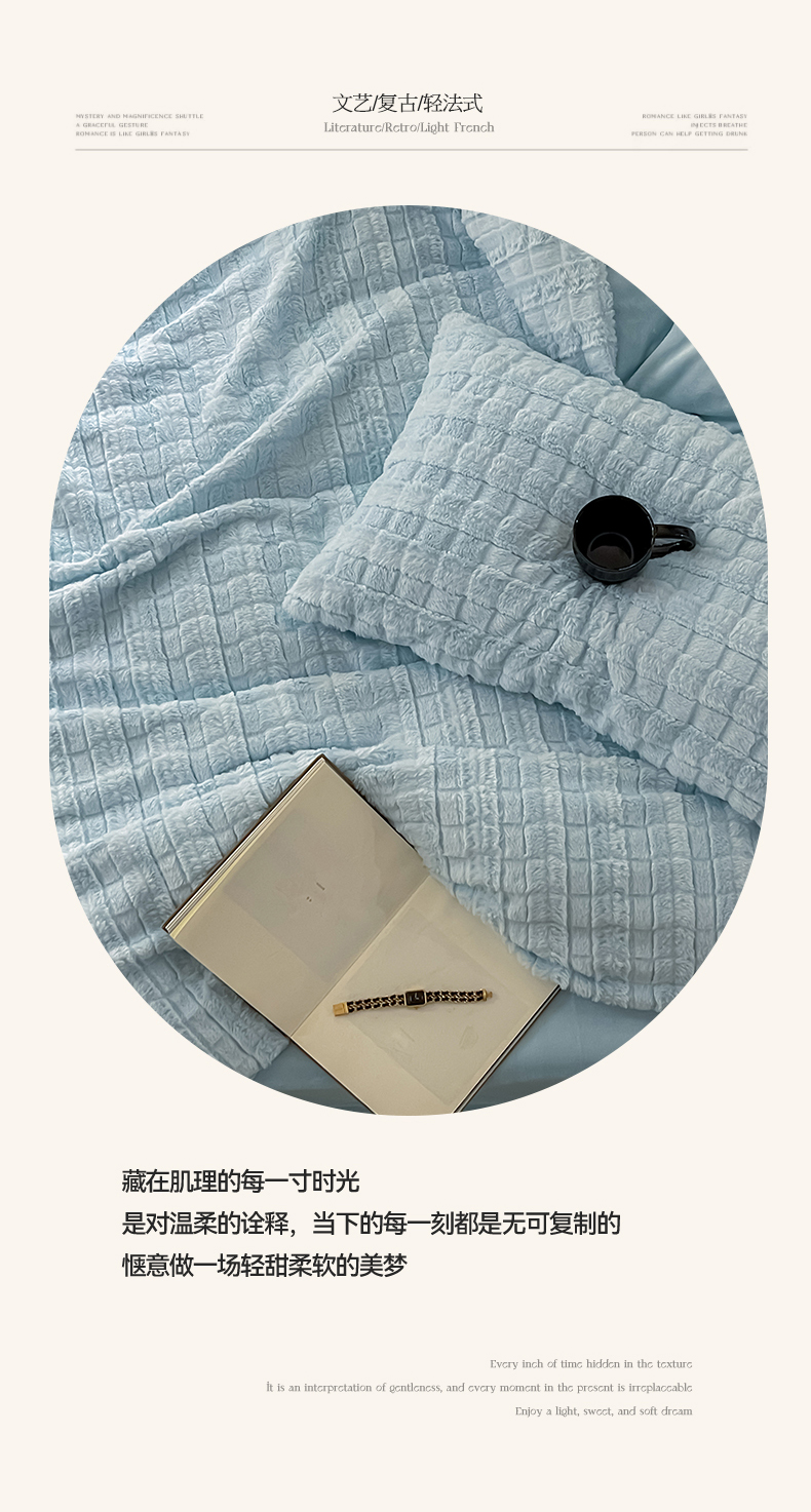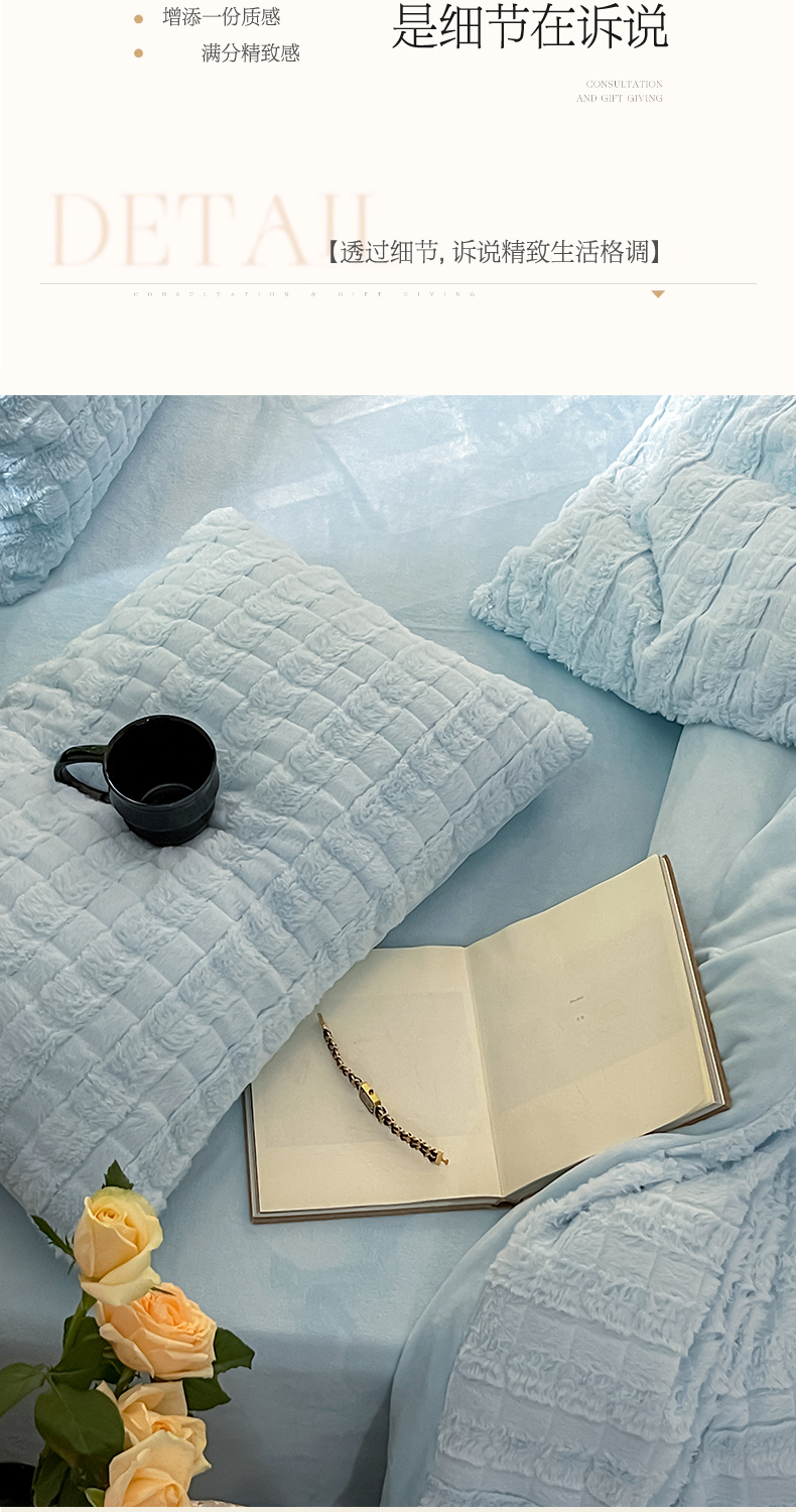 商品名称:名品优仓 2023新款A面兔毛绒B面牛奶绒系列四件套 米拉-天空蓝