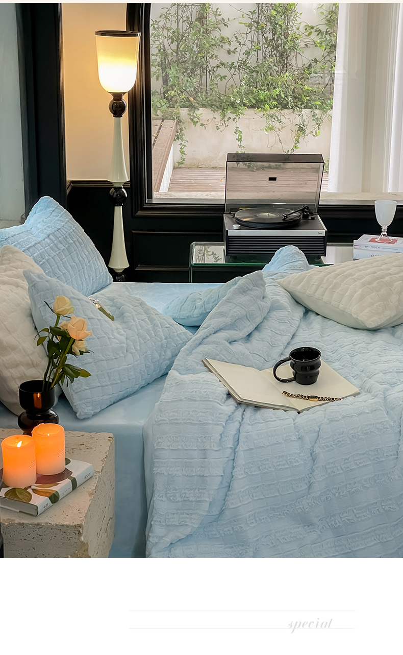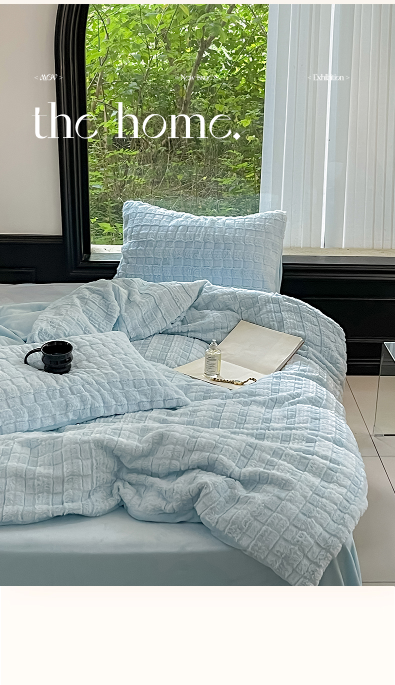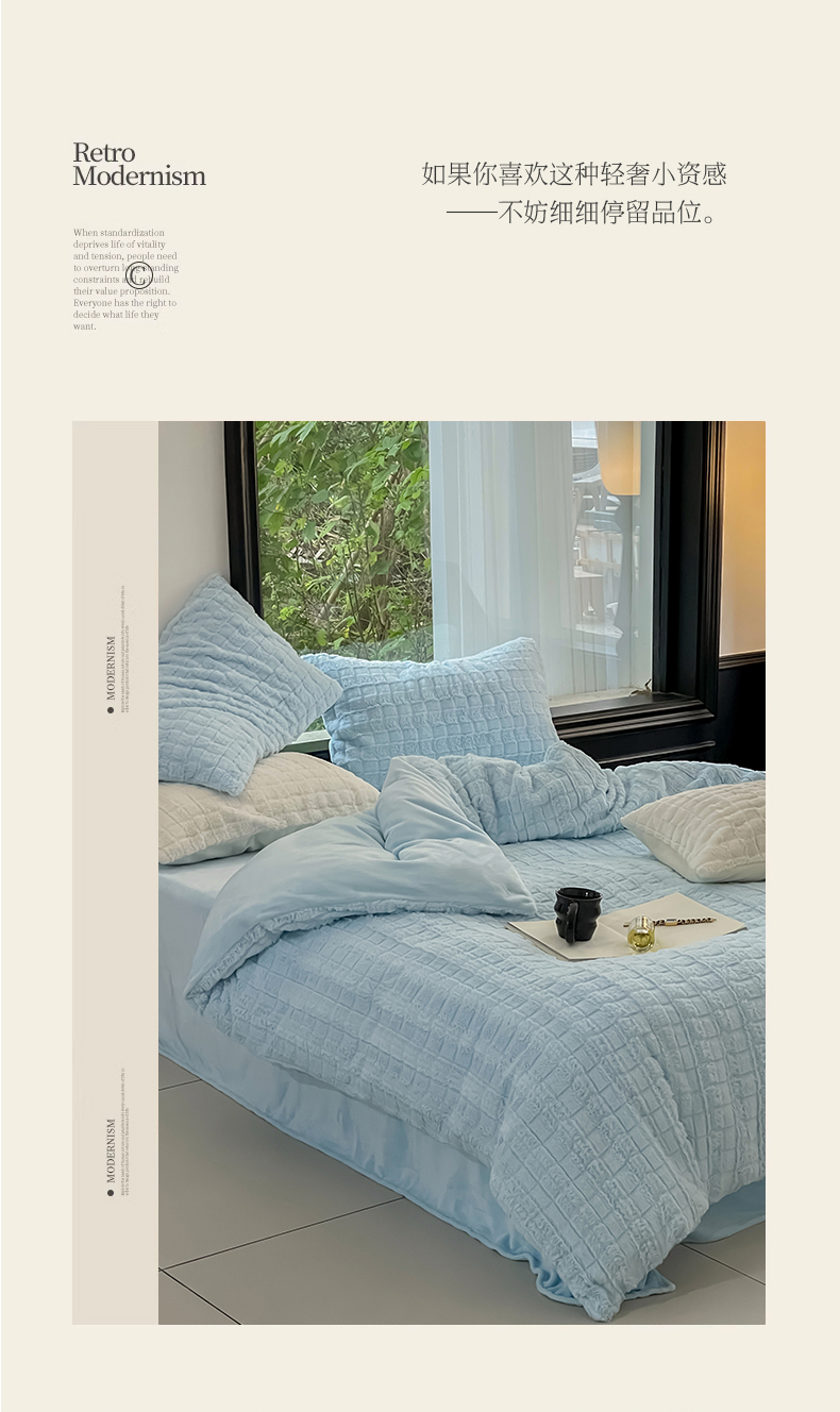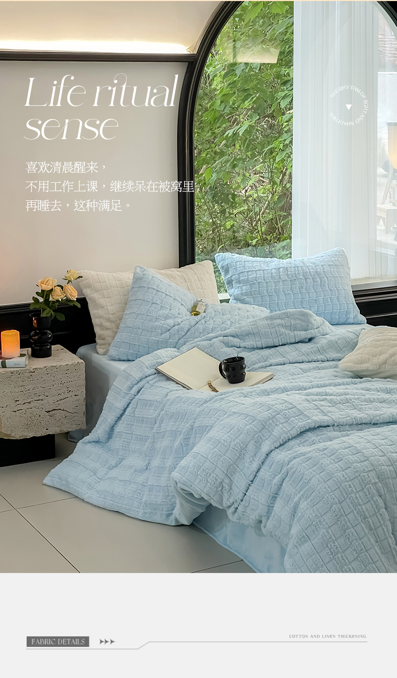 商品名称:名品优仓 2023新款A面兔毛绒B面牛奶绒系列四件套 米拉-天空蓝