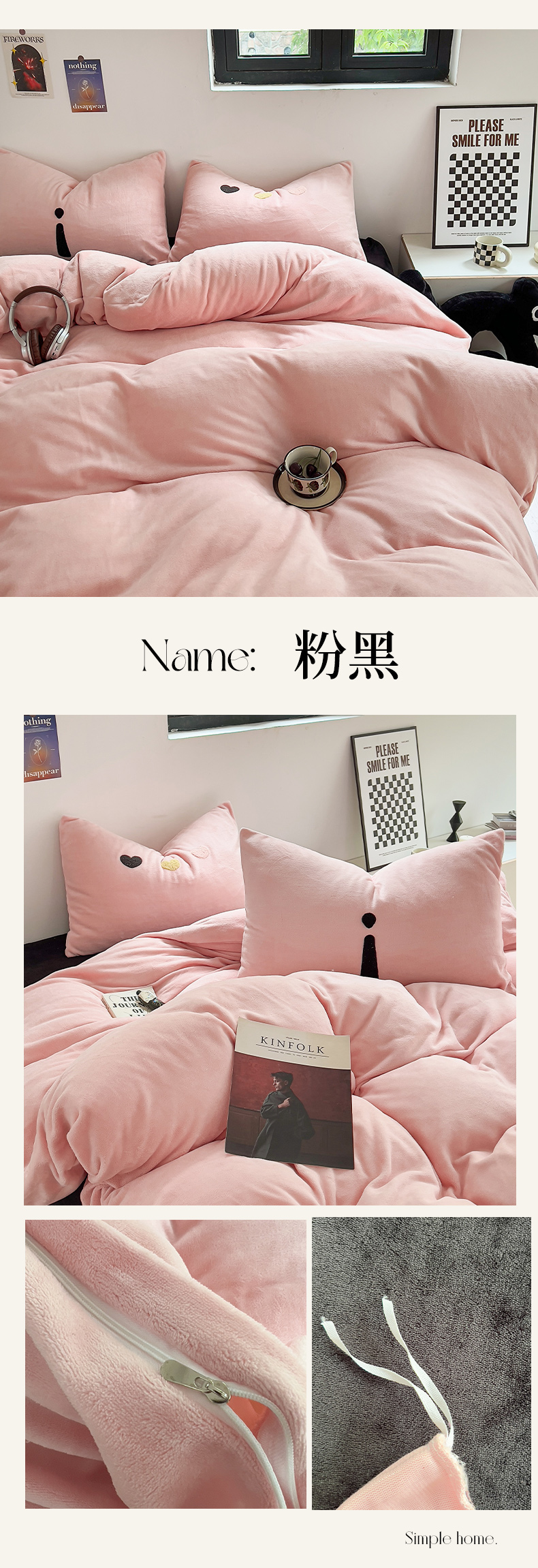 商品名称:山茶家纺 2023新款黑色系毛巾绣纯色牛奶绒四件套 黑色系-粉黑