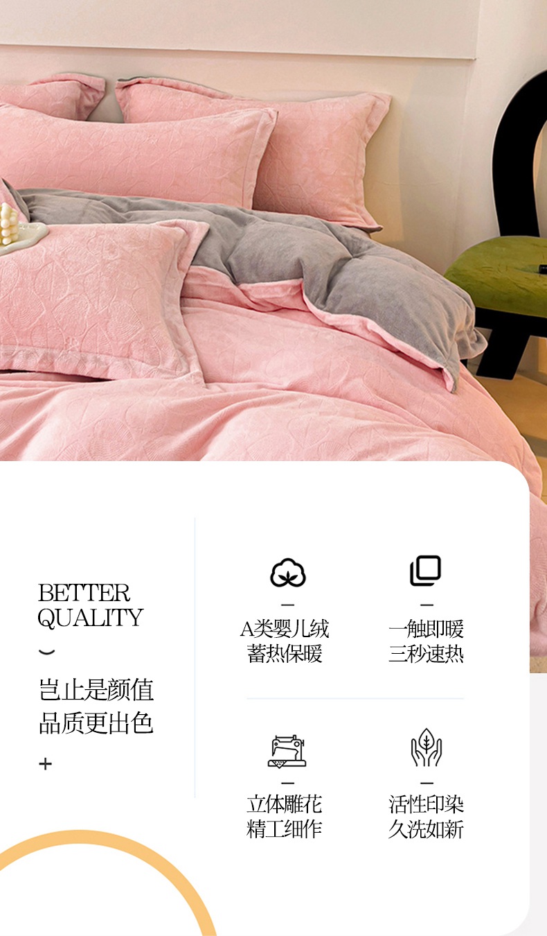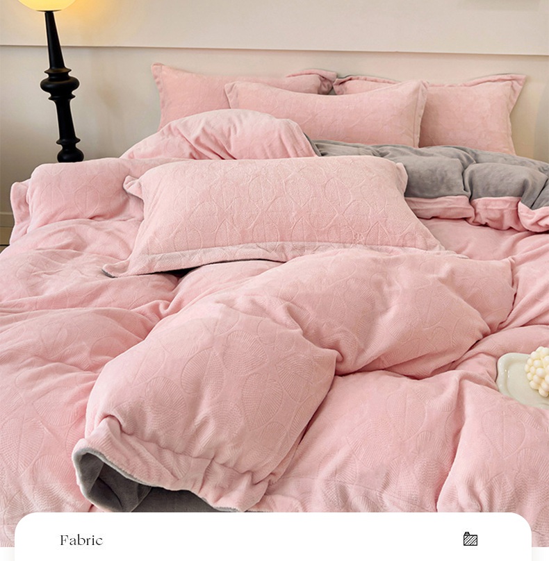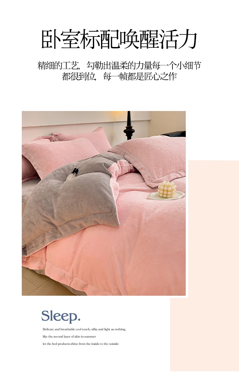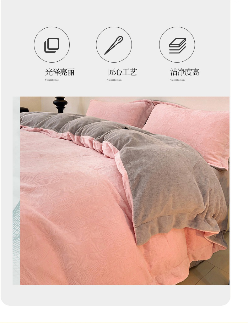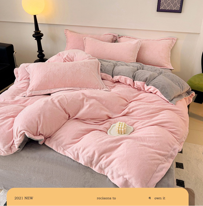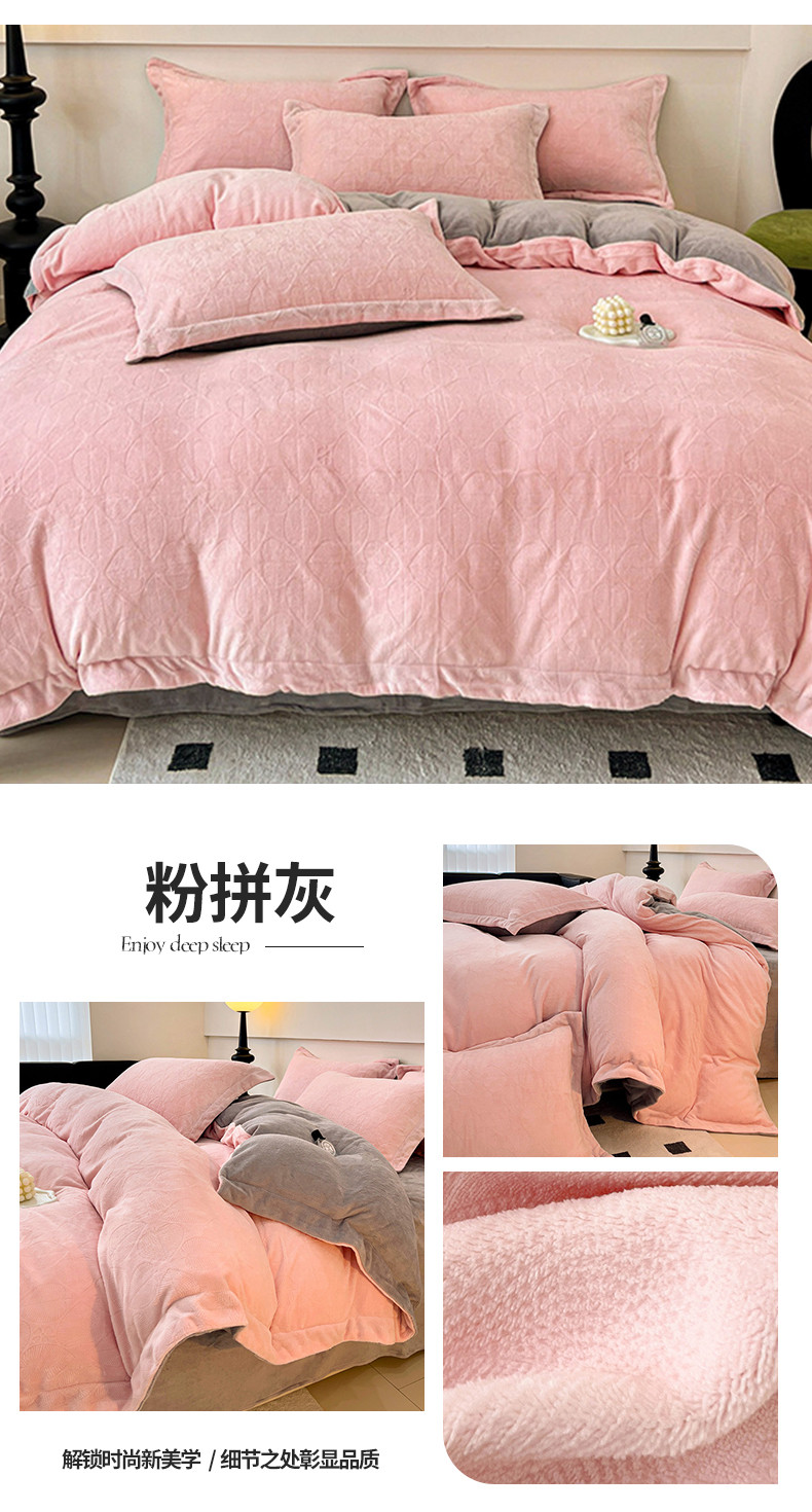 商品名称:米奈家居 2024新款A类高克重牛奶绒四件套-瑞利 粉拼灰