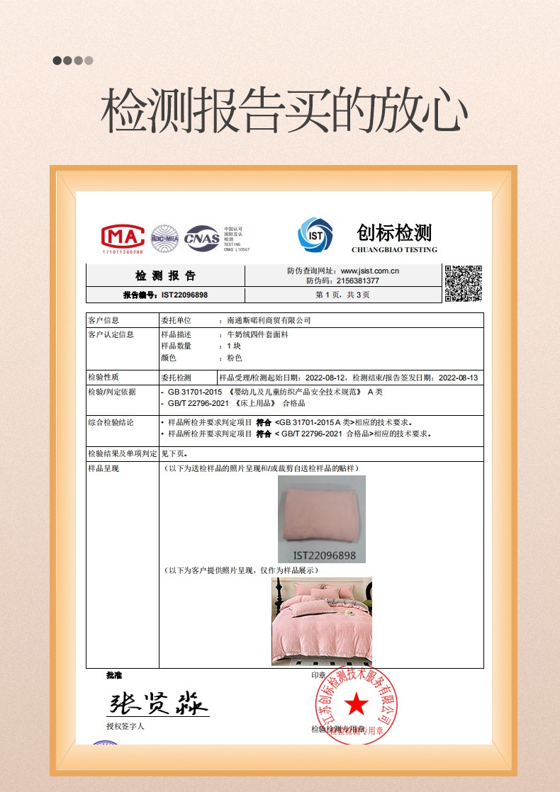 4、通州区市场监管局川姜分局友情提醒:近期针对抗静电,无静电,抗菌防螨,及有关舒适度,百分比的举报高发。为不影响商品正常销售,请各商家高度重视,自检自查及时整改,谢谢配合!