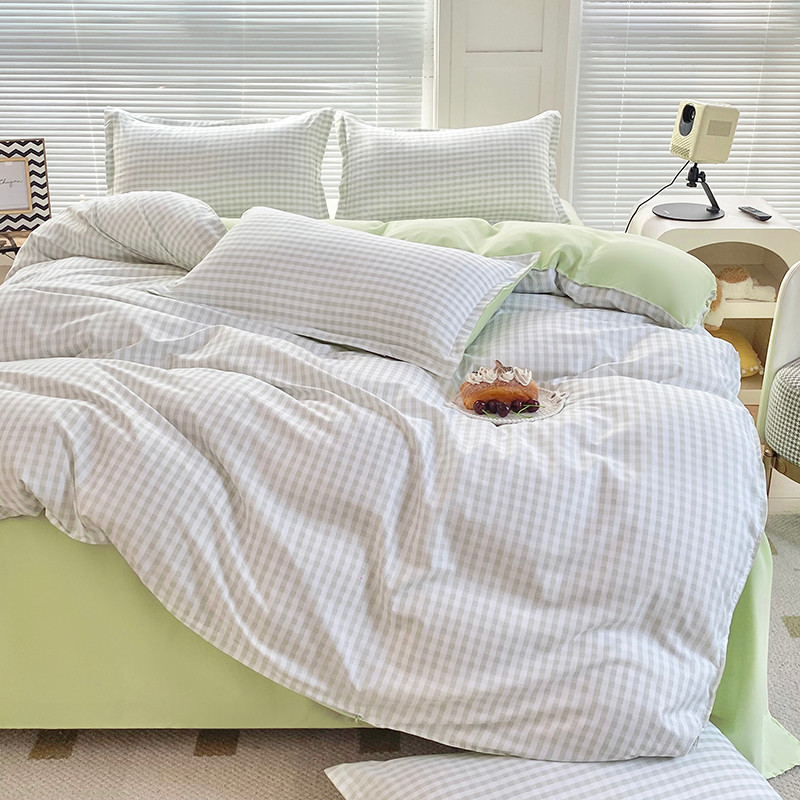 (总)楠沐家纺 2025年新款无印风学生印花四件套芦荟棉水洗棉,彩色波点,觅遇,晴空蓝格,亚麻灰格,烟雾灰格,英伦蓝格