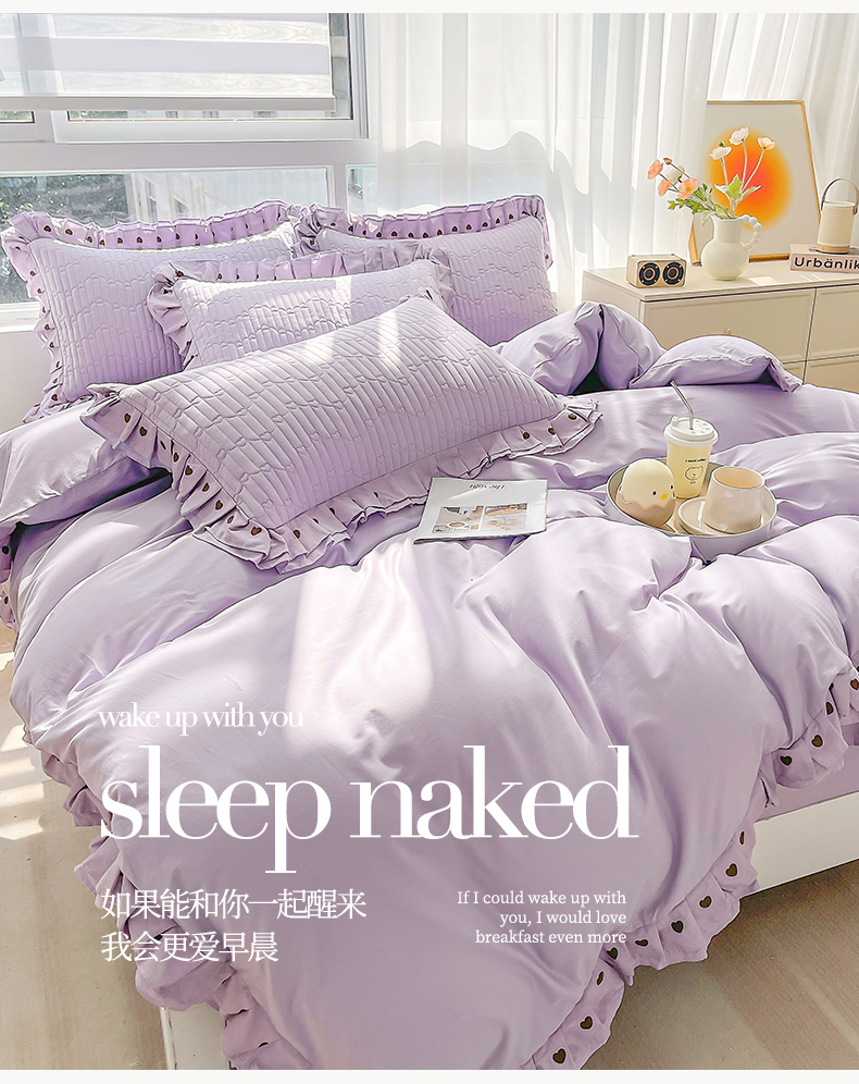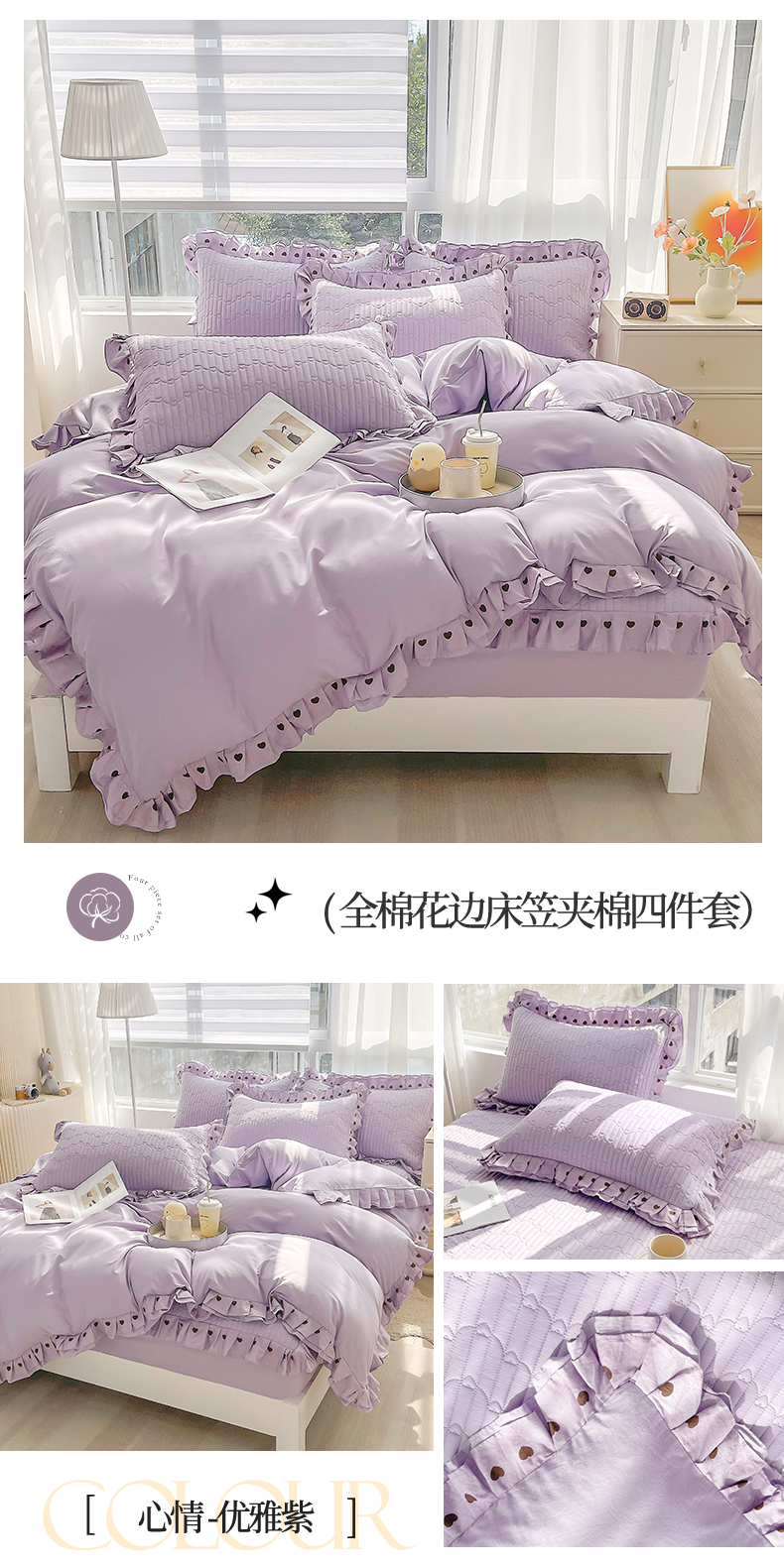 当前位置: 91家纺网 > 商品网购 > 床品套件 > 四件套 > 全棉普通四件套 > 宜凡家纺 2024新品全棉夹棉花边床笠四件套-心情 心情 优雅紫