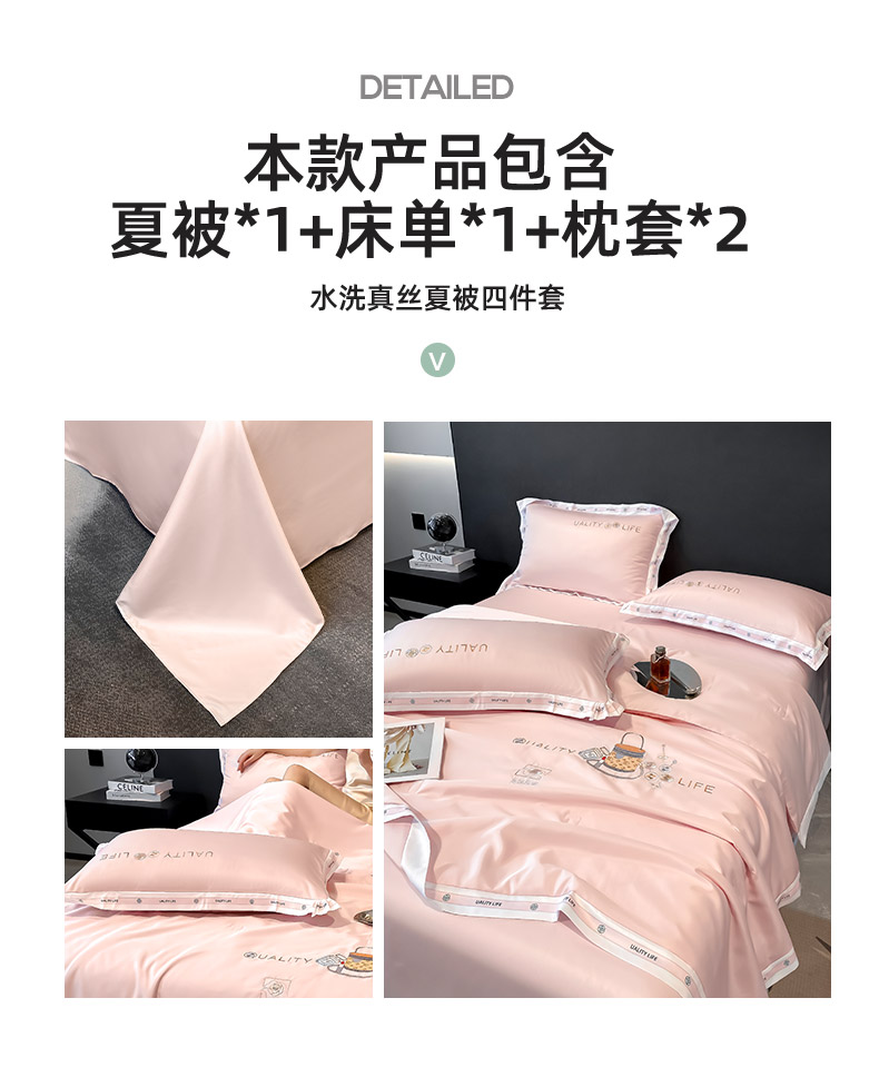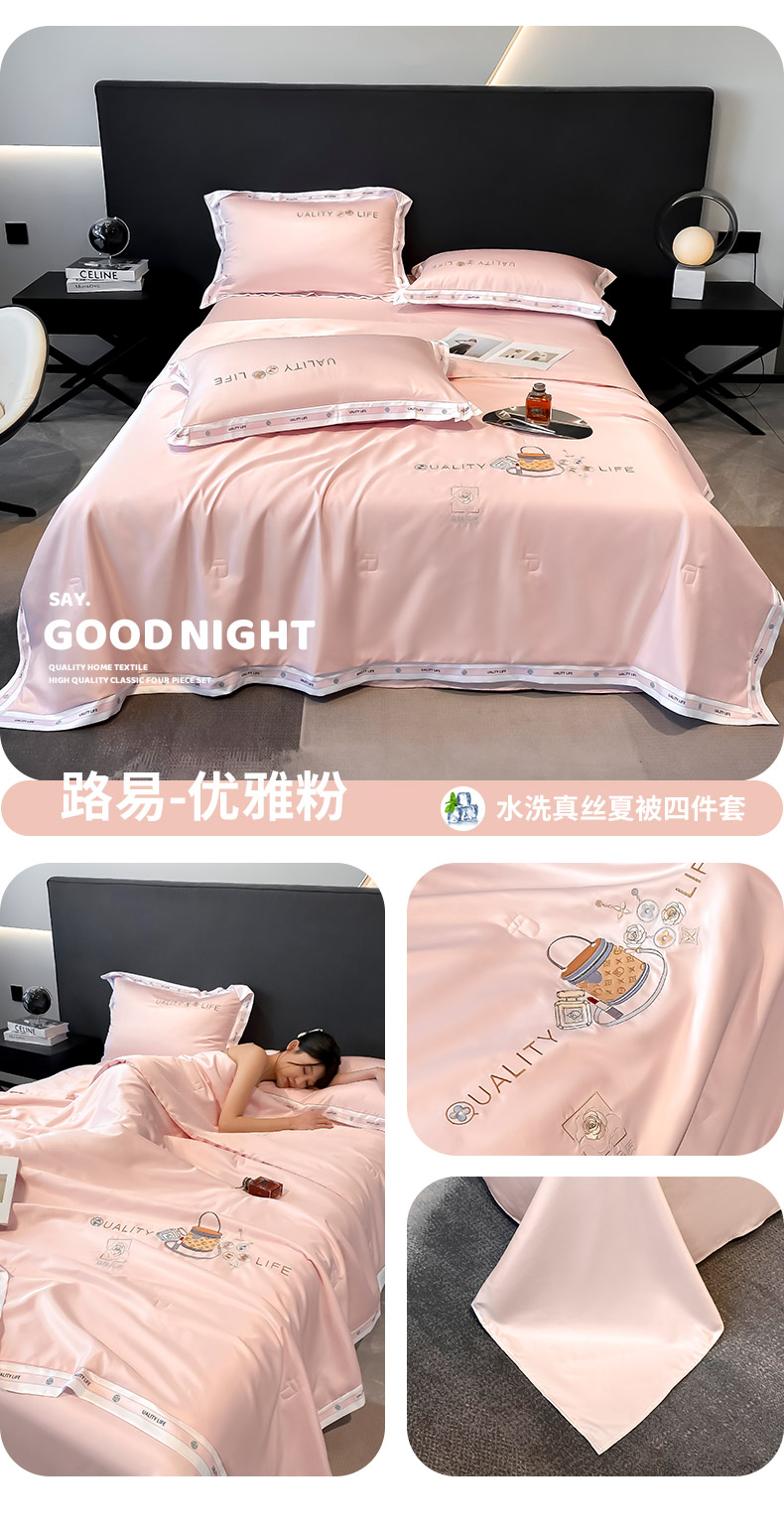 • 91家纺网 家纺一手货源 找家纺 丝印良品 2024新款大牌风水洗真丝绣花床笠被套夏被四件套路易系列 路易-优雅粉