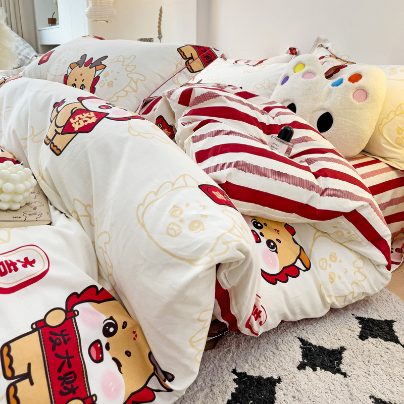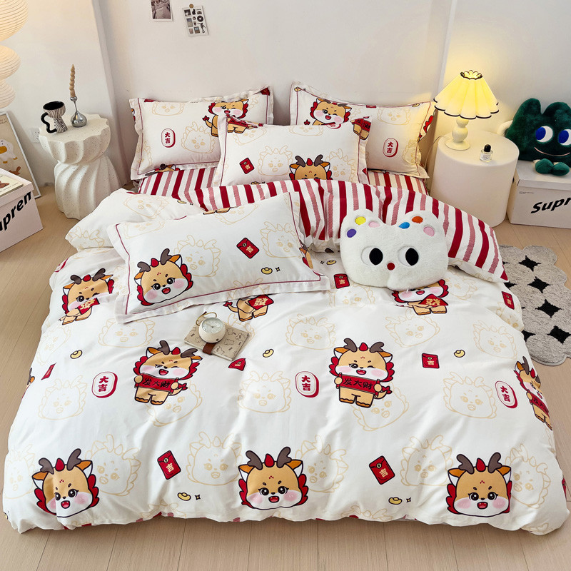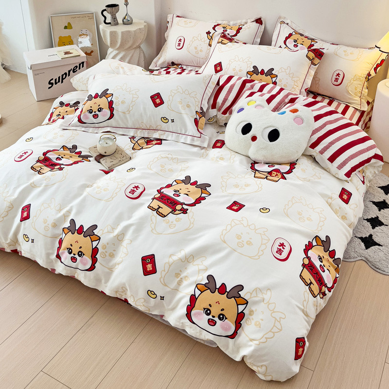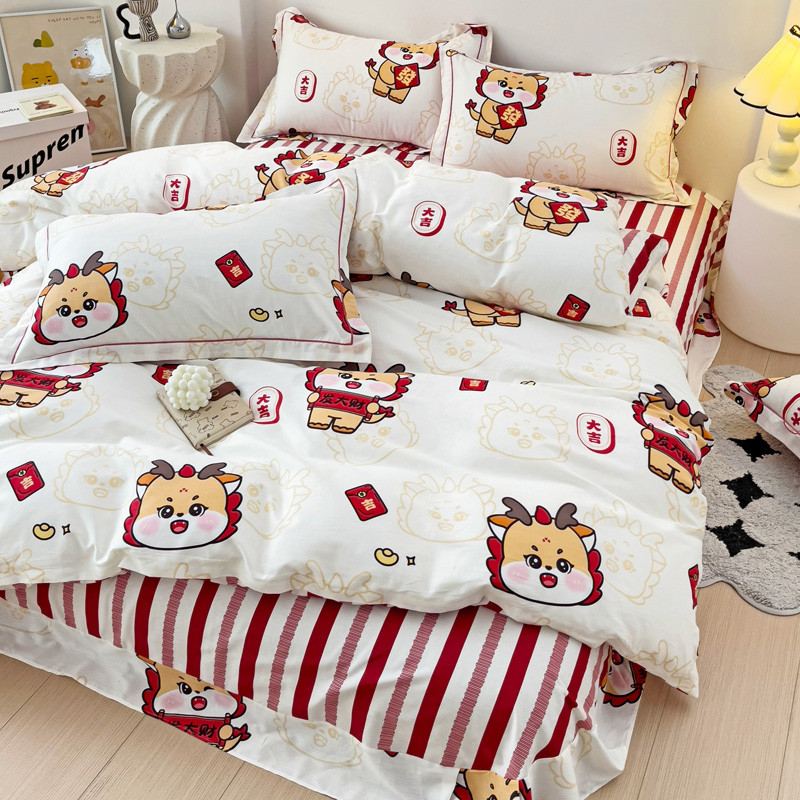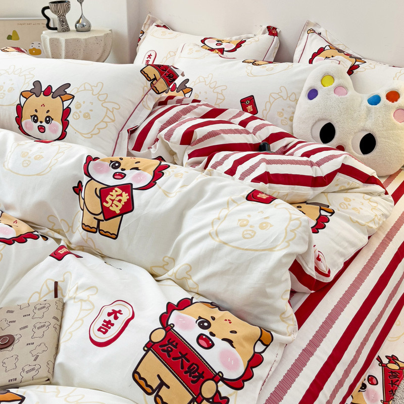 商品名称:乐童 2024新款直播爆款13070纯棉印花吊边款一字绣四件套 快乐小龙