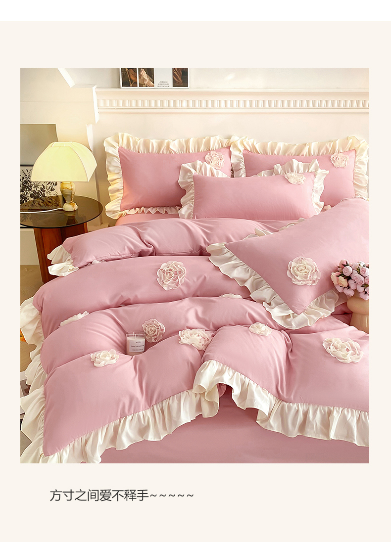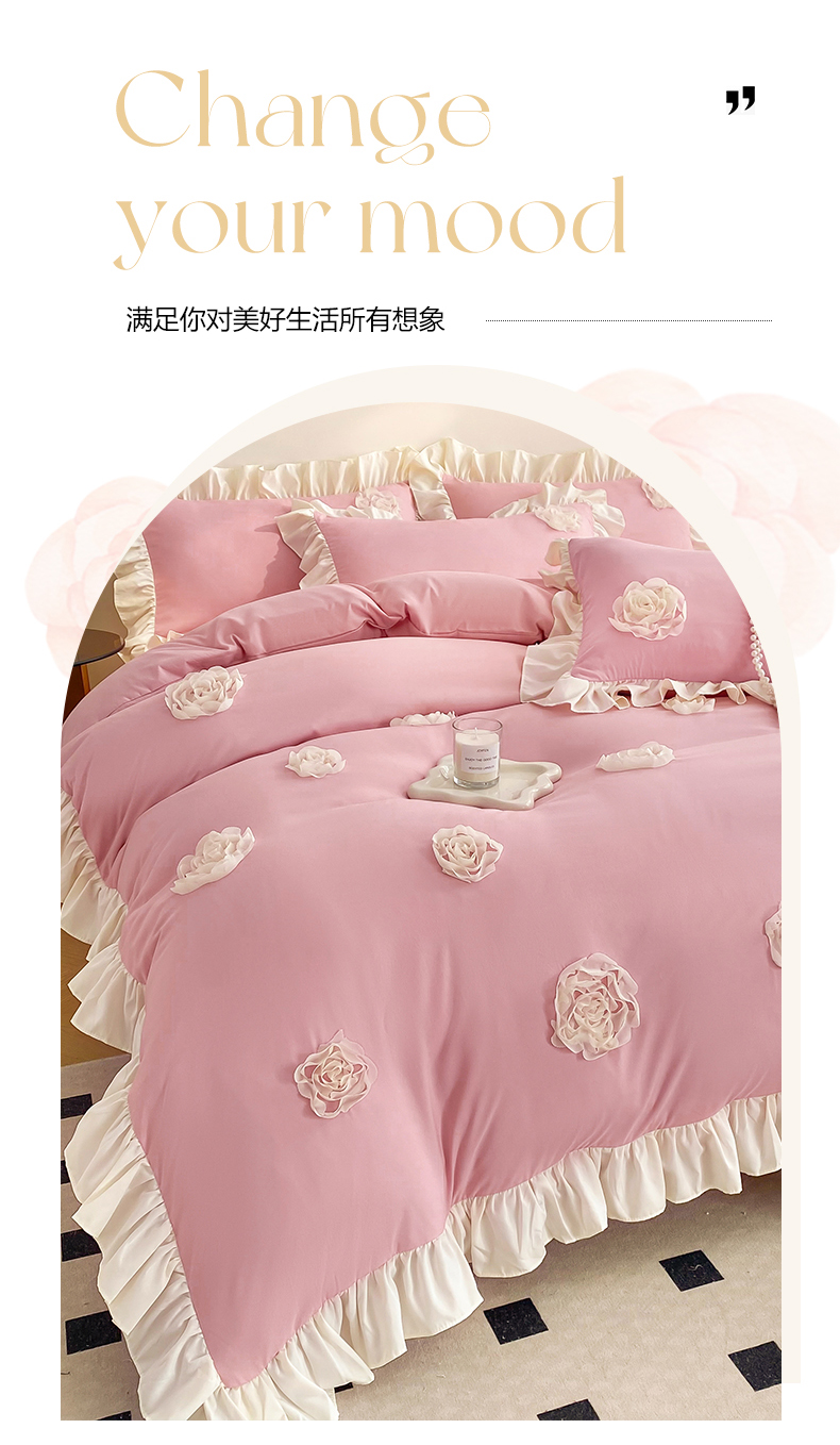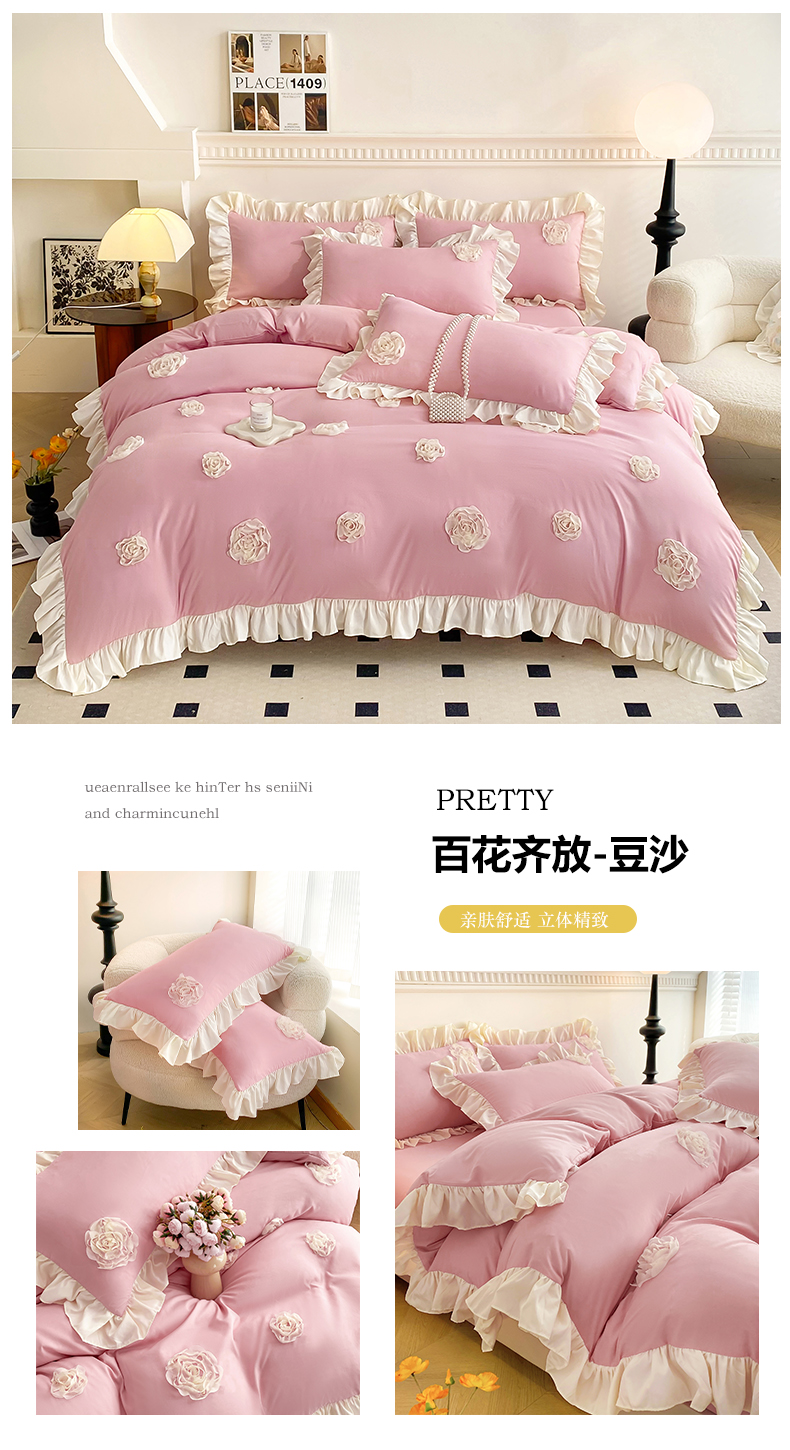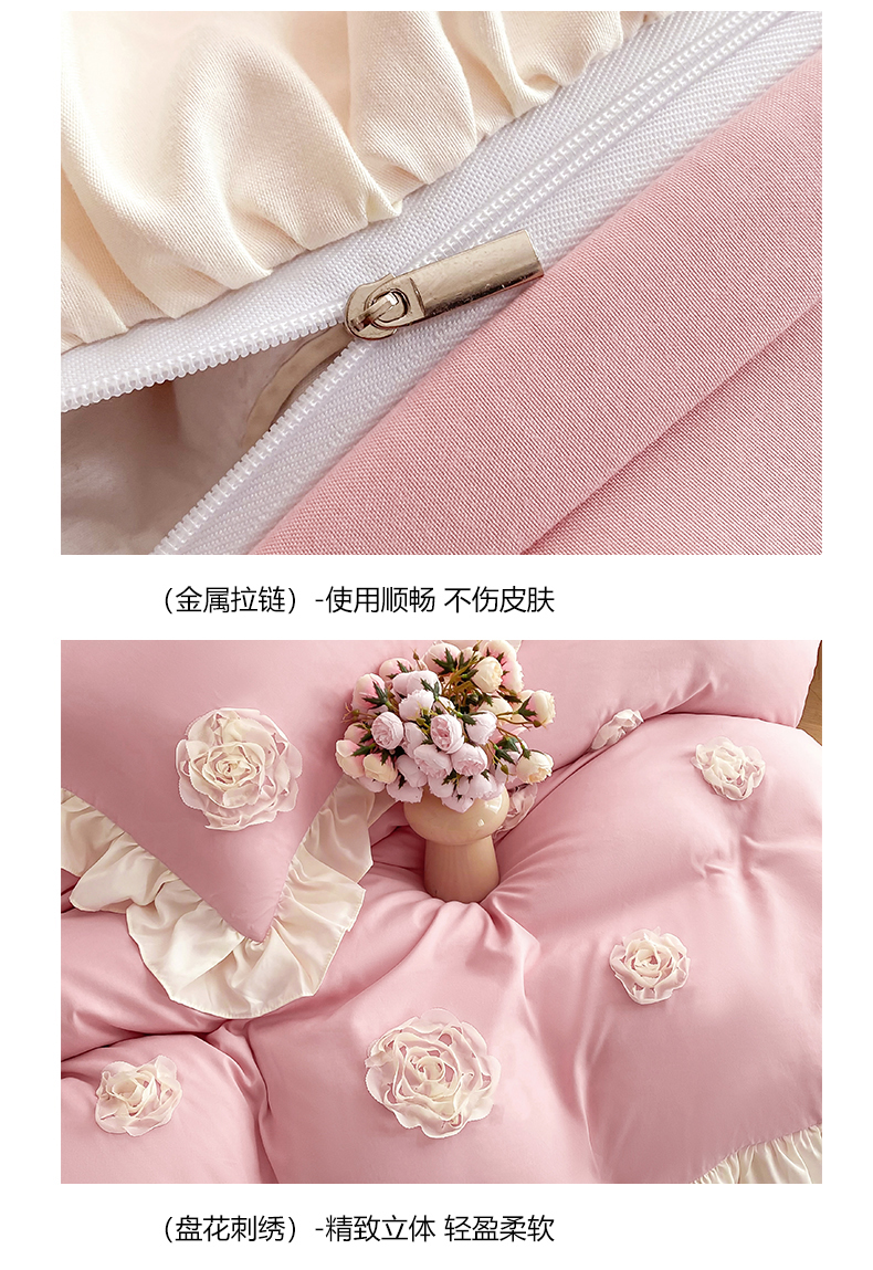 商品名称:水洗亲肤棉立体刺绣四件套公主风四件套 百花齐放-豆沙