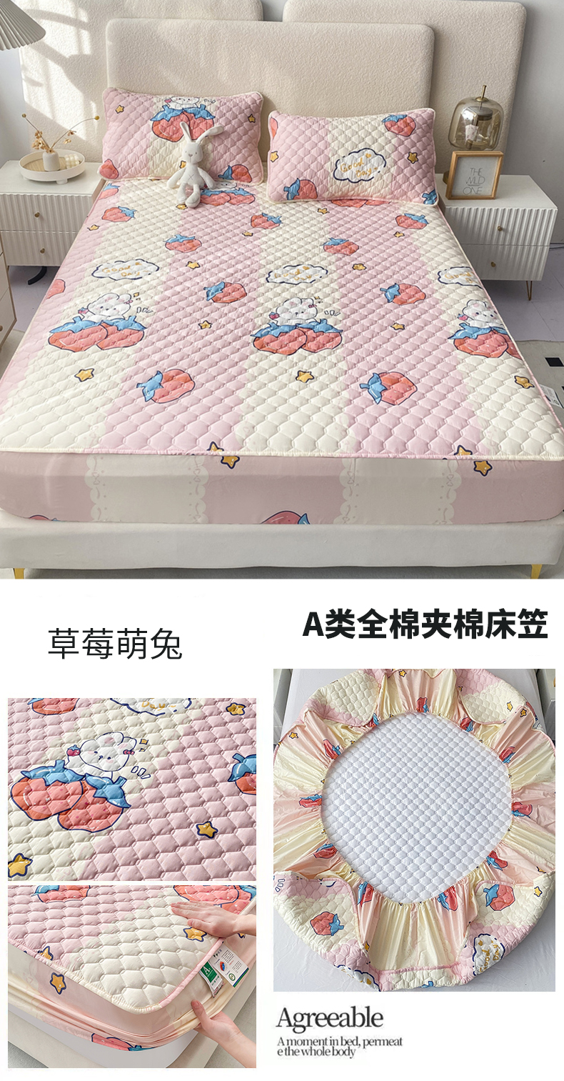 九亭家纺 2024新款A类全棉抗菌夹棉床笠 全棉-草莓萌兔