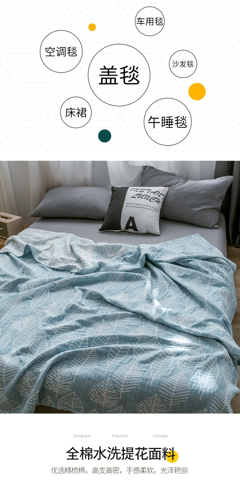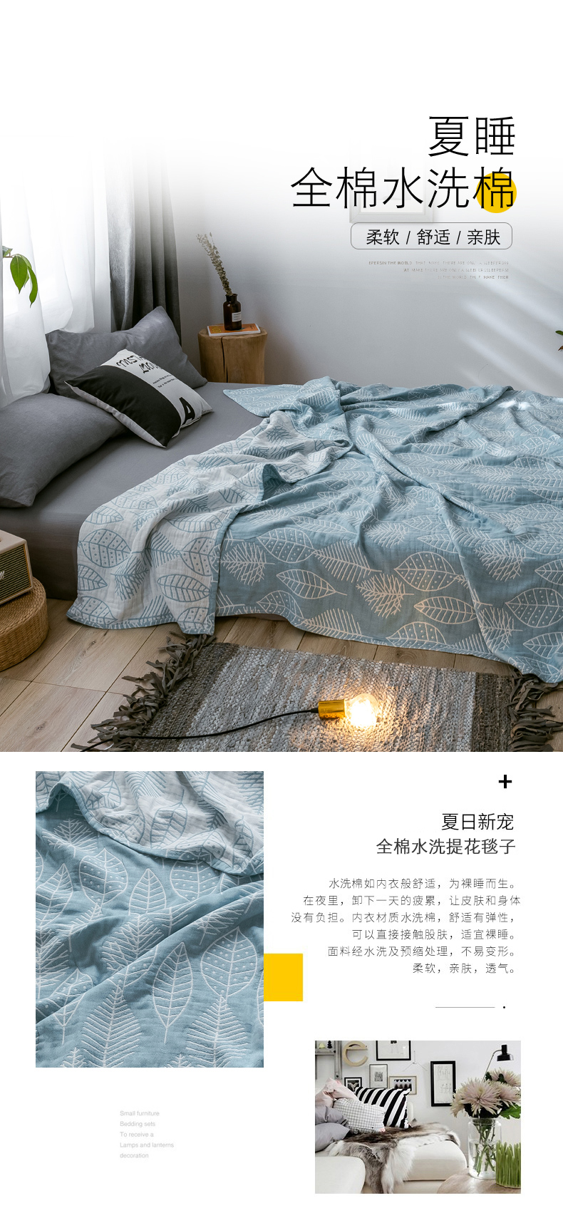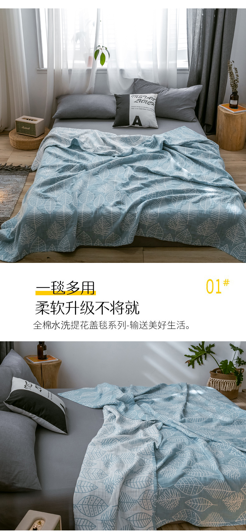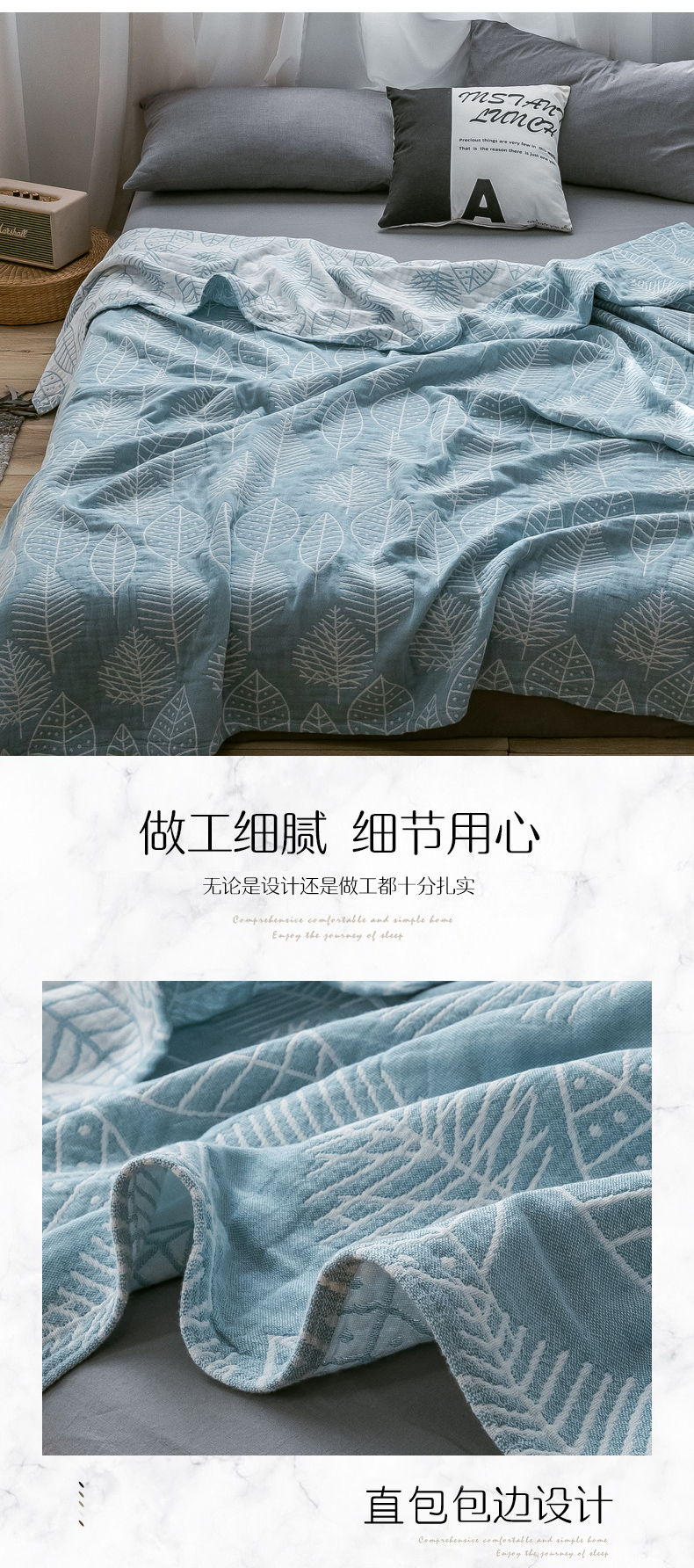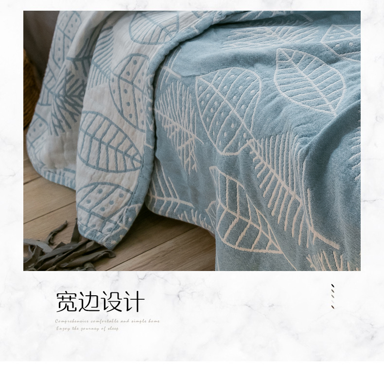 商品名称:朴尔家纺-毛巾被 2024新款三层水洗棉全棉纱布毛巾被 日式落叶-冰蓝