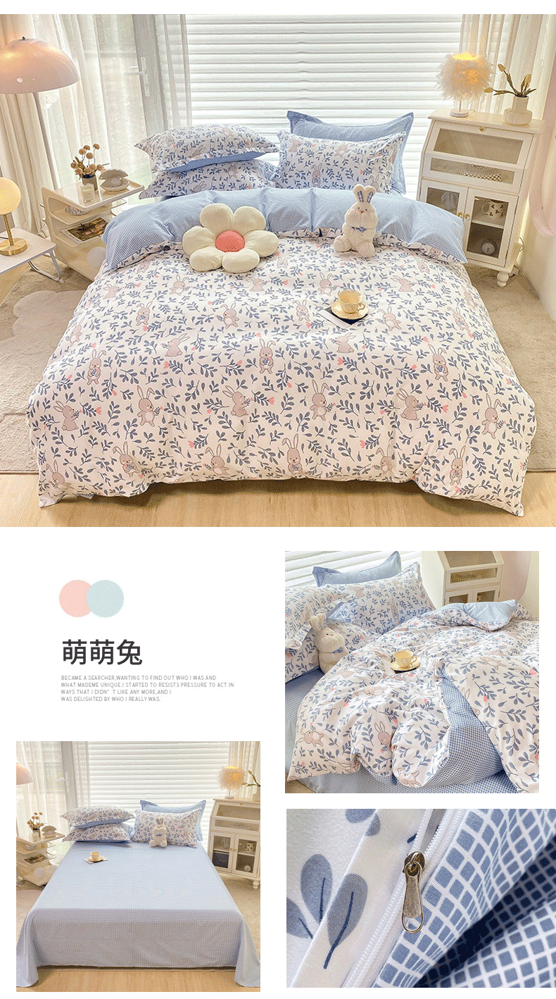 当前位置: 91家纺网 > 商品网购 > 床品套件 > 四件套 > 普通磨毛四件套 > 美宜家 2025新款140克小清新磨毛印花学生四件套 萌萌兔