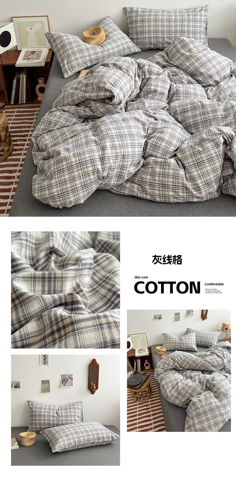 商品名称:水洗的故事 2024新款无印良品水洗棉四件套 灰线格