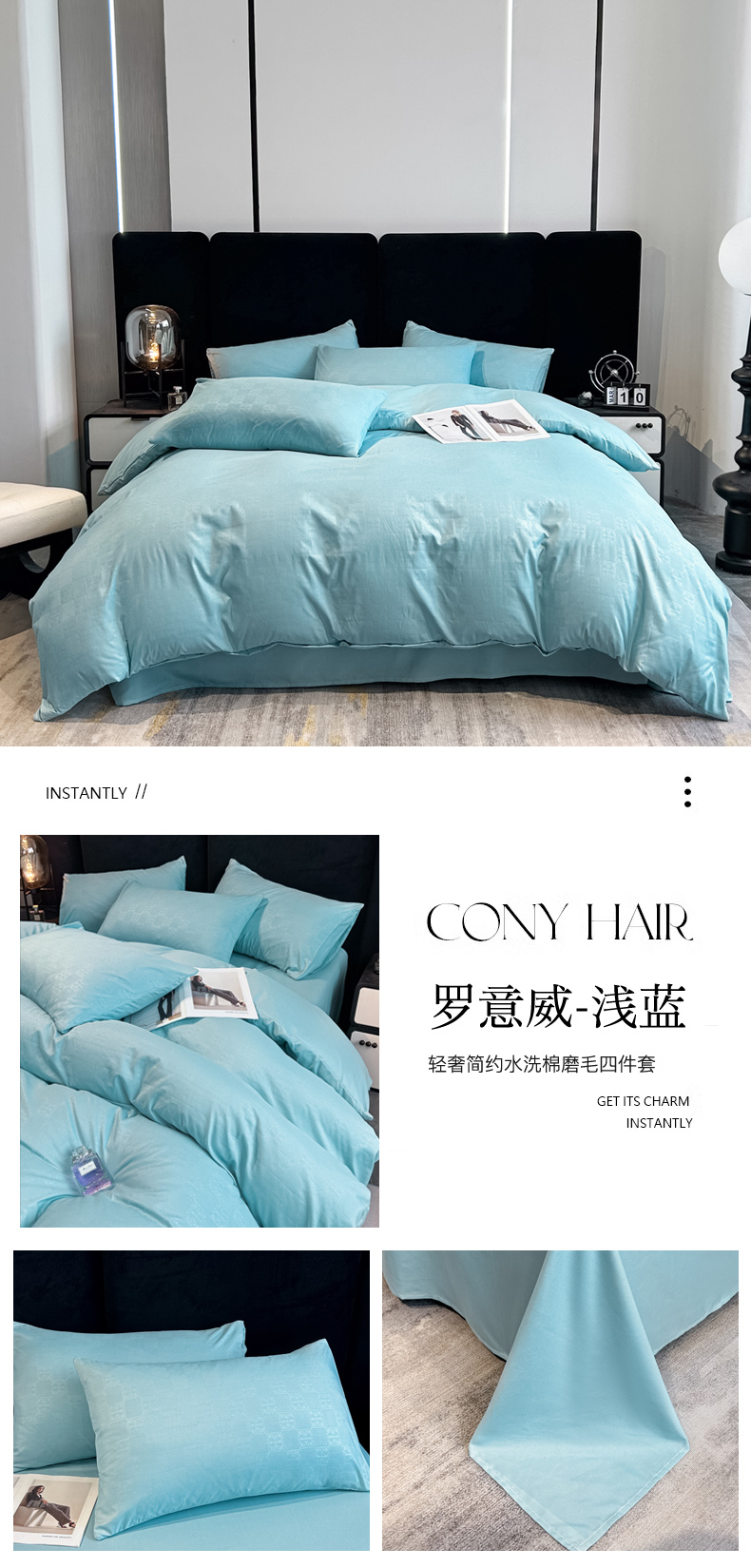 当前位置: 91家纺网 > 商品网购 > 床品套件 > 四件套 > 大米家居 2024年新款轻奢大牌风压花水洗棉磨毛四件套 罗意威-浅蓝