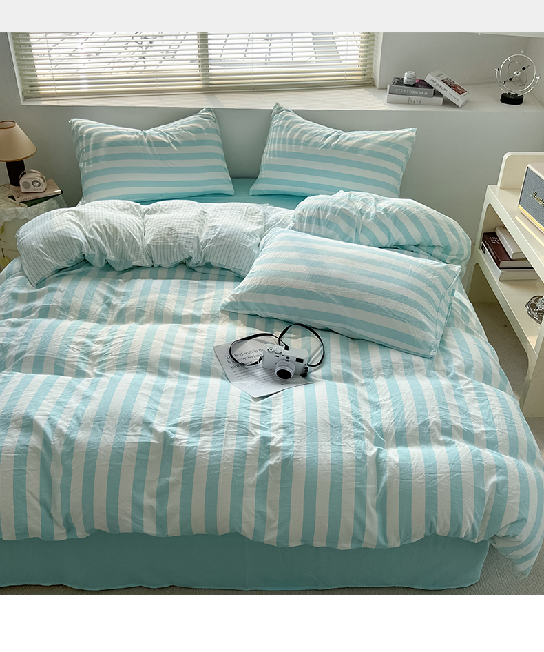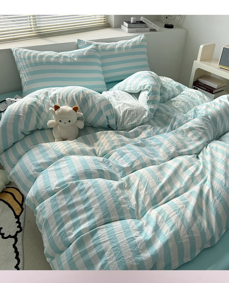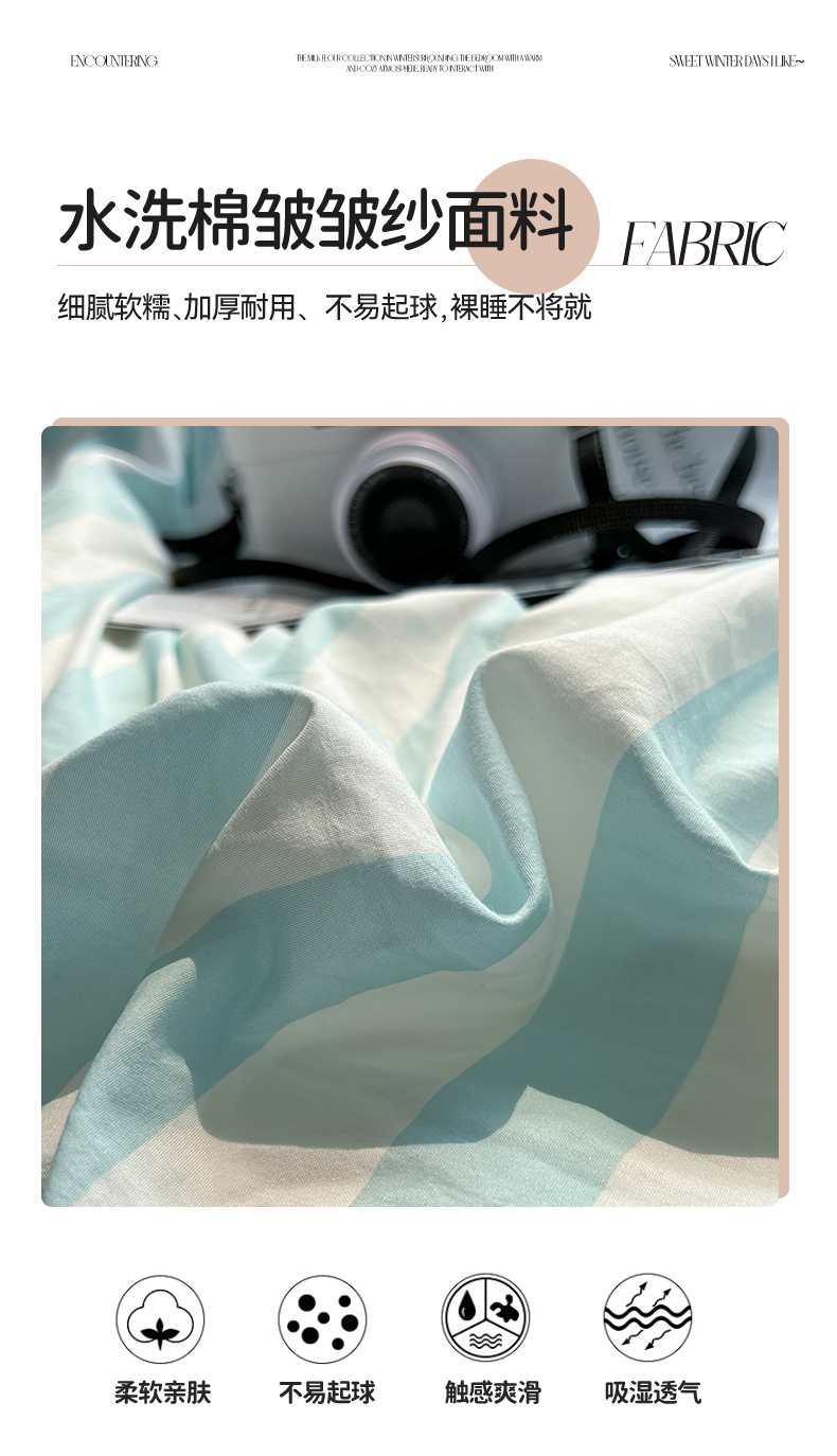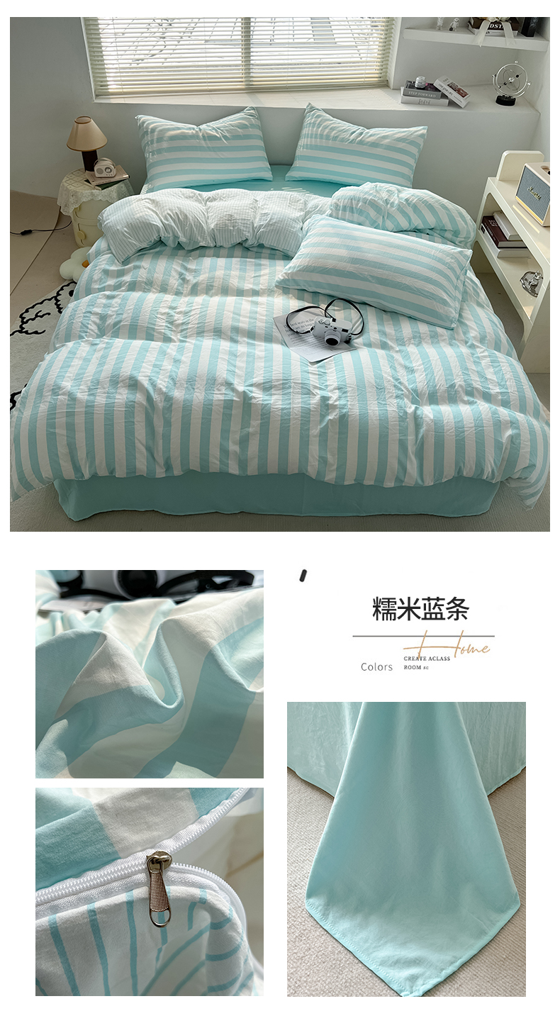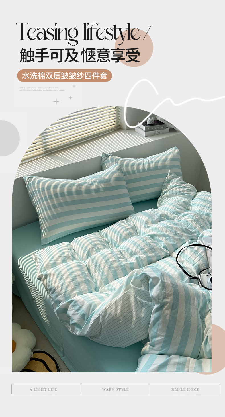 当前位置: 91家纺网 > 商品网购 > 床品套件 > 四件套 > 全棉普通四件套 > 多品 2024新款高克重水洗棉双层纱皱皱纱四件套 糯米蓝条