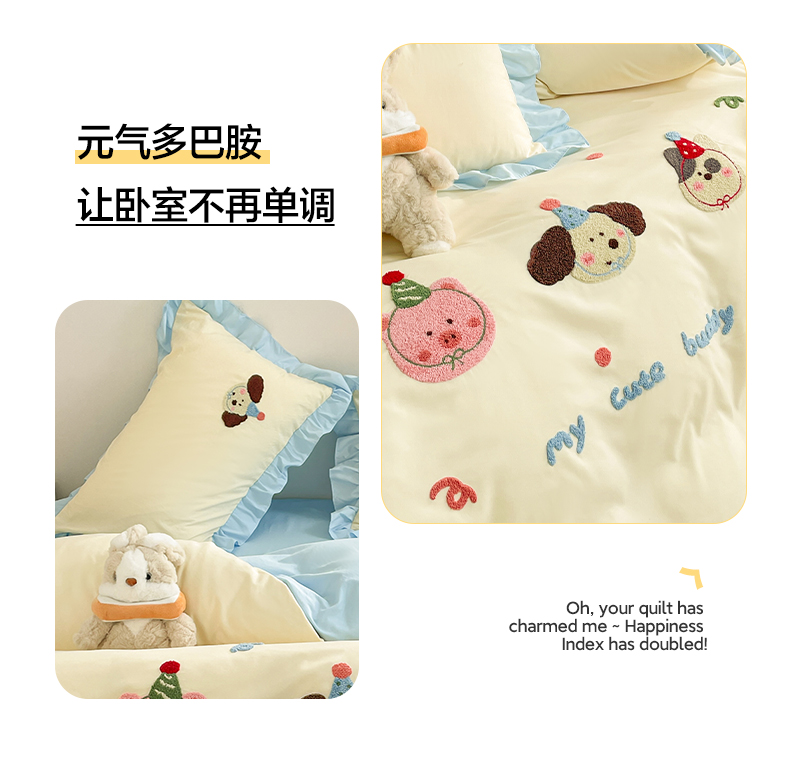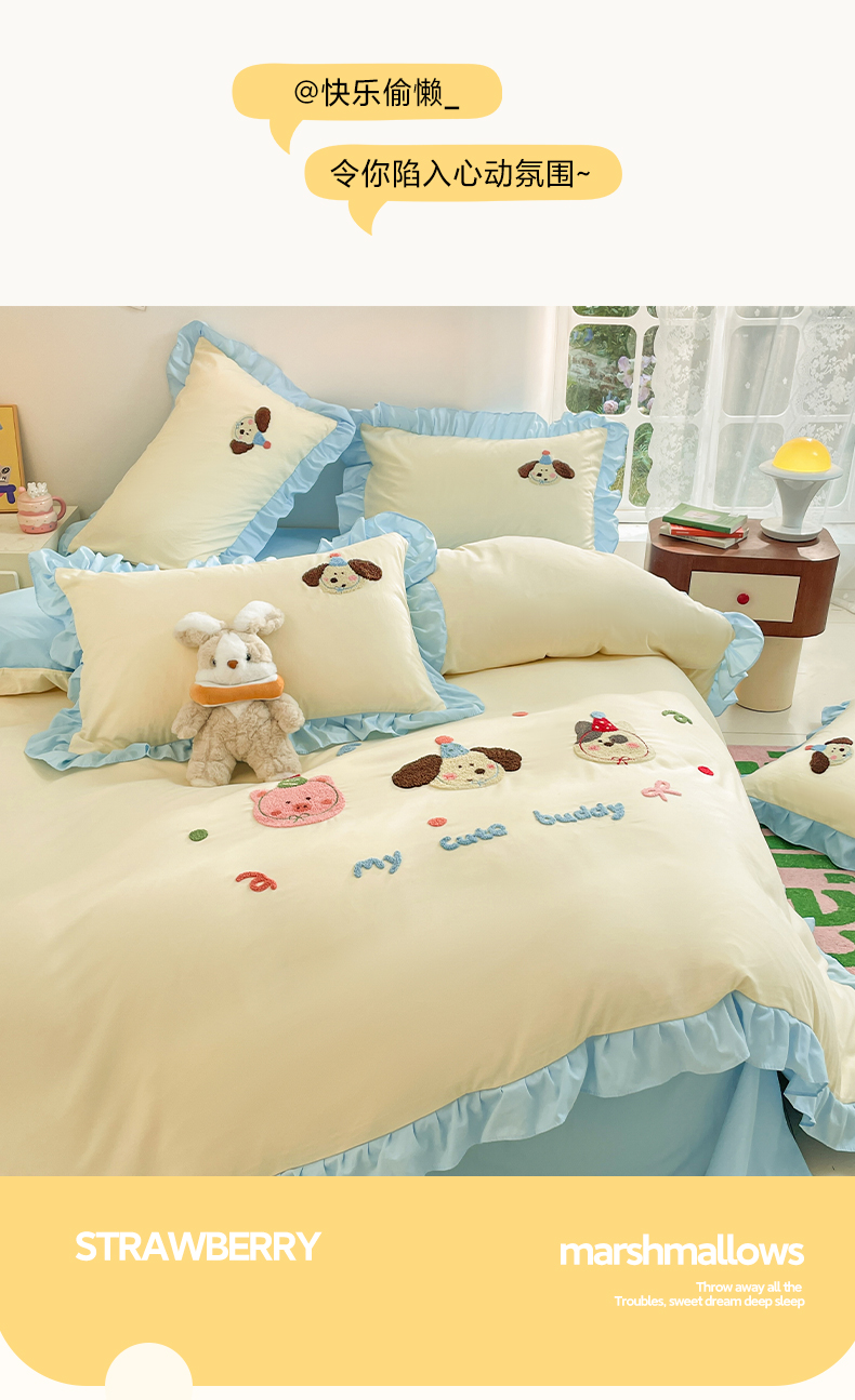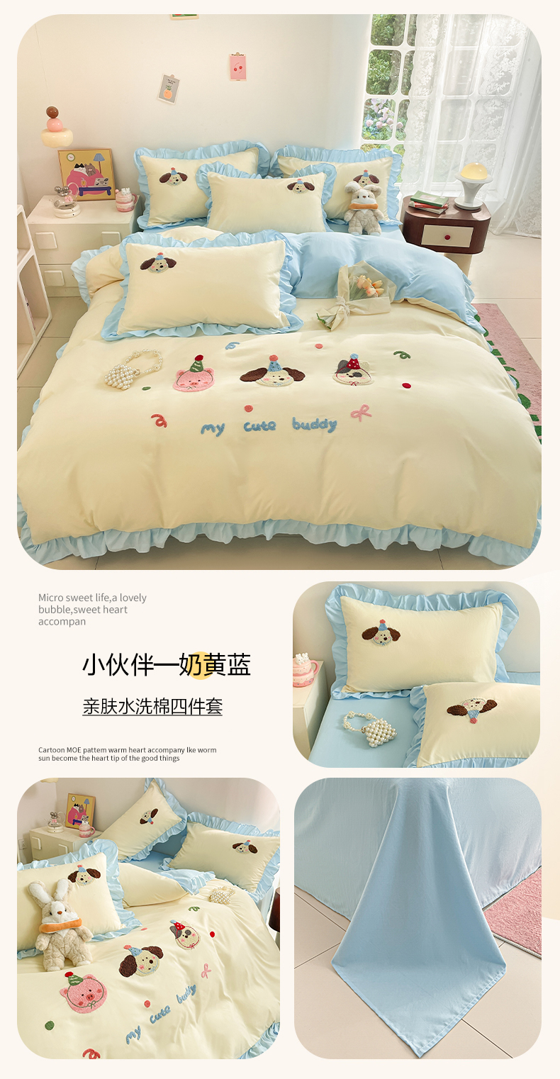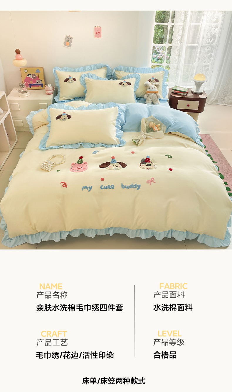 当前位置: 91家纺网 > 商品网购 > 床品套件 > 四件套 > 毛巾绣四件套 > 易禾家纺 2024新款专板花型亲肤水洗棉毛巾绣花边四件套-小伙伴 小伙伴-奶黄蓝