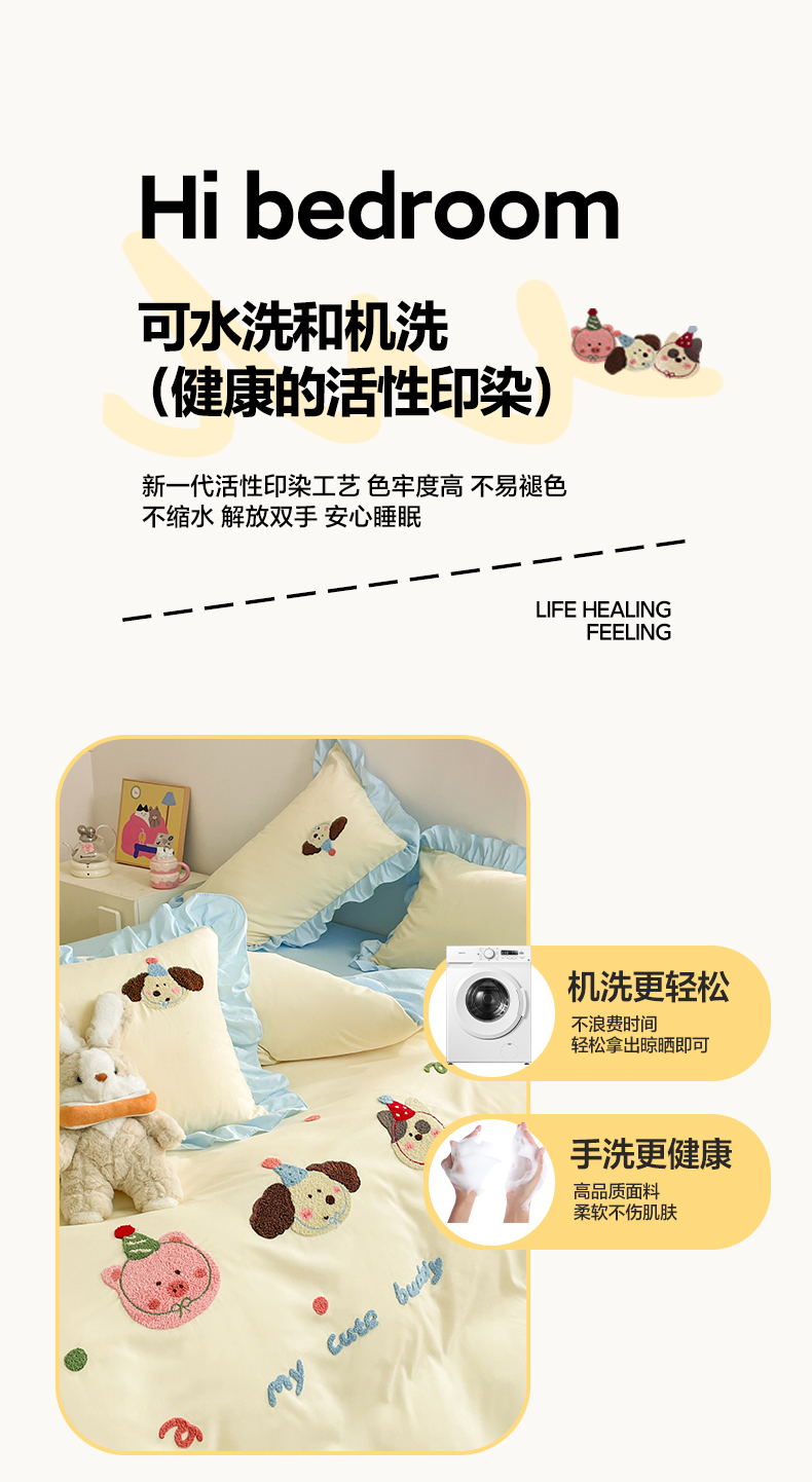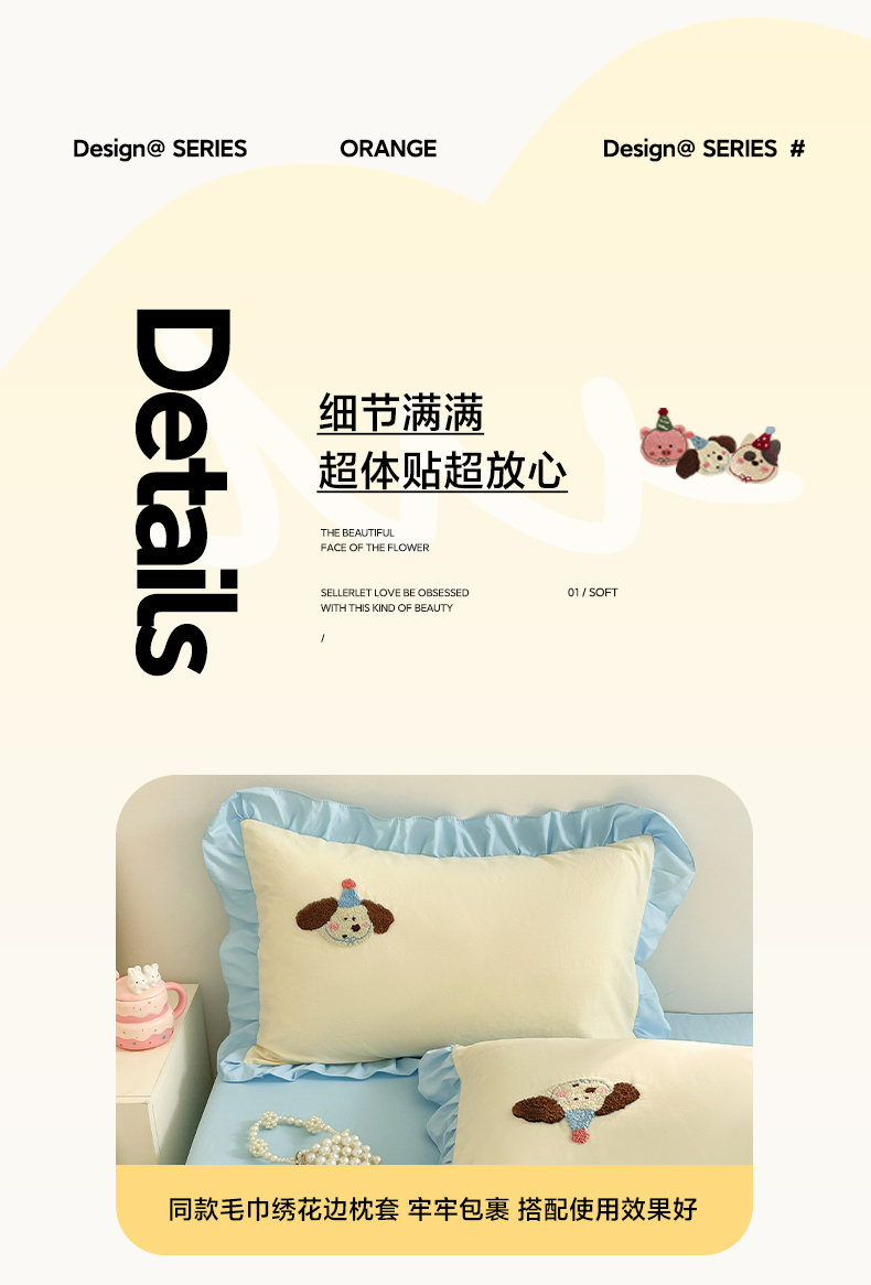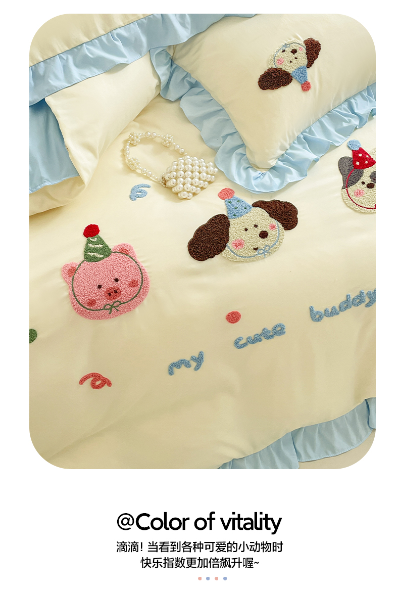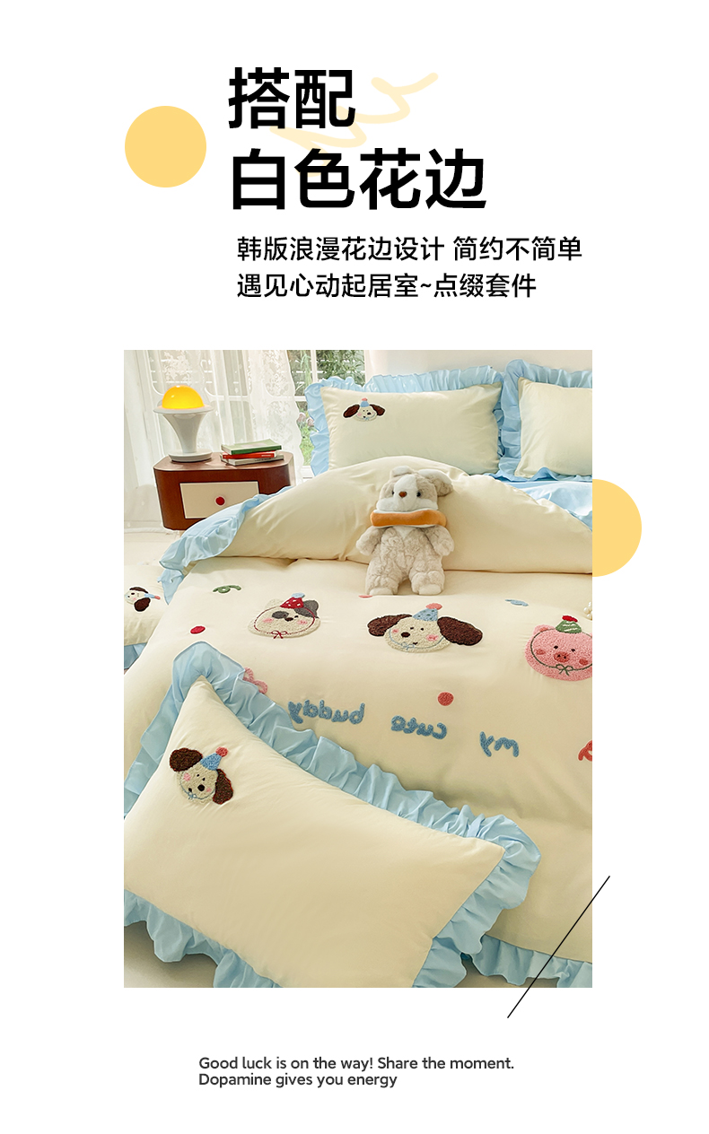 当前位置: 91家纺网 > 商品网购 > 床品套件 > 四件套 > 毛巾绣四件套 > 易禾家纺 2024新款专板花型亲肤水洗棉毛巾绣花边四件套-小伙伴 小伙伴-奶黄蓝