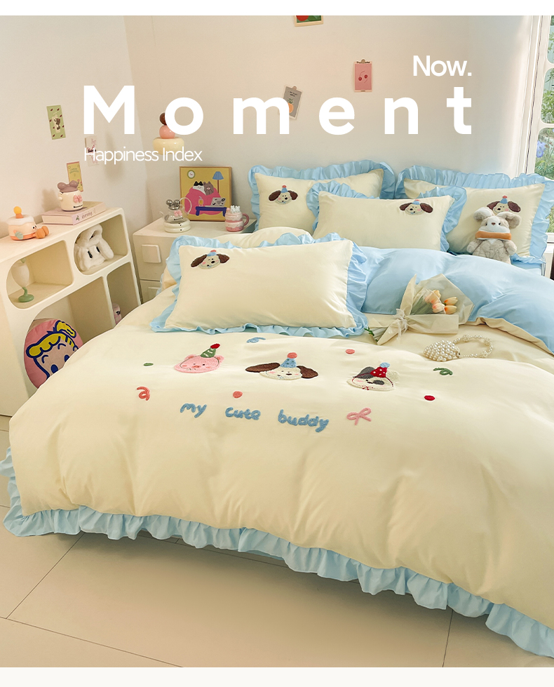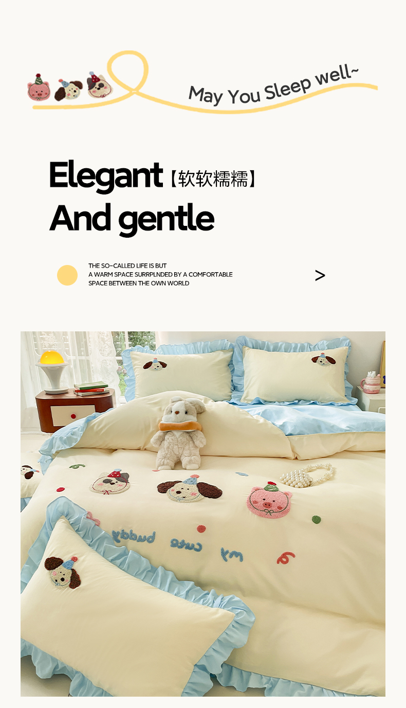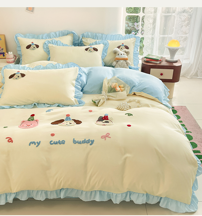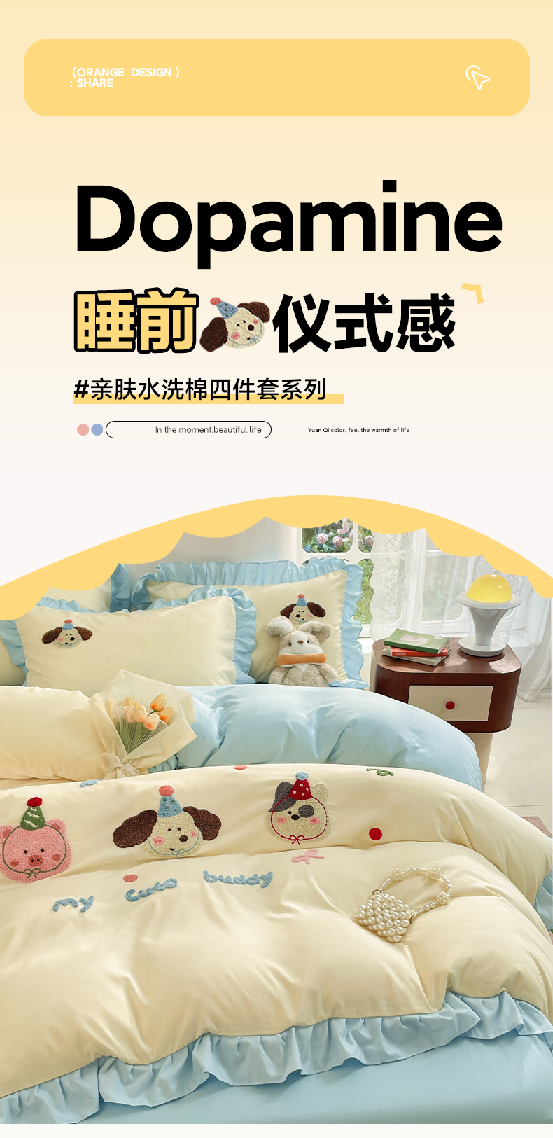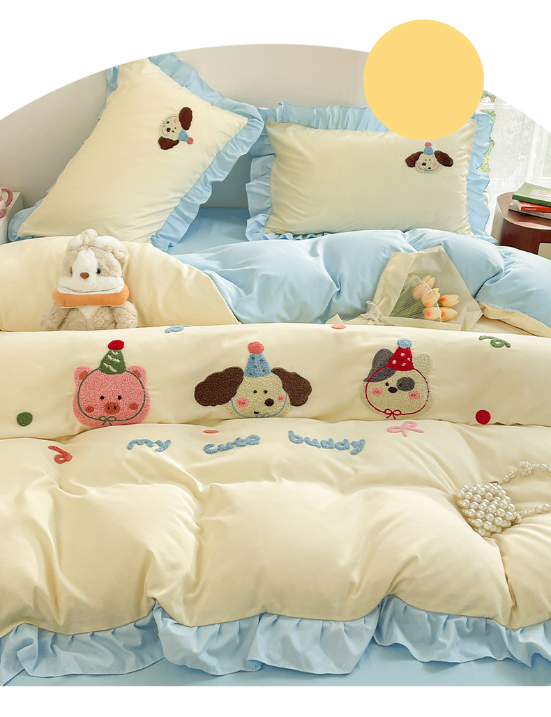 当前位置: 91家纺网 > 商品网购 > 床品套件 > 四件套 > 毛巾绣四件套 > 易禾家纺 2024新款专板花型亲肤水洗棉毛巾绣花边四件套-小伙伴 小伙伴-奶黄蓝
