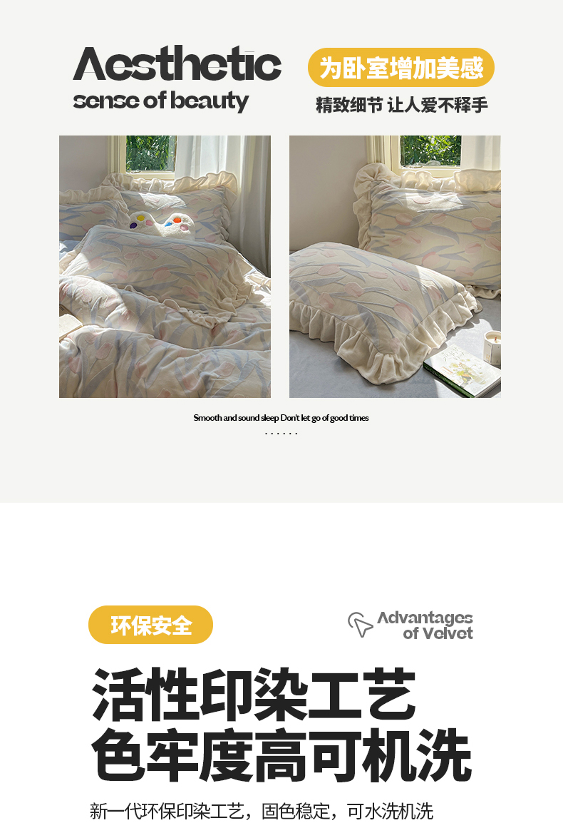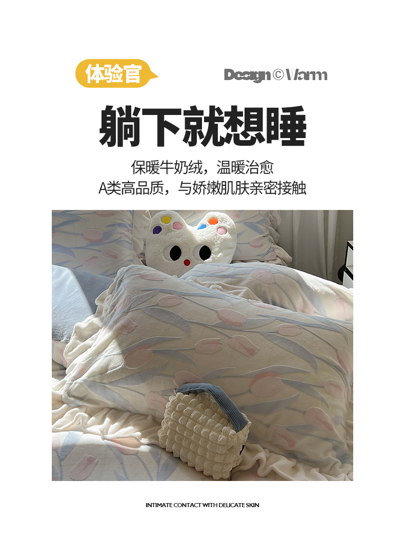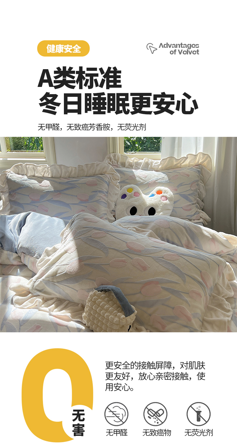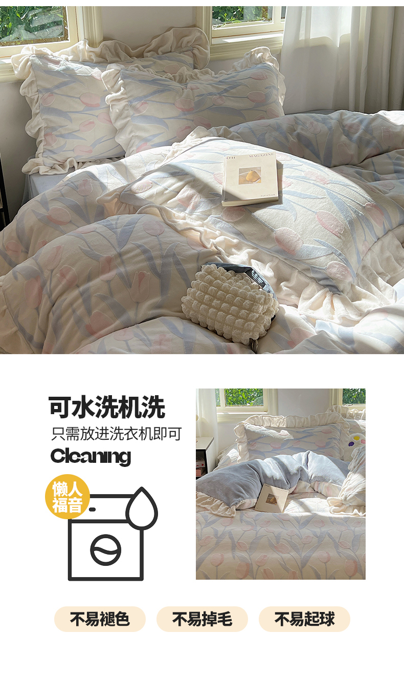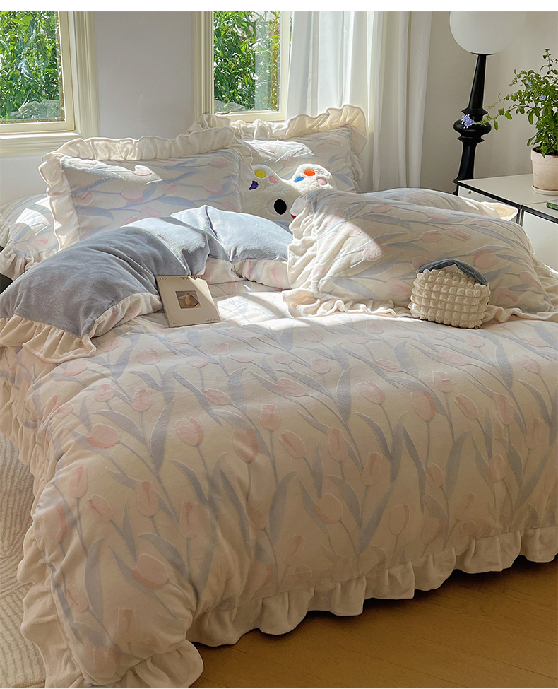 当前位置: 91家纺网 > 商品网购 > 床品套件 > 四件套 > 牛奶绒四件套 > 桃子家居 2024新款A类高克重230克3D立体雕花烂花提花着色郁金香少女花边款简单款牛奶绒四件套 绒花边烂花-郁金香清新蓝