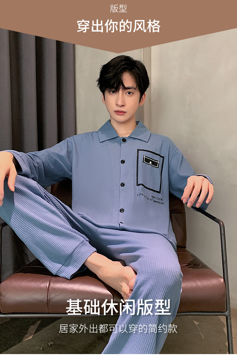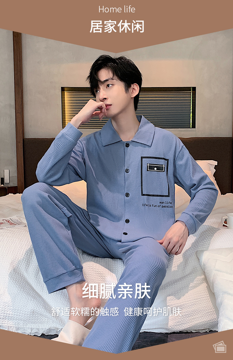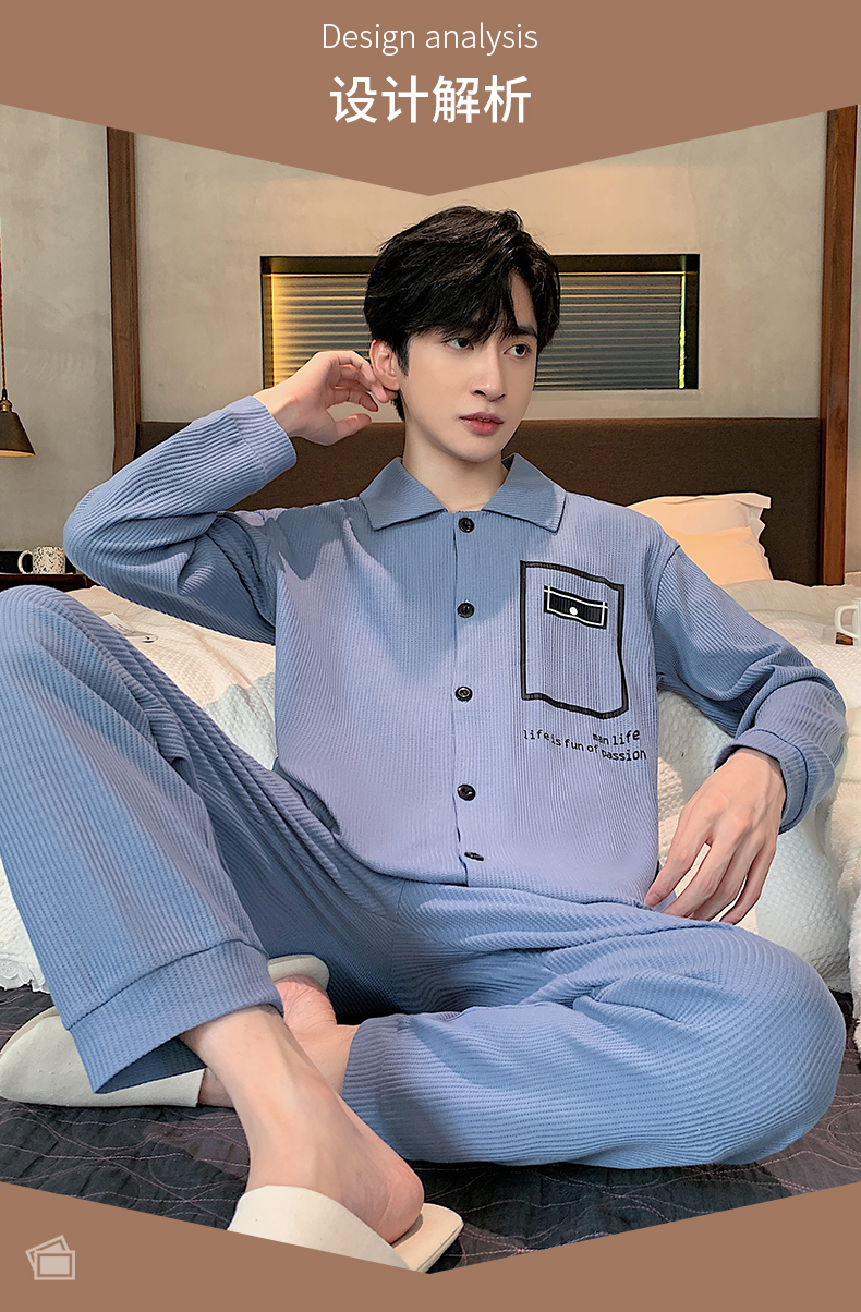 春秋季新款纯棉休闲简约睡衣高级质量家居服夏季男士宽松舒适睡衣翻领 89250