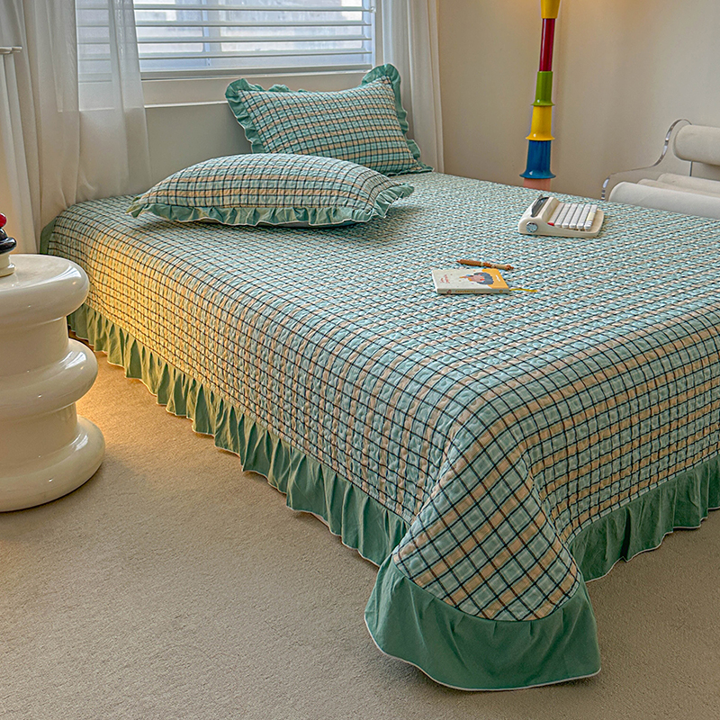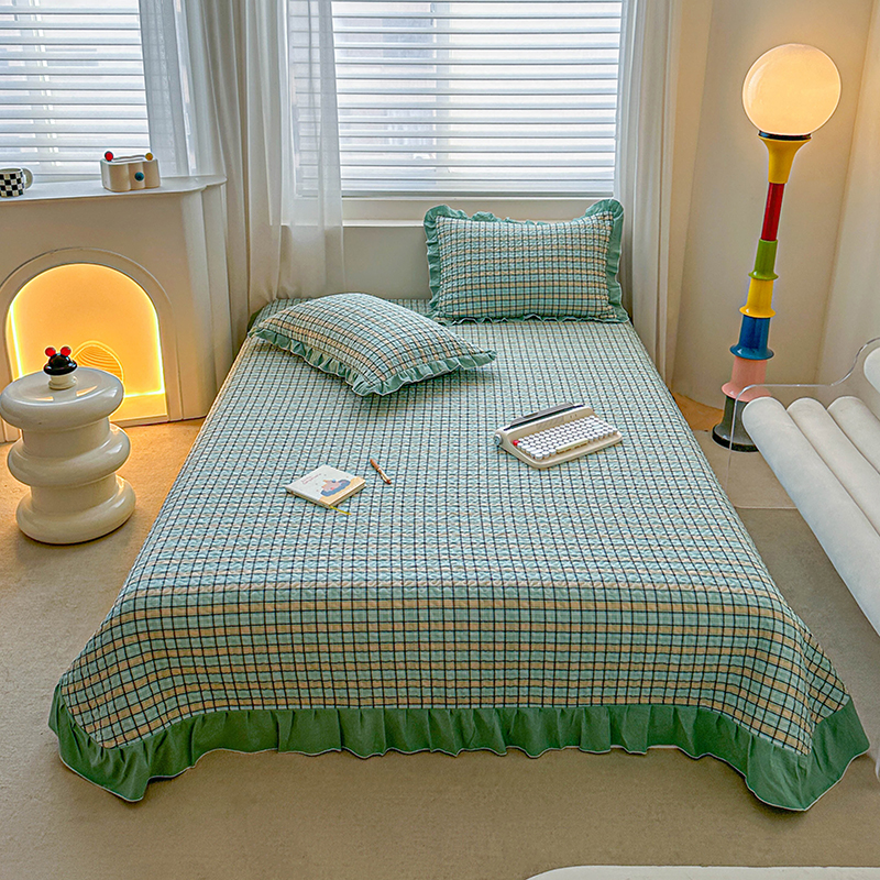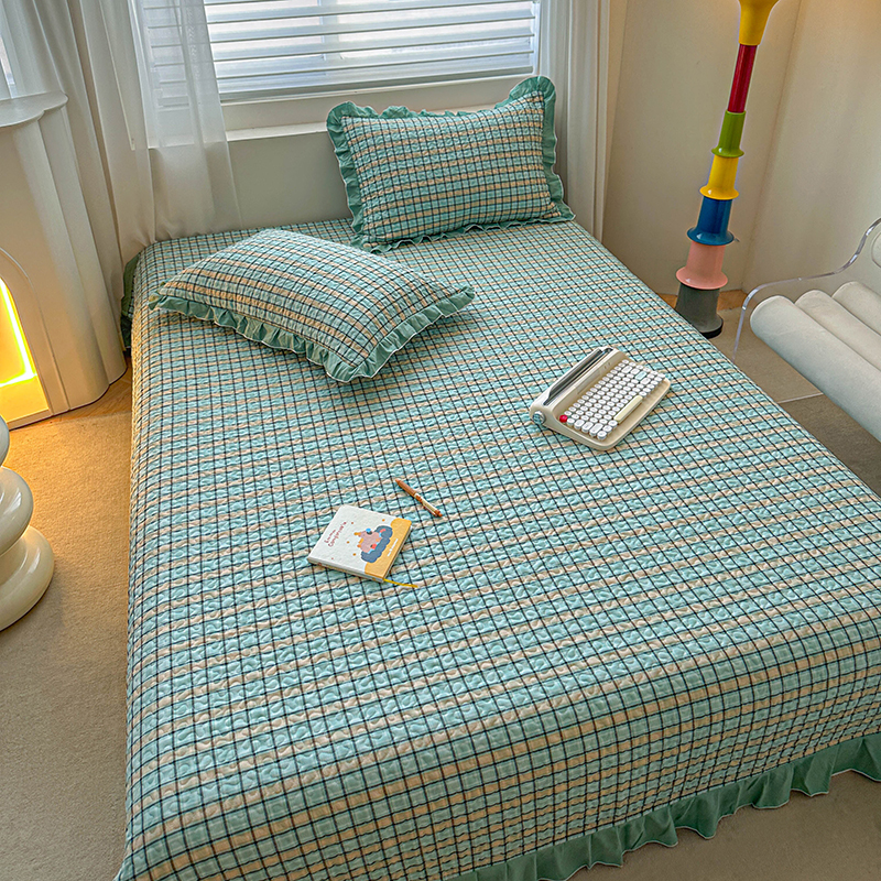 (总)源舜家纺 2025新款色织棉简约韩系花边床盖三件套,简约灰,简约粉,简约绿,简约驼,简约蓝