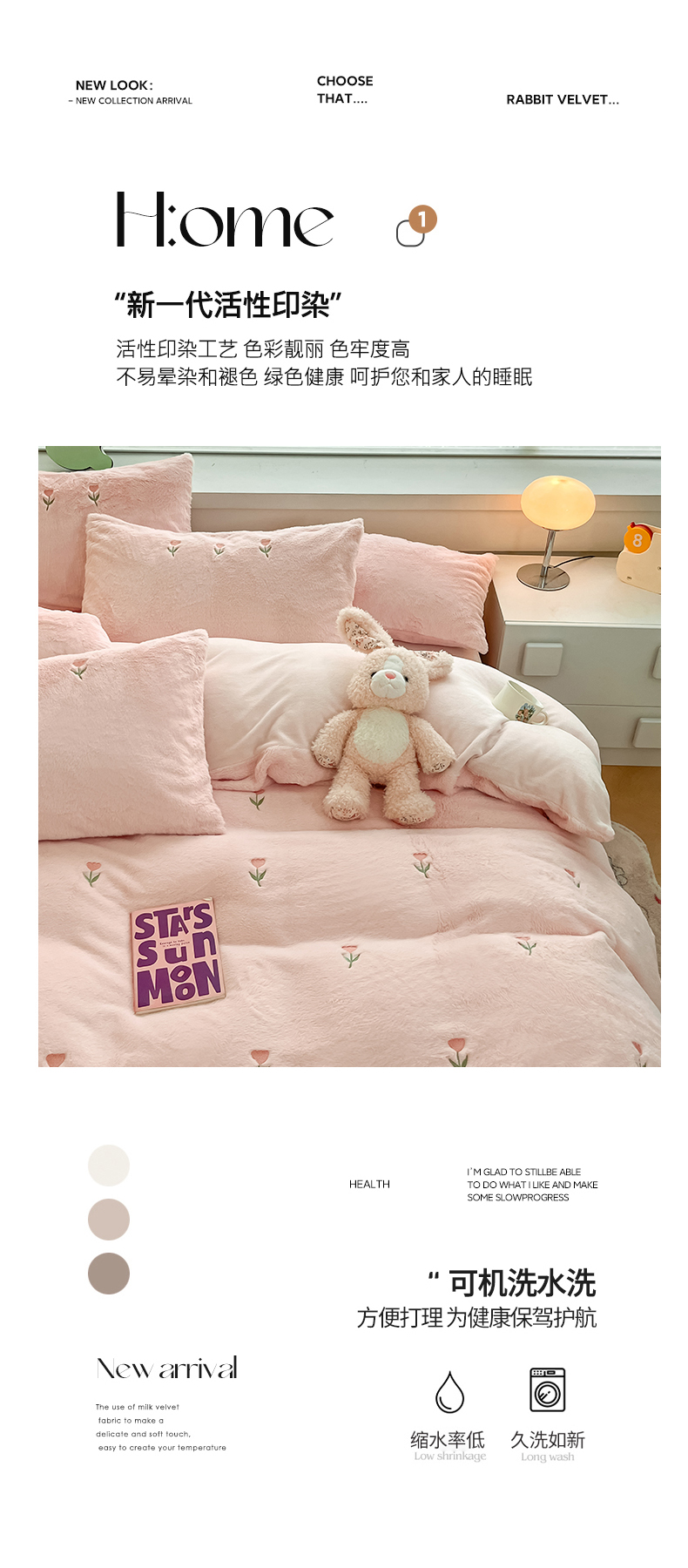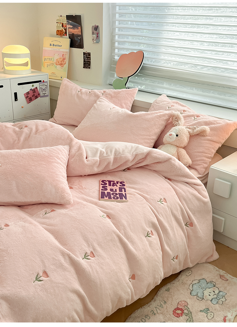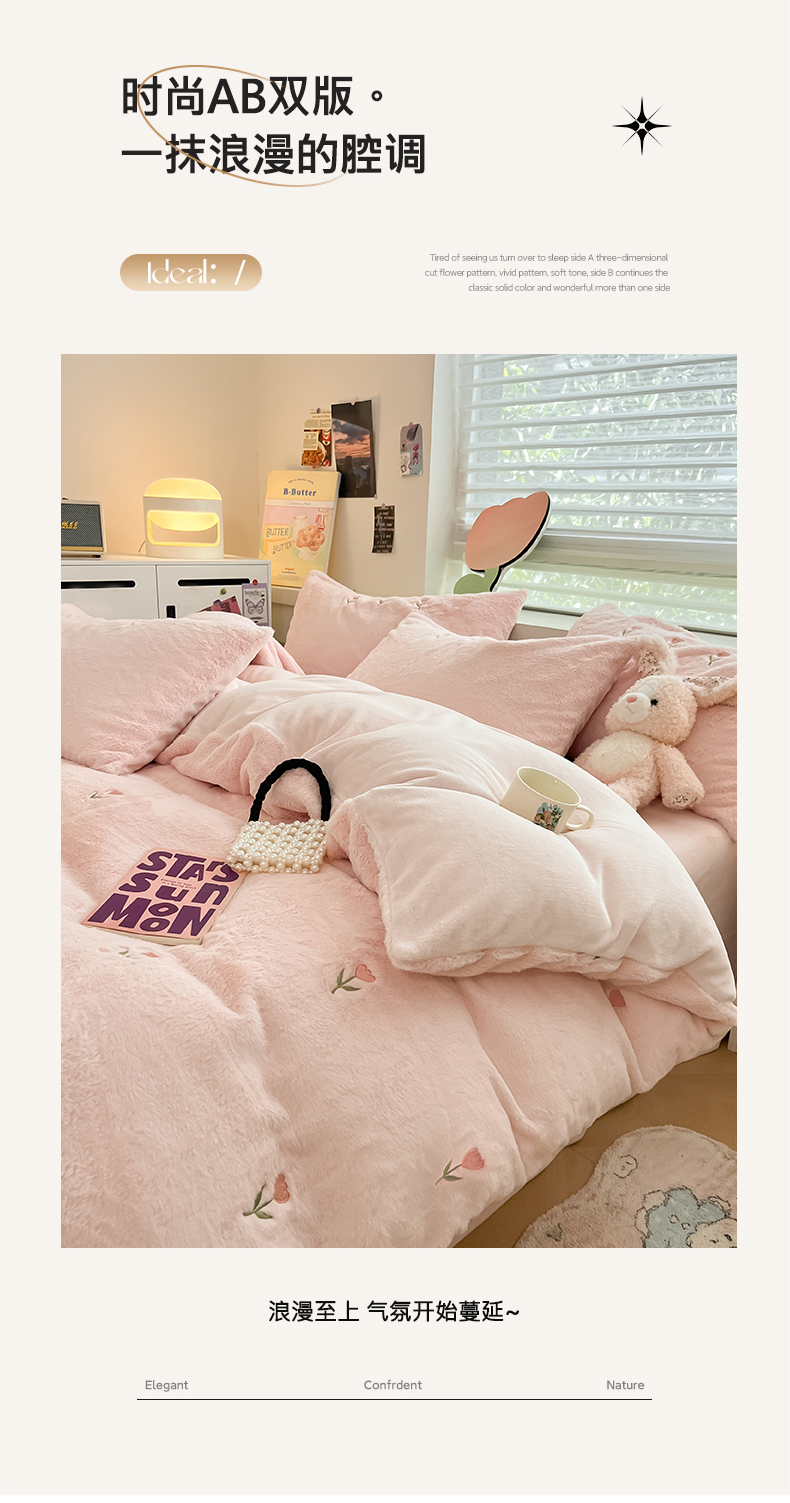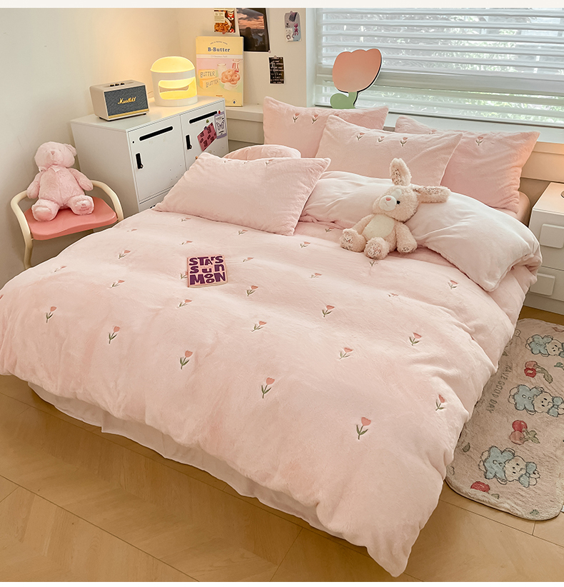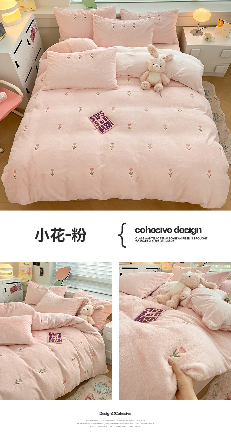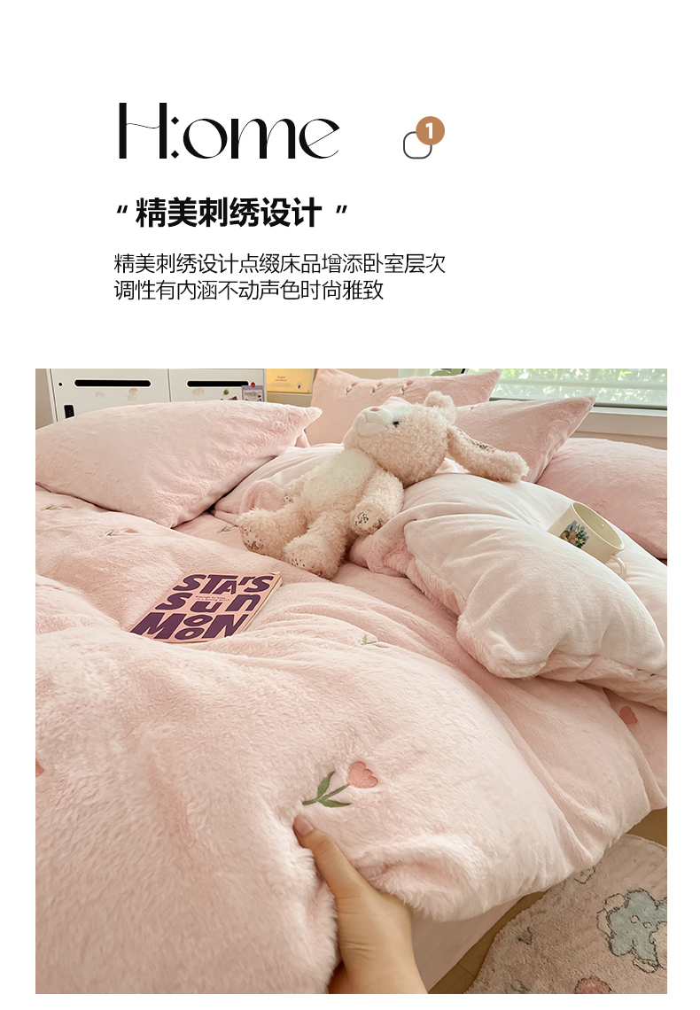 当前位置: 91家纺网 > 商品网购 > 床品套件 > 四件套 > 牛奶绒四件套 > 蜜柚 2024新款牛奶绒兔毛绒高克重小清新满版绣花四件套 花朵浅粉
