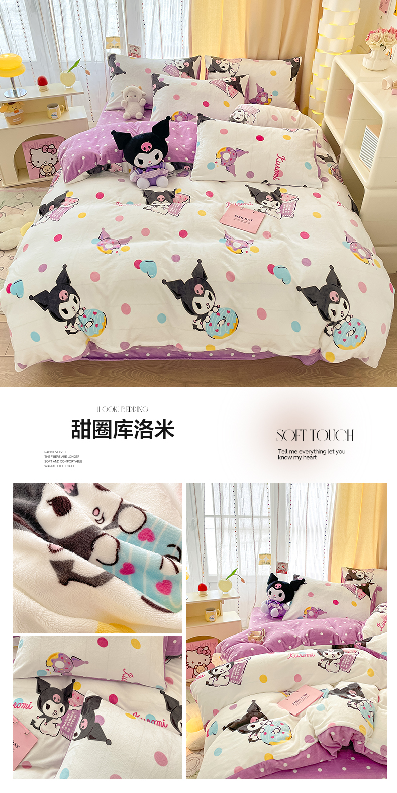 当前位置: 91家纺网 > 商品网购 > 床品套件 > 四件套 > 牛奶绒四件套 > 2024新款三丽鸥牛奶绒小版四件套 甜圈库洛米