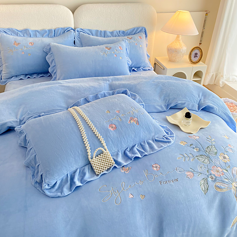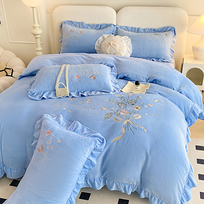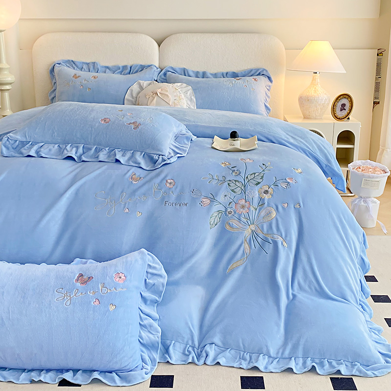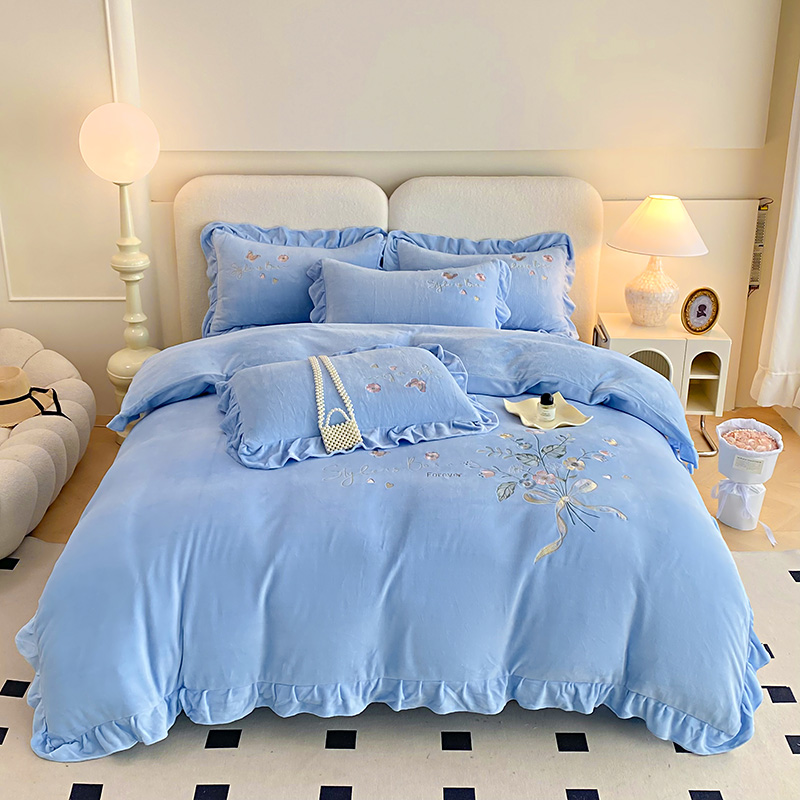 航途席业 2025新款高克重牛奶绒刺绣四件套-浪漫满屋 浪漫满屋-天空蓝