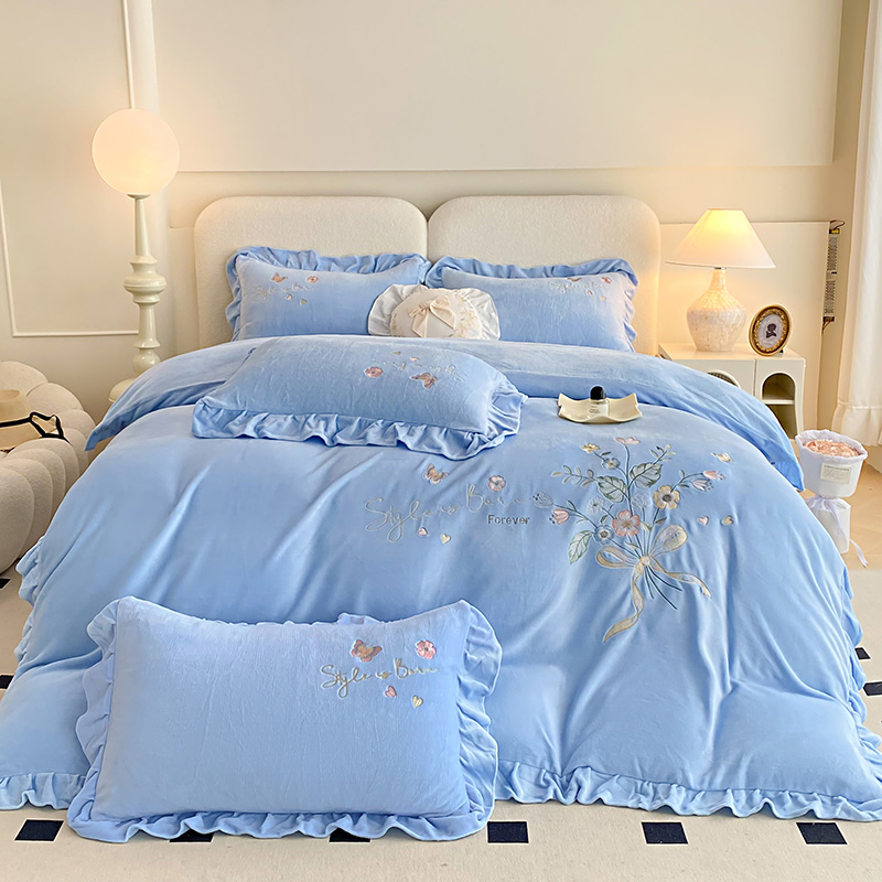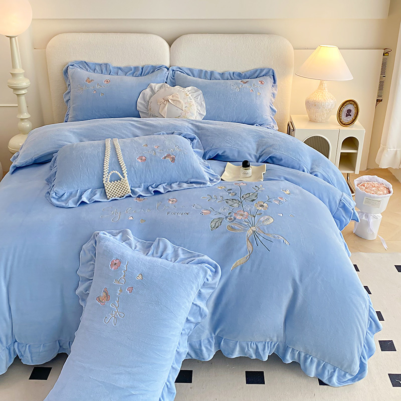 商品名称:航途席业 2025新款高克重牛奶绒刺绣四件套-浪漫满屋 浪漫满屋-天空蓝
