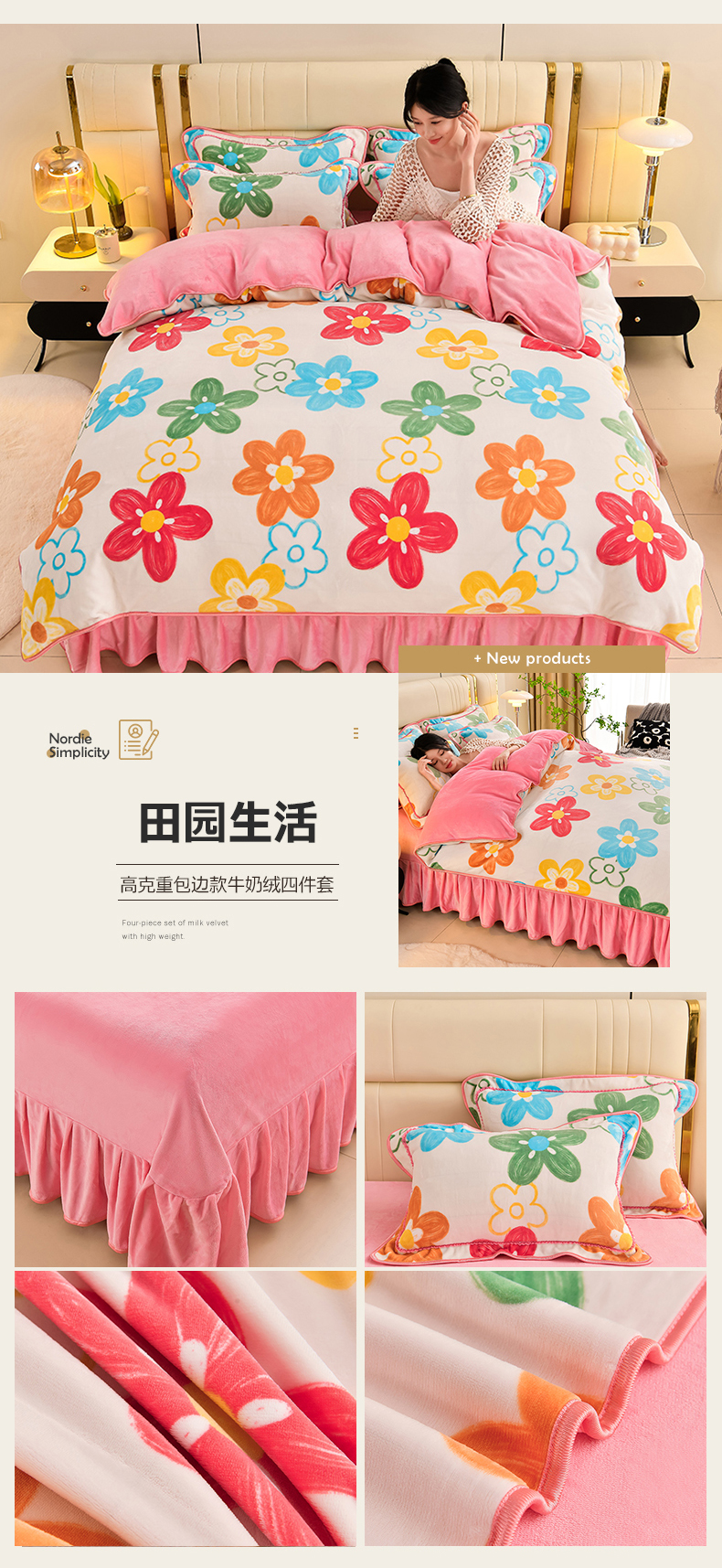 沐妍家纺 2025新款8斤加厚保暖金貂绒牛奶绒印花四件套 田园生活