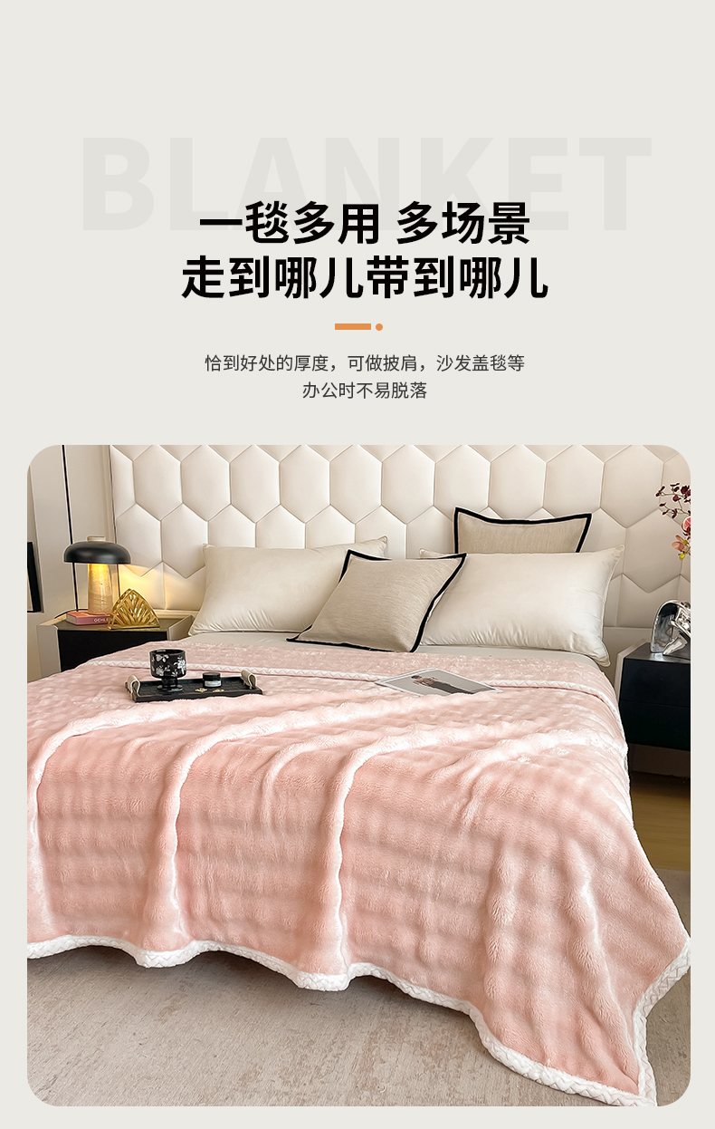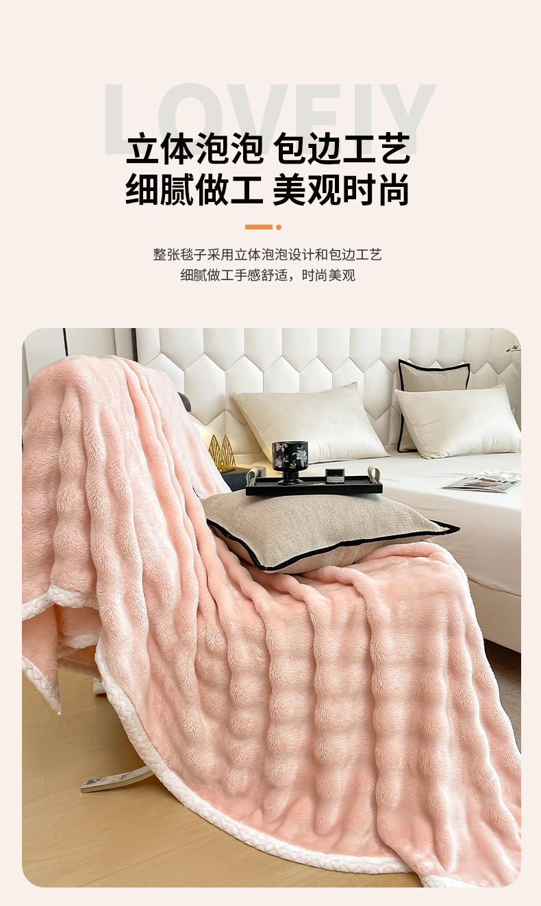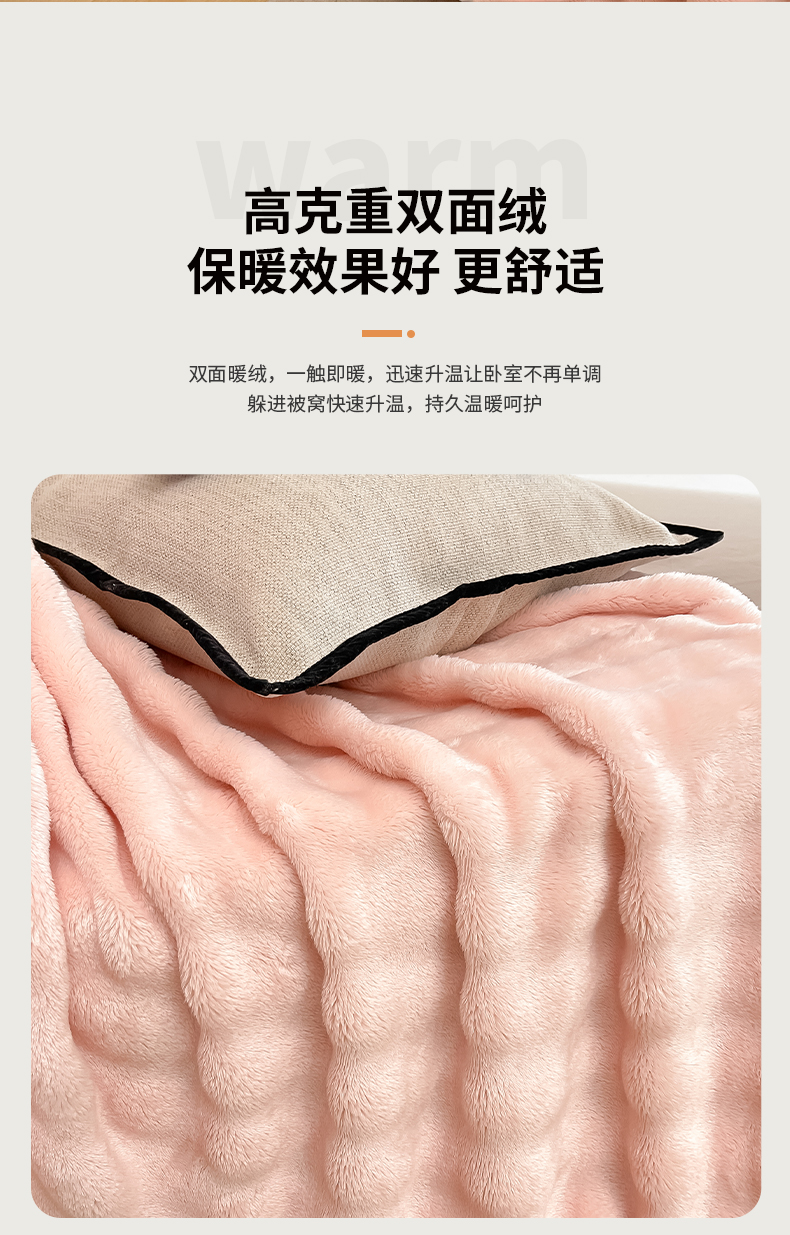 商品名称:梵克保罗 2024新款仿兔毛泡泡绒牛奶绒毛毯盖毯包边毛毯 粉色