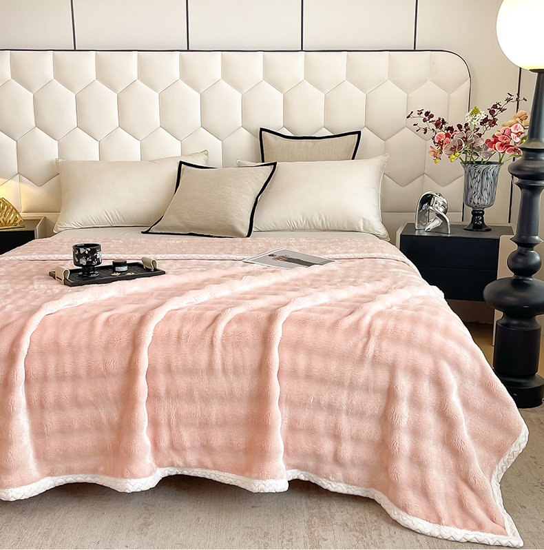 梵克保罗 2024新款仿兔毛泡泡绒牛奶绒毛毯盖毯包边毛毯 粉色