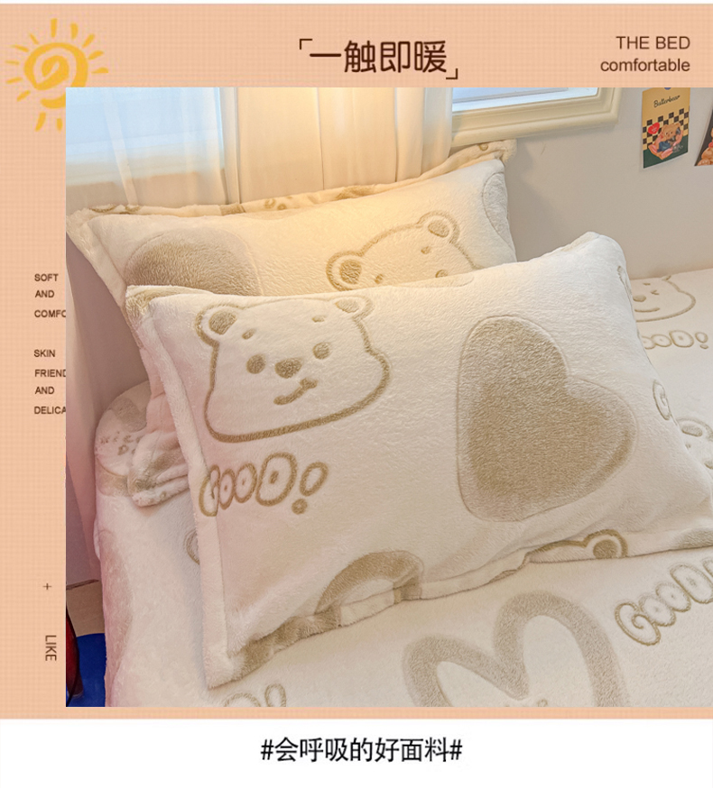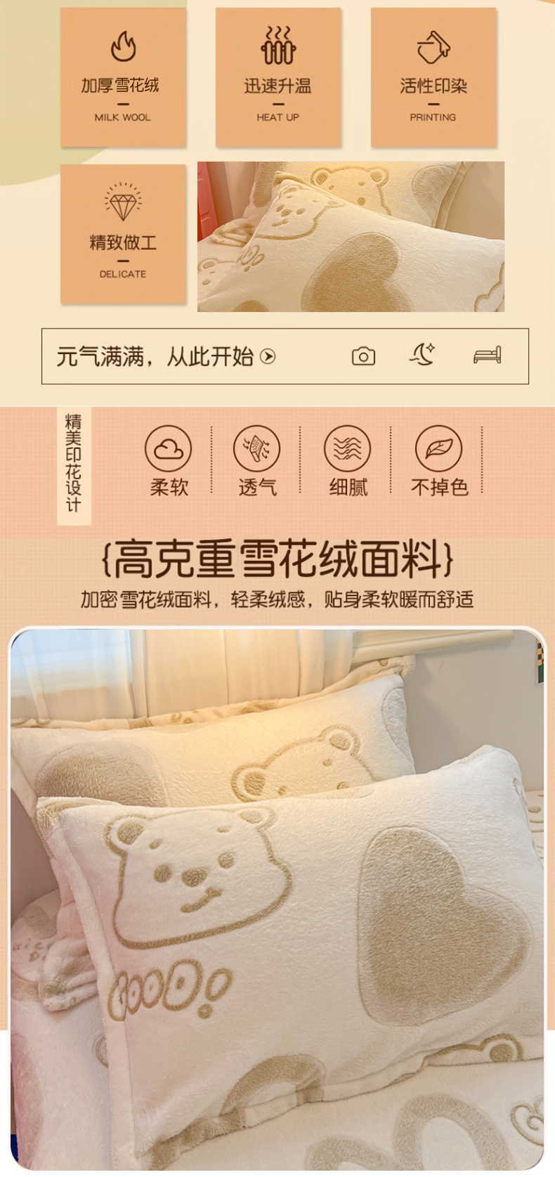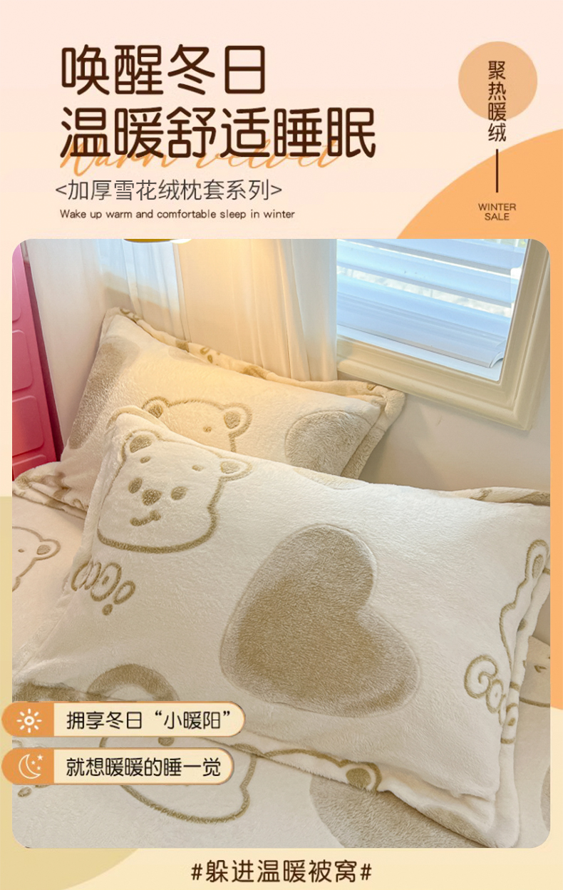 韩巢家纺 2024新款雪花绒枕套一对装 爱心熊(绿)