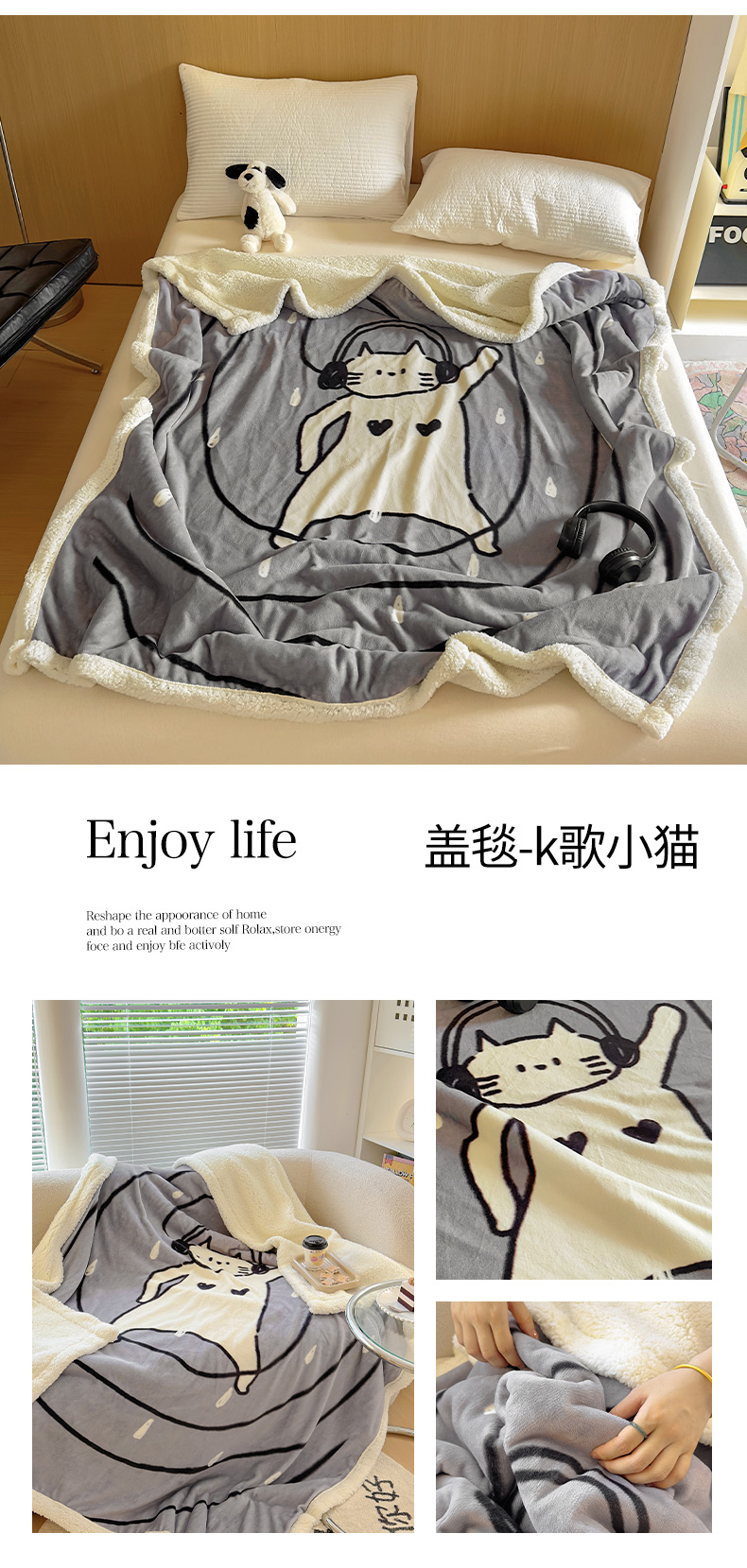 商品名称:山茶家纺 2024新款多功能羊羔绒双层大版牛奶绒盖毯 盖毯-K歌小猫