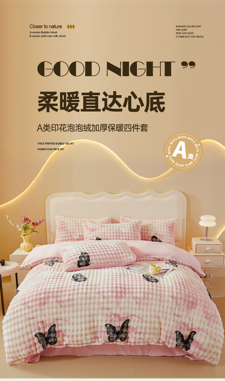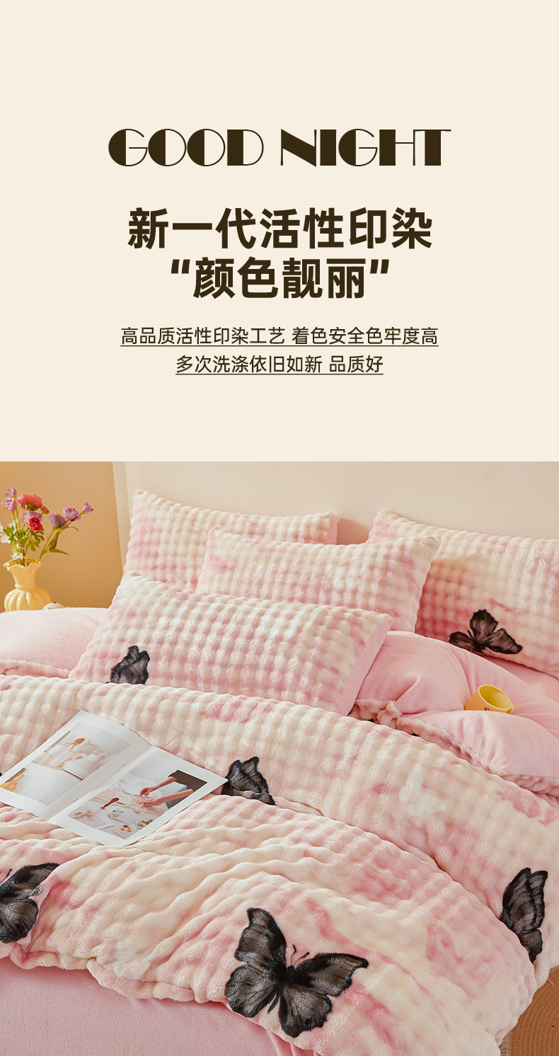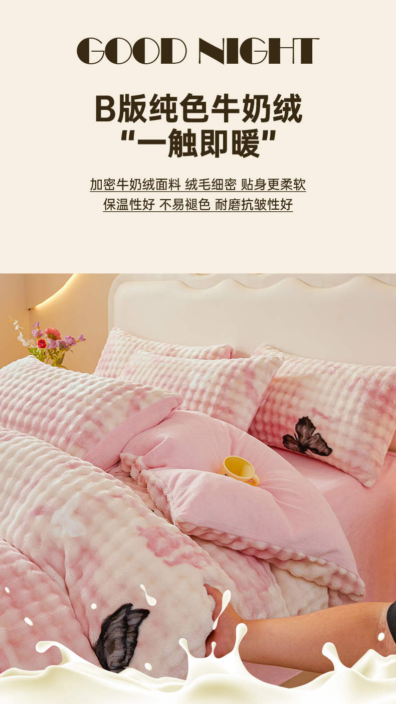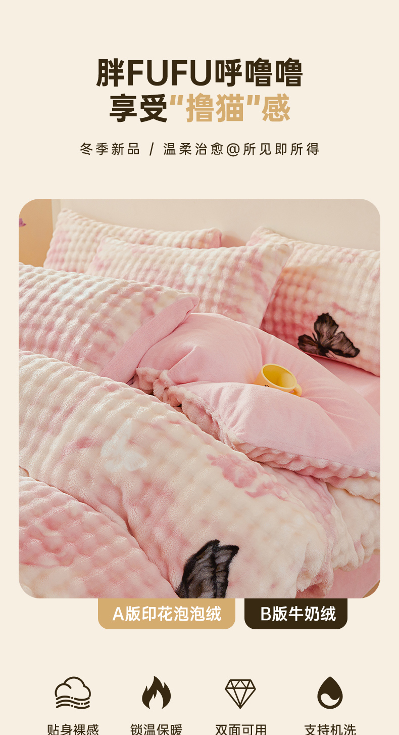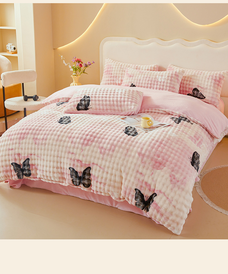 当前位置: 91家纺网 > 商品网购 > 床品套件 > 四件套 > 牛奶绒四件套 > 巧格家纺 2025新款A类加厚泡泡牛奶绒印花工艺立体泡泡四件套(买家秀联系商家) 蝶追花
