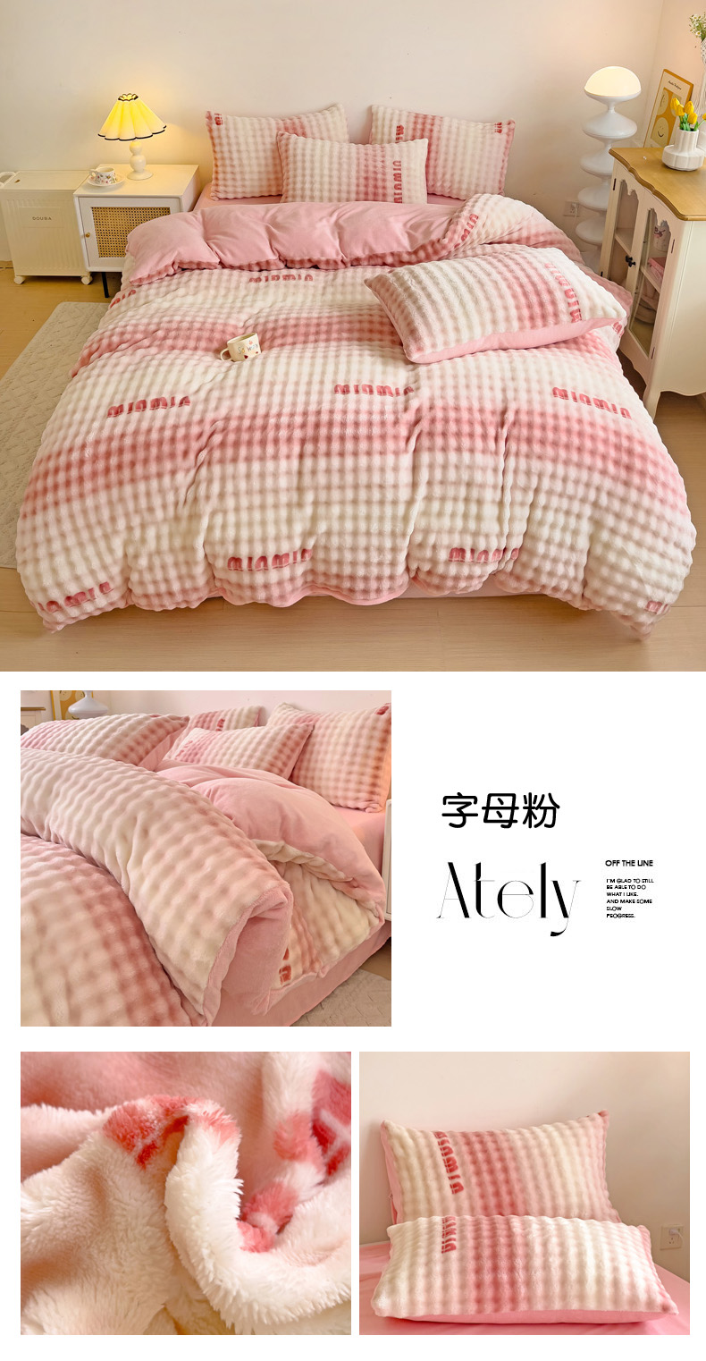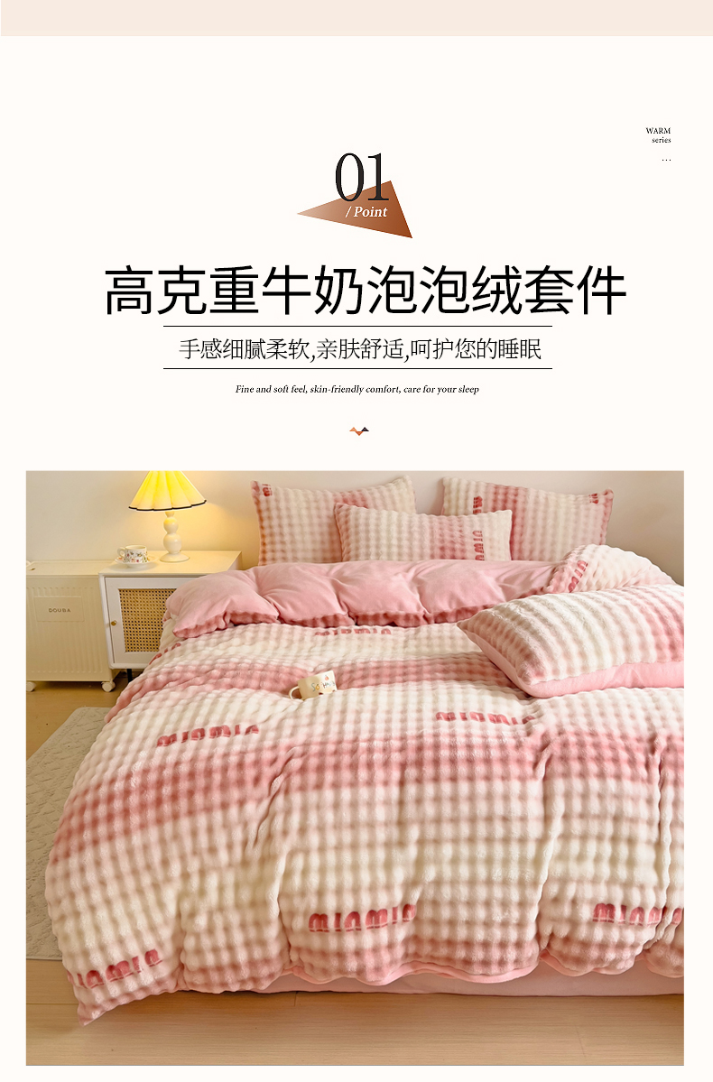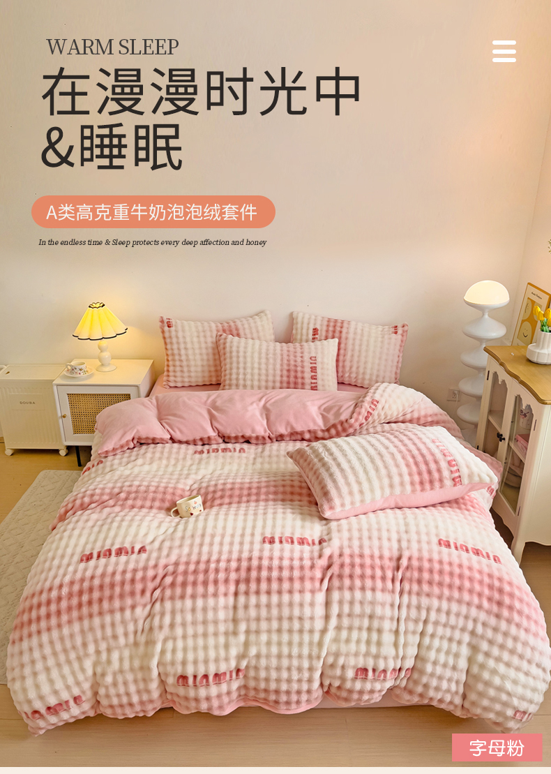 商品名称:金爱家 2024新款A类高克重云朵牛奶泡泡绒四件套 泡泡绒-字母粉