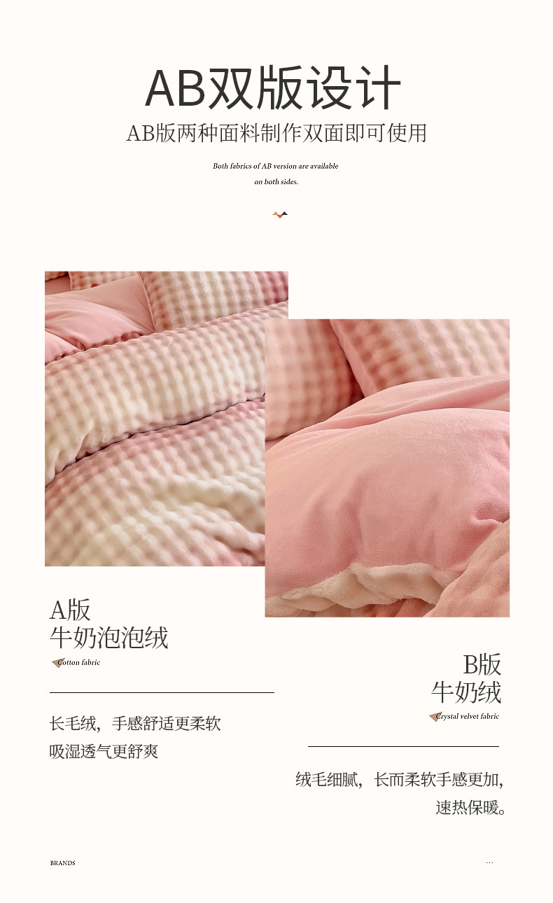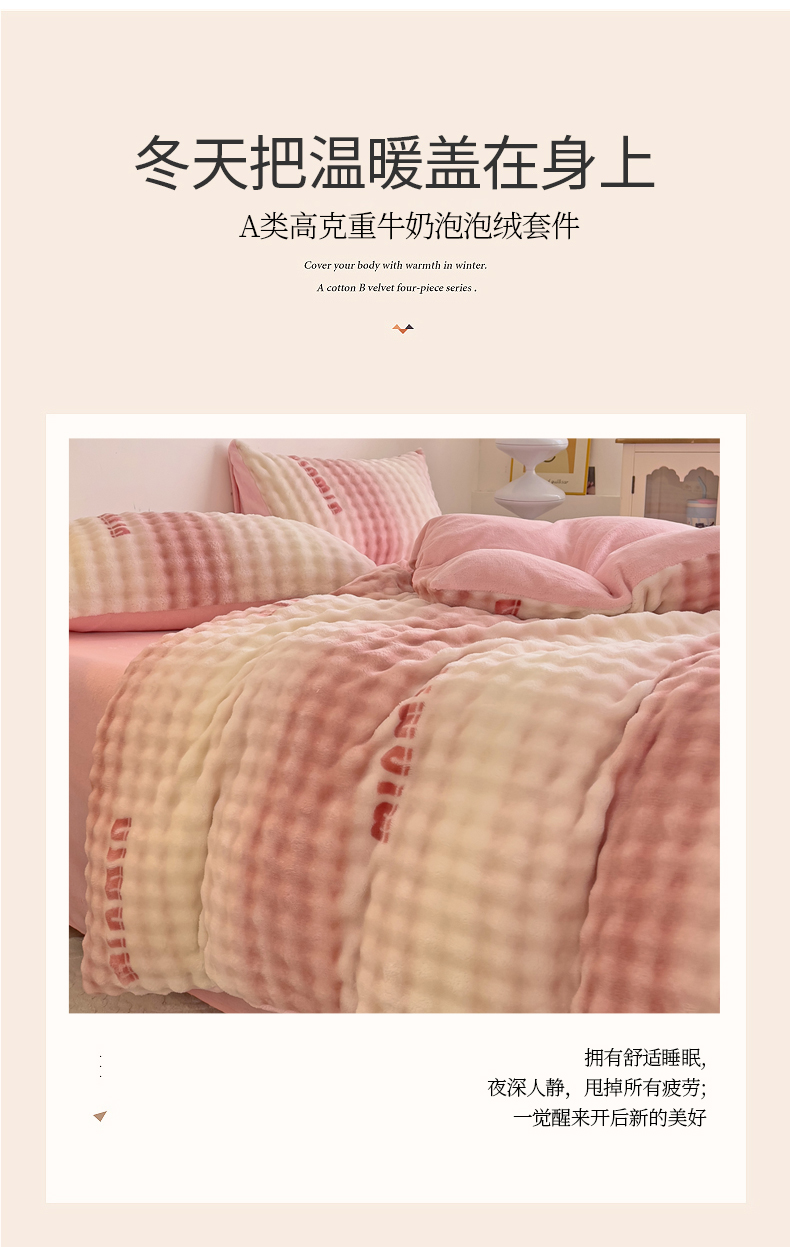 金爱家 2024新款A类高克重云朵牛奶泡泡绒四件套 泡泡绒-字母粉