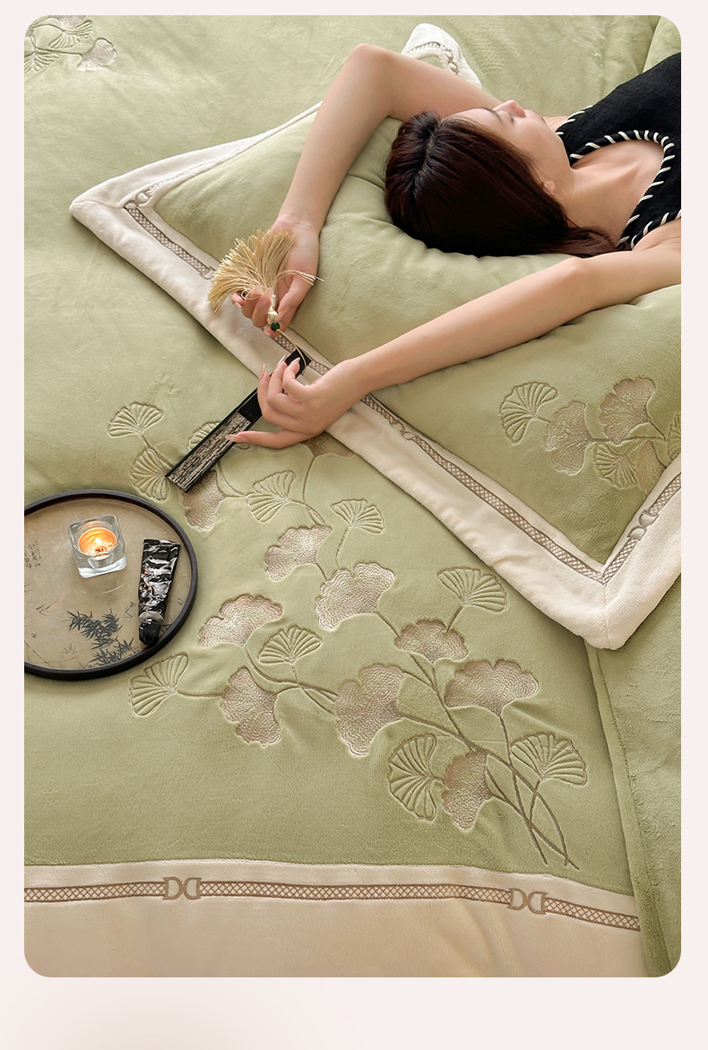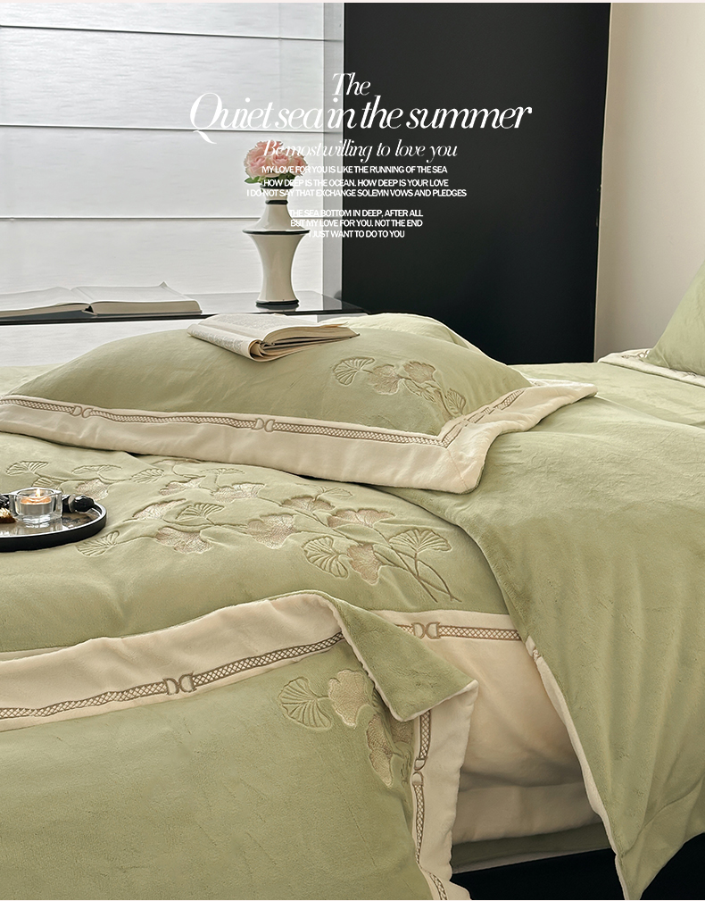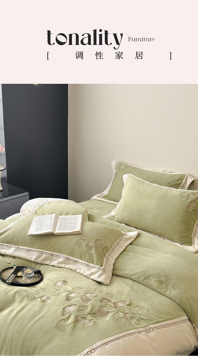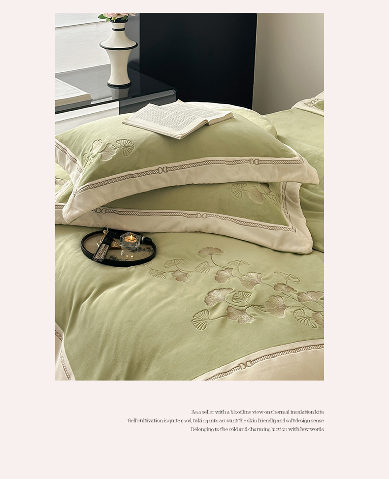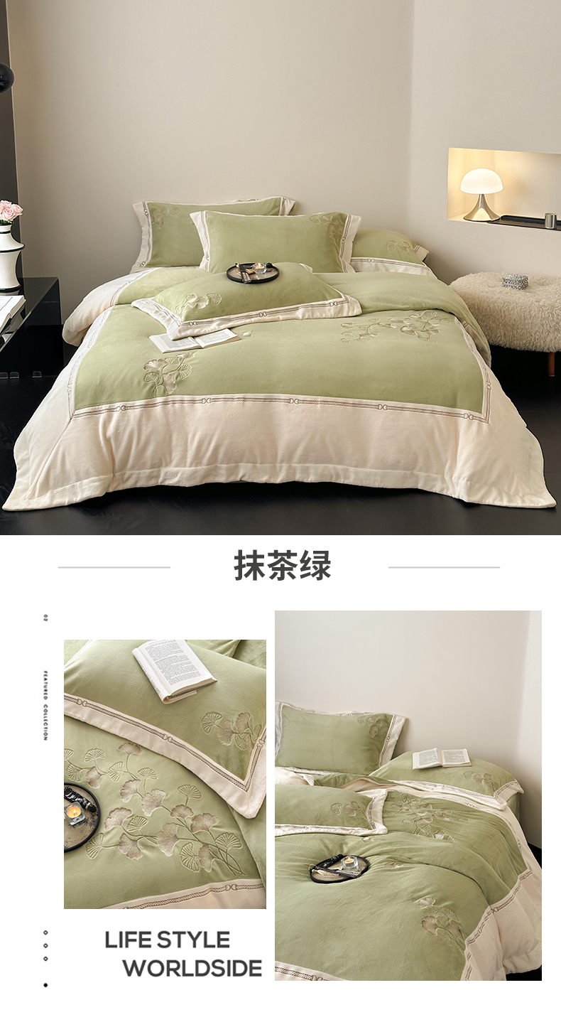 2024新款高克重牛奶绒绣花四件套-叶起华裳 抹茶绿