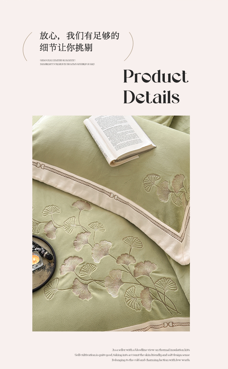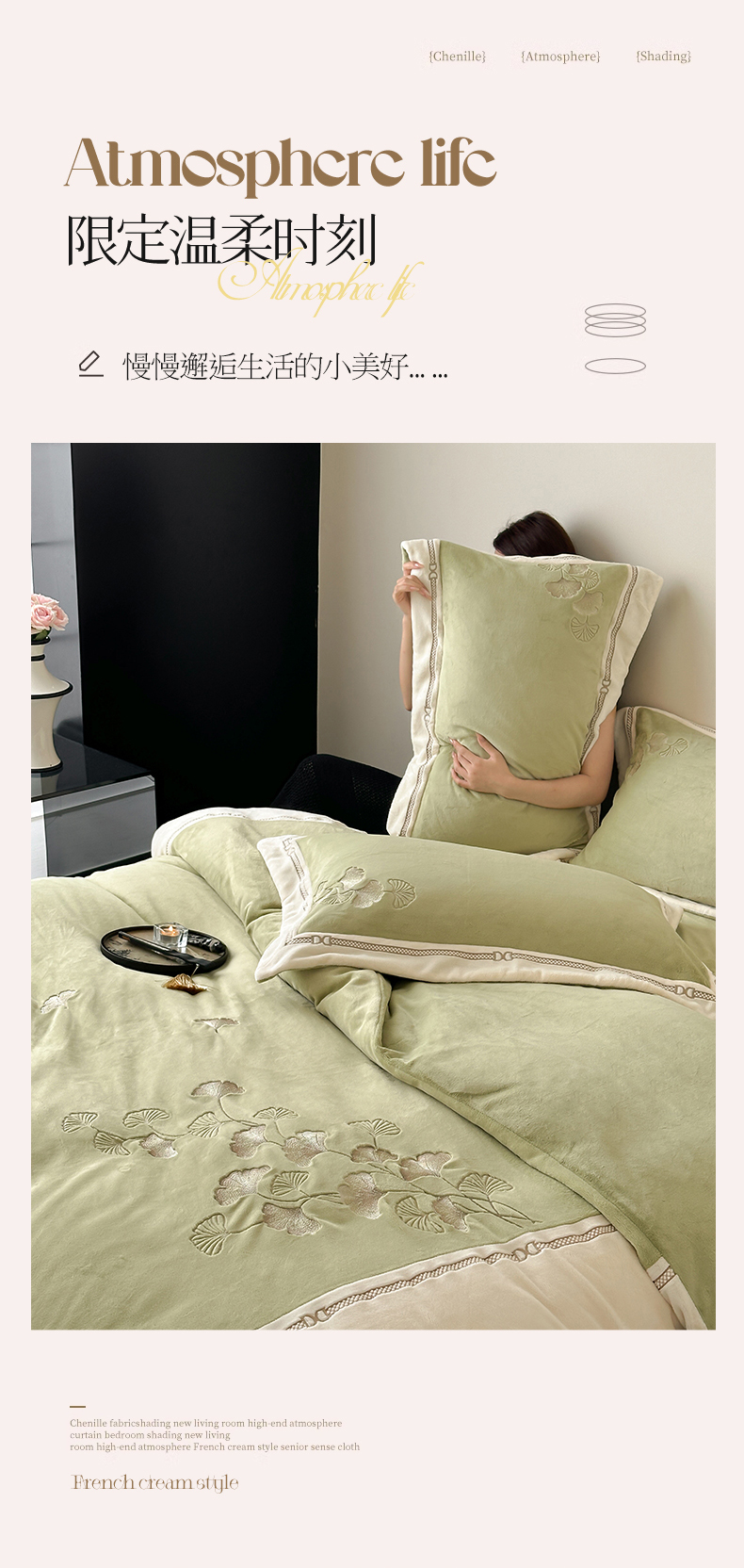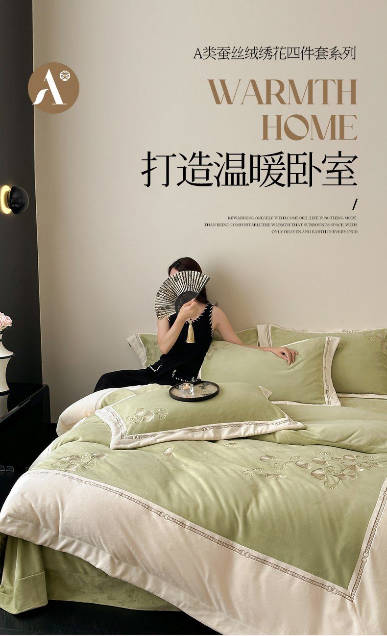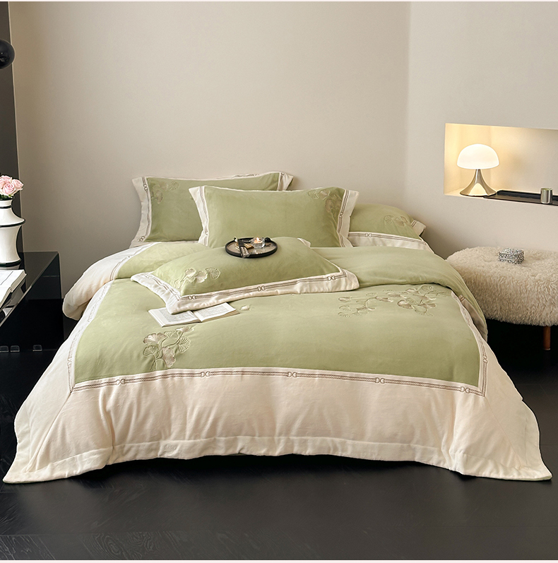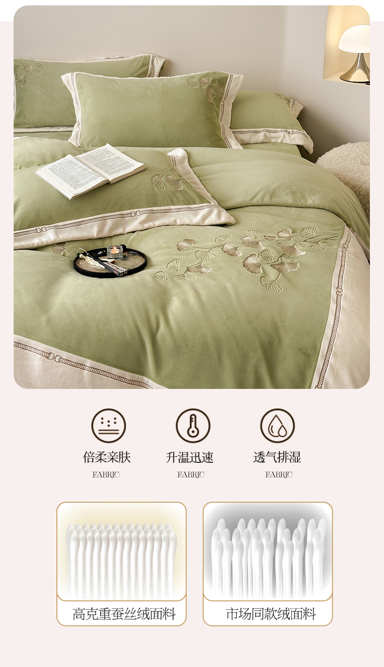 2024新款高克重牛奶绒绣花四件套-叶起华裳 抹茶绿