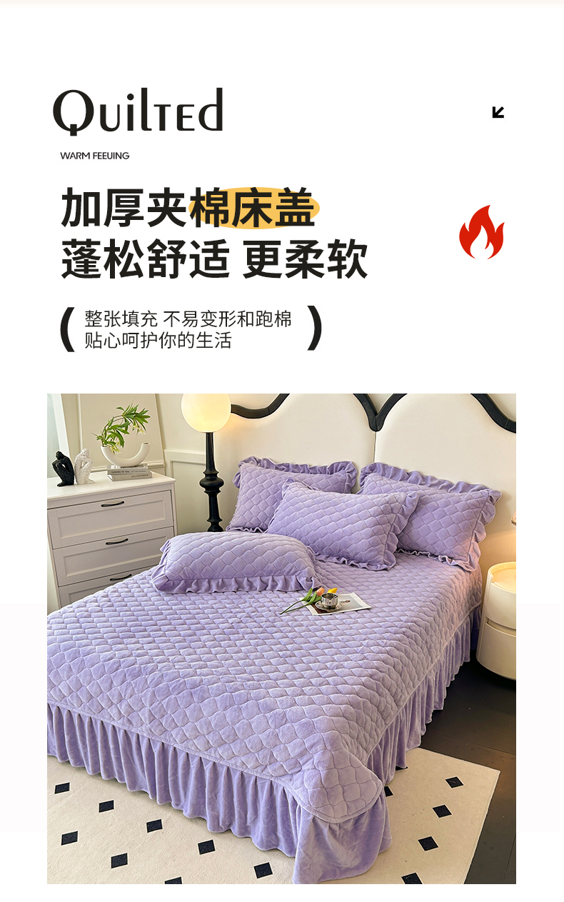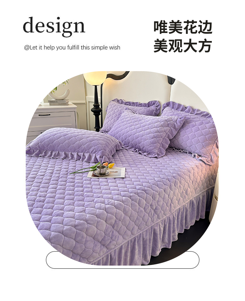 (总)屹成家纺2025新款水晶绒夹棉绗缝蕾丝床裙三件套(塞纳河畔)床裙单件起售价不低于105元,大红,豆沙,翡翠绿,粉玉,橄榄绿,蔚蓝,银灰