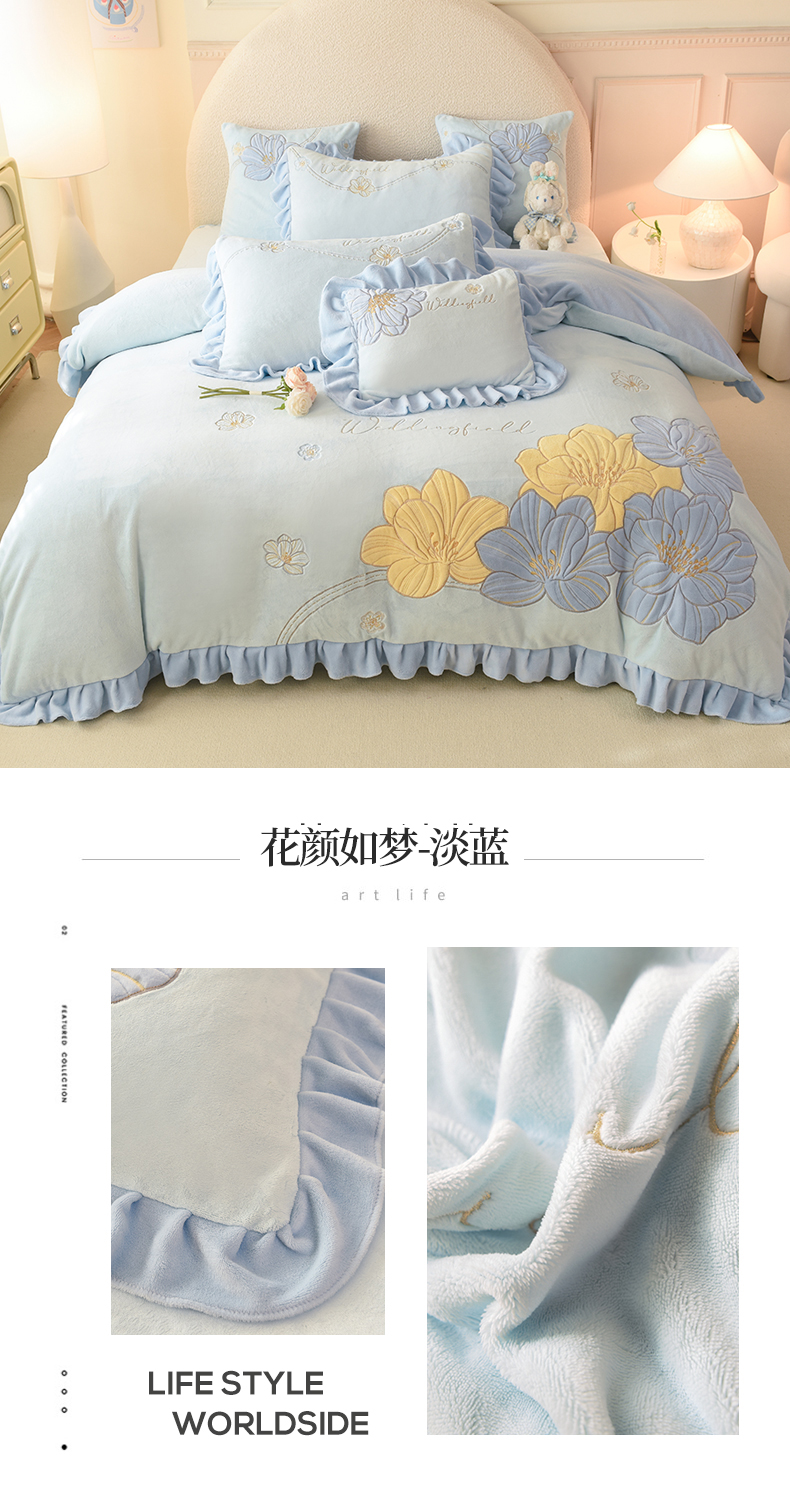 (总)绒棉世家 2025独家新款设计款高克重牛奶绒贴布绣四件套-花颜如梦系列,花颜如梦-淡蓝