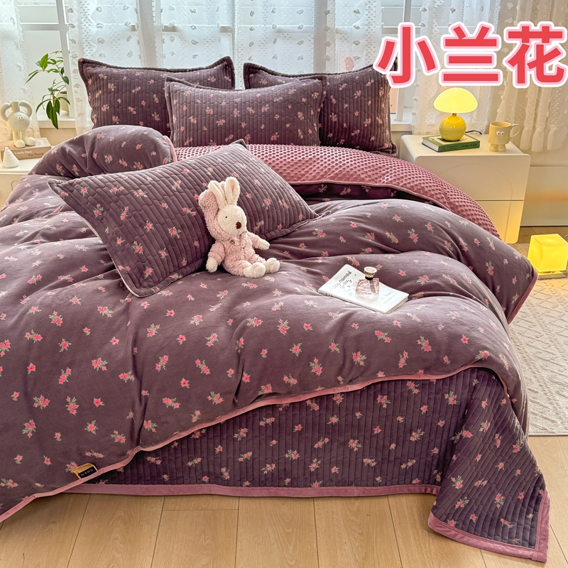 梦可莱家居 2024新款牛奶豆豆绒印花床盖四件套 小兰花